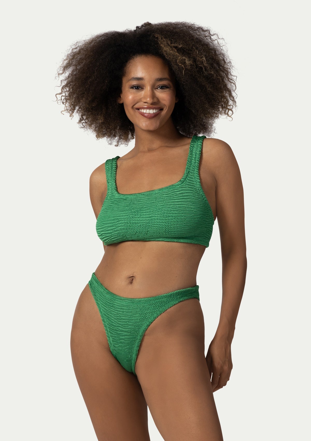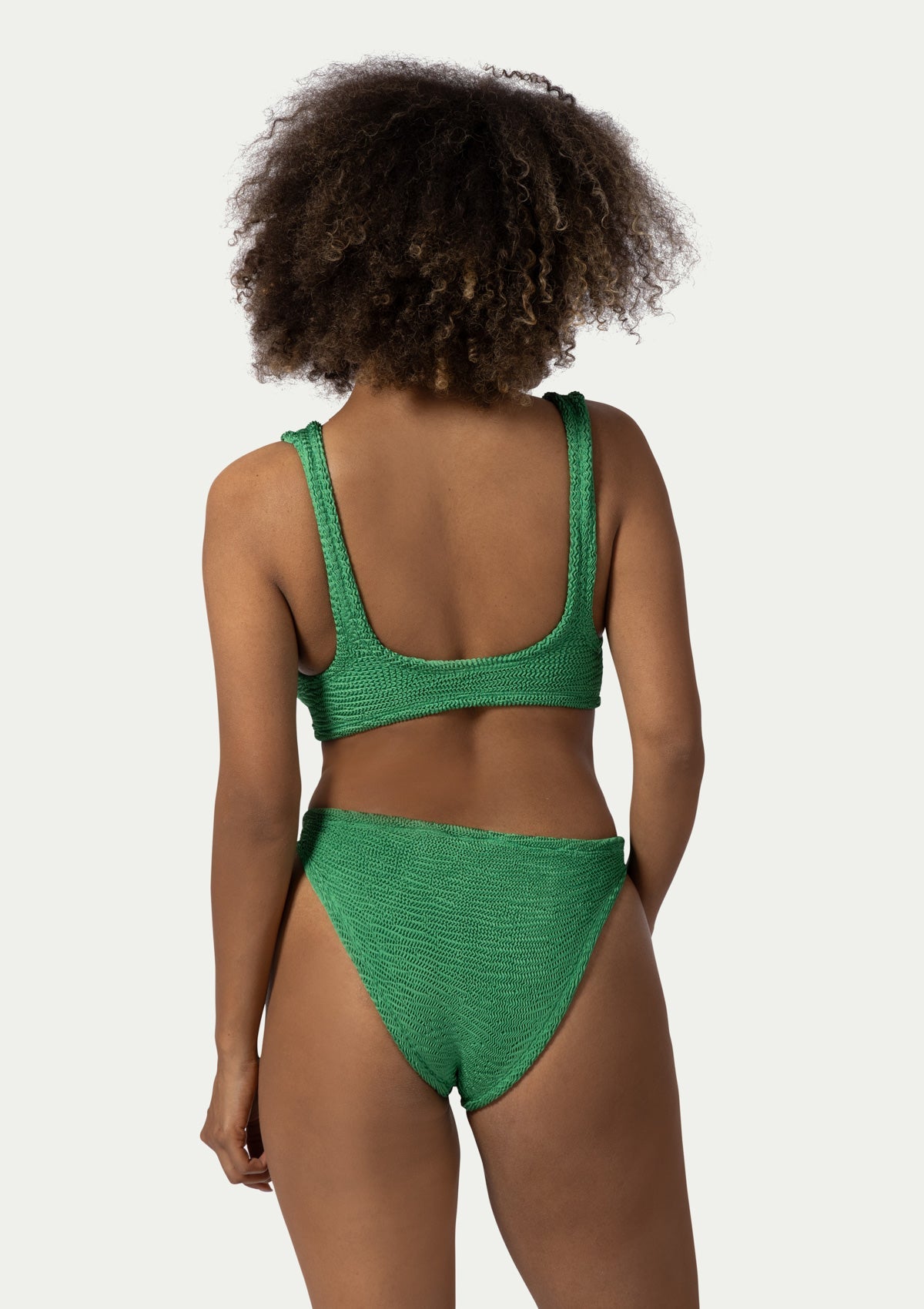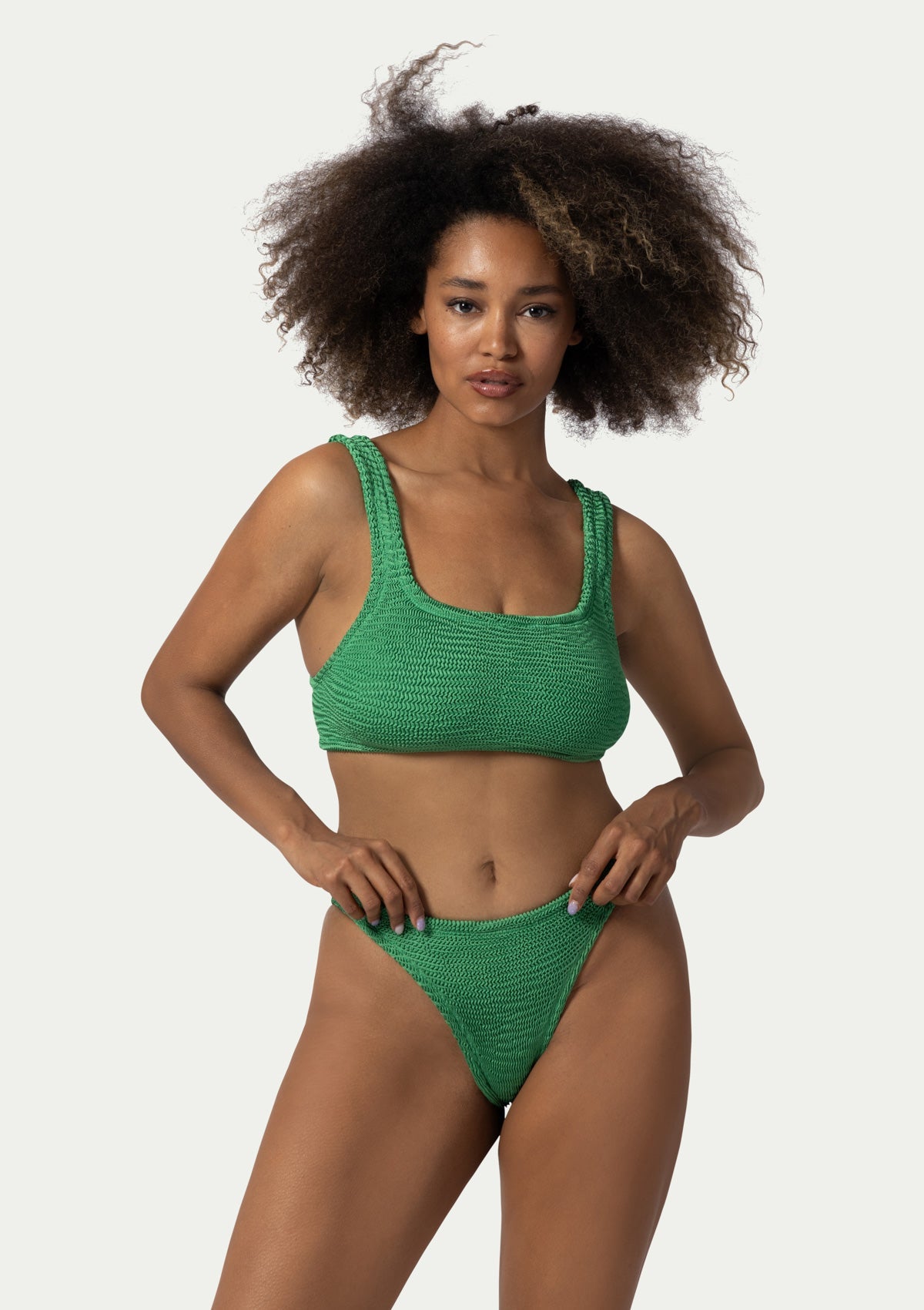 Two-piece EMILY EMERALD swimsuit by PARAMIDONNA. Designed in a universal size, it fits sizes XS to 2X. The top features a strappy sporty bustier, while the mid-cut, low-waisted bikini bottoms offer comfort and style. The EMILY model provides support, comfort, and extra coverage, making it a versatile and flattering choice for all body types.