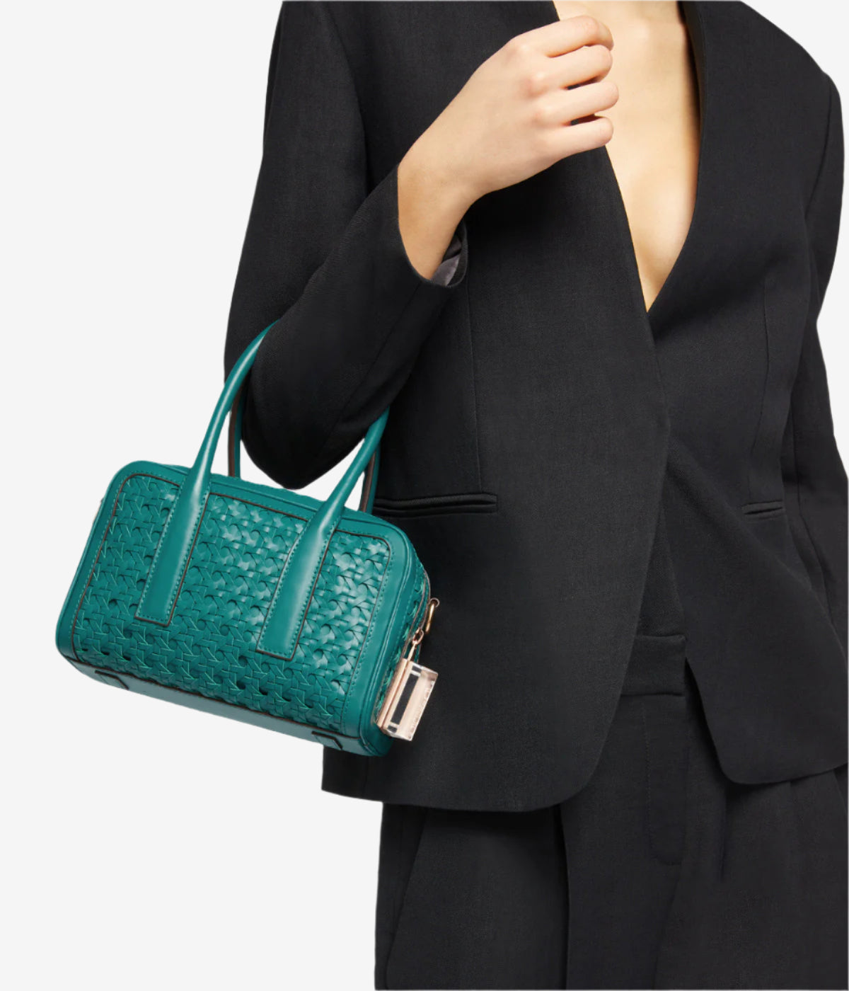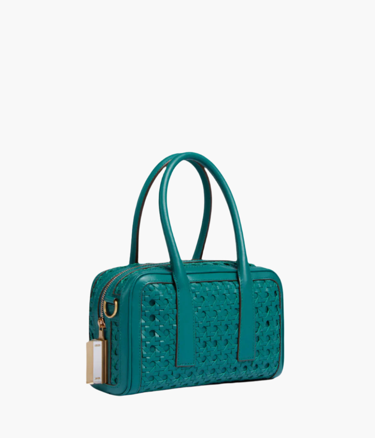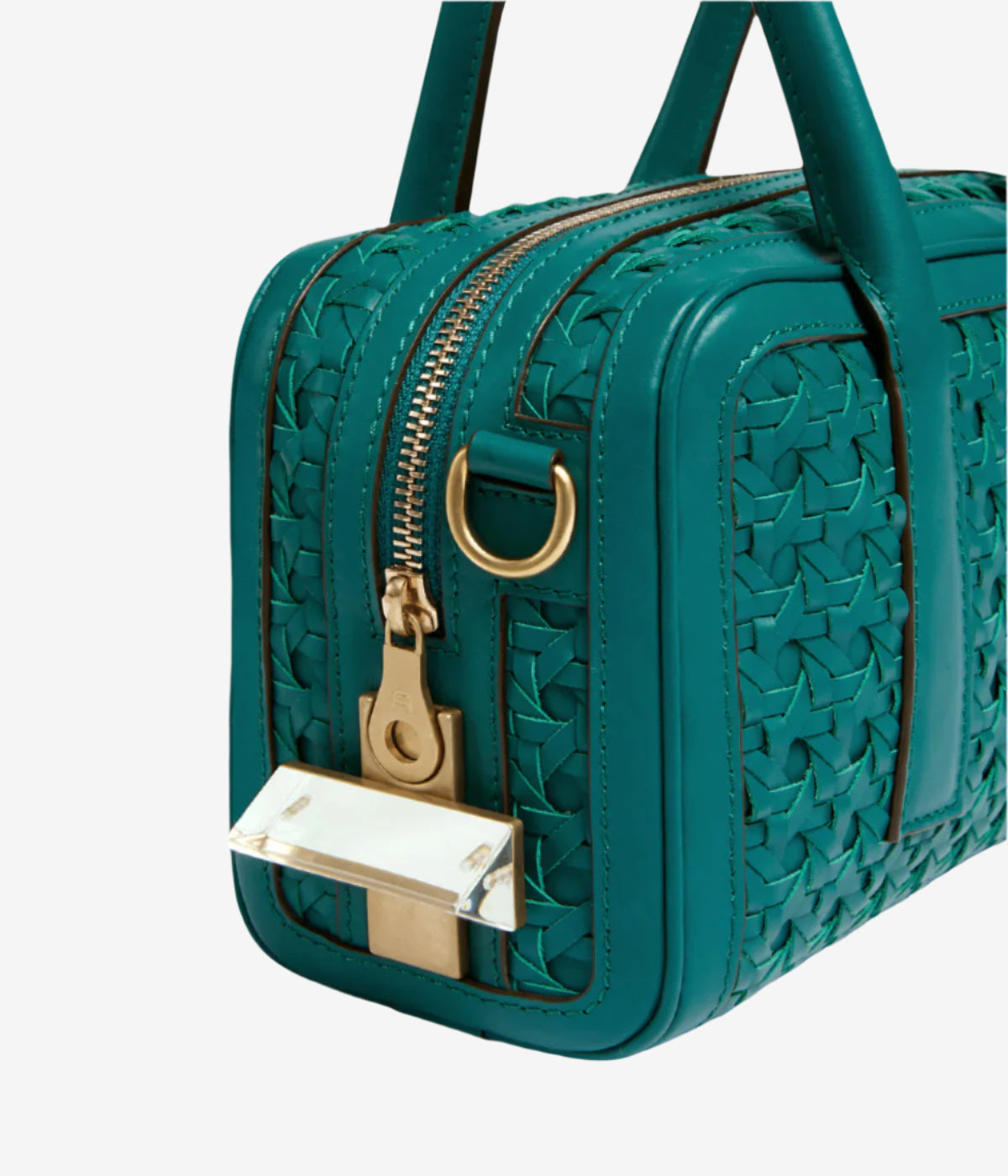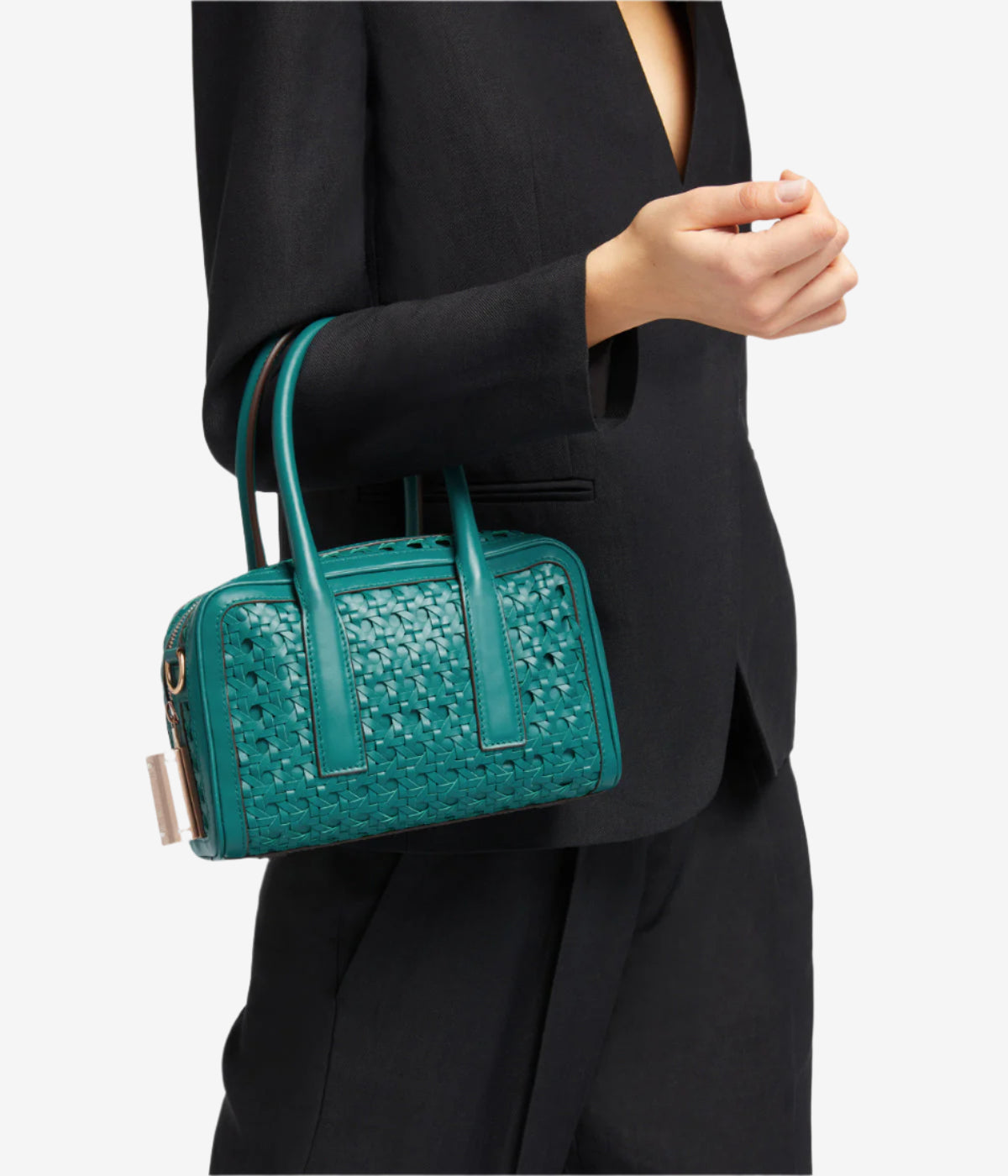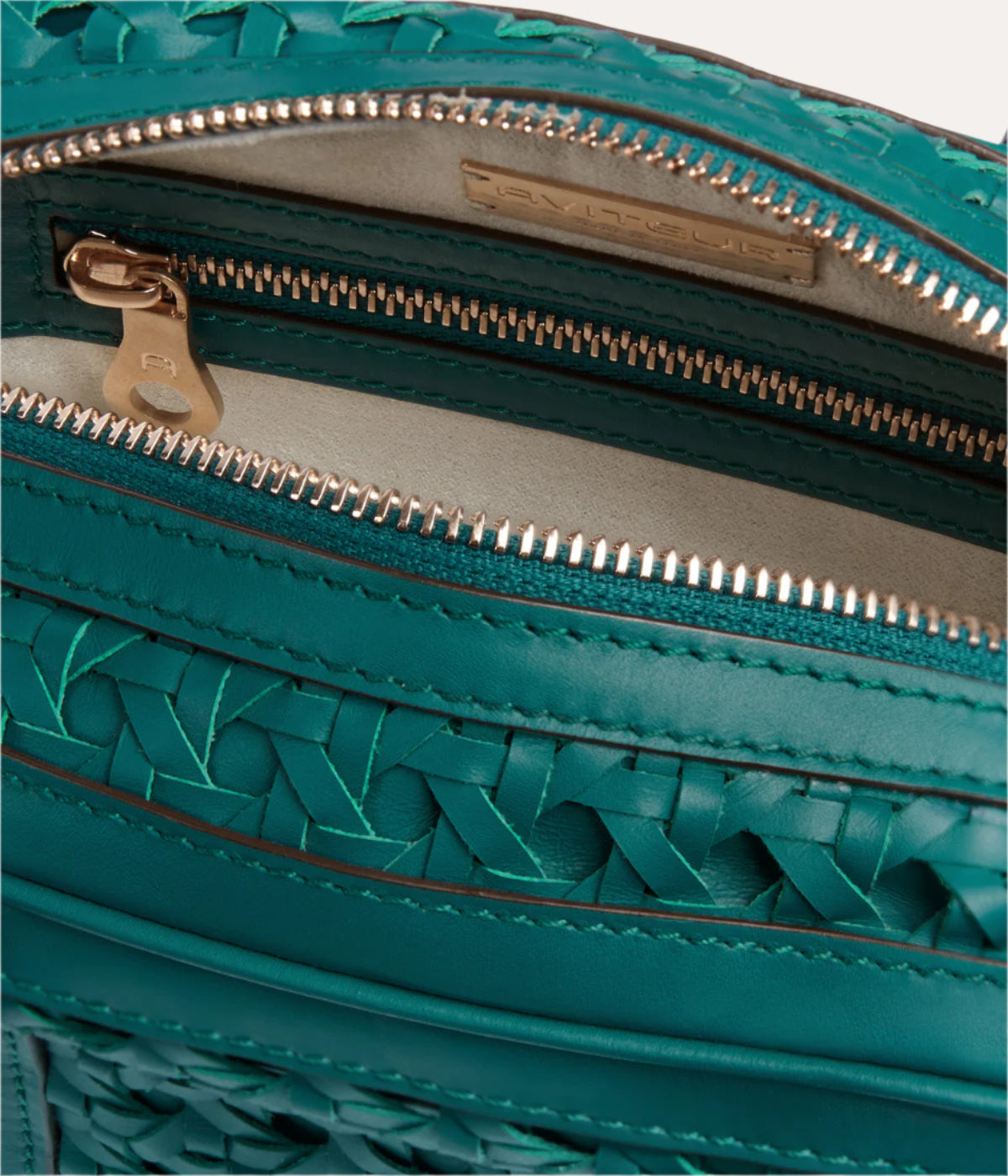 Crafted from soft, natural calfskin with an artisanal finish, this versatile handbag for day or night, carried over the shoulder, crossbody, or by hand. Timeless style featuring intreccio weave, open and zipped internal compartments, Aviteur prism clasp.