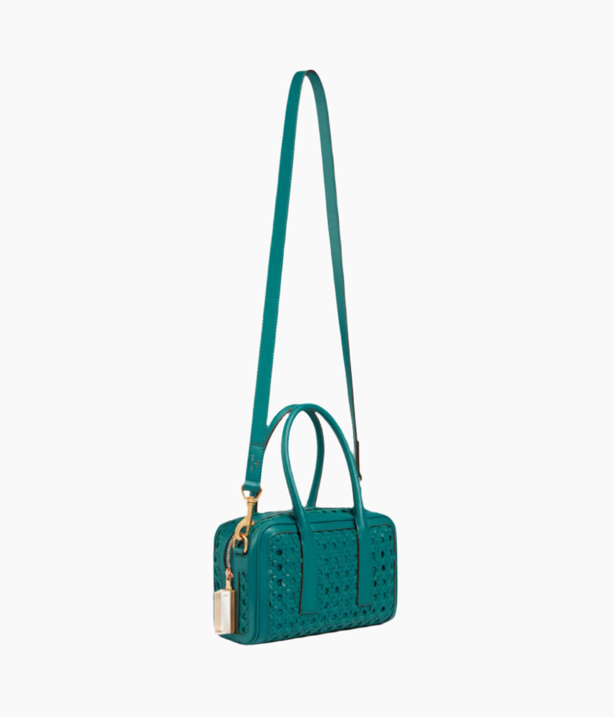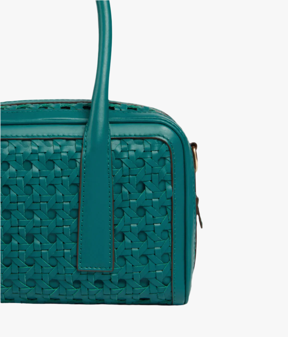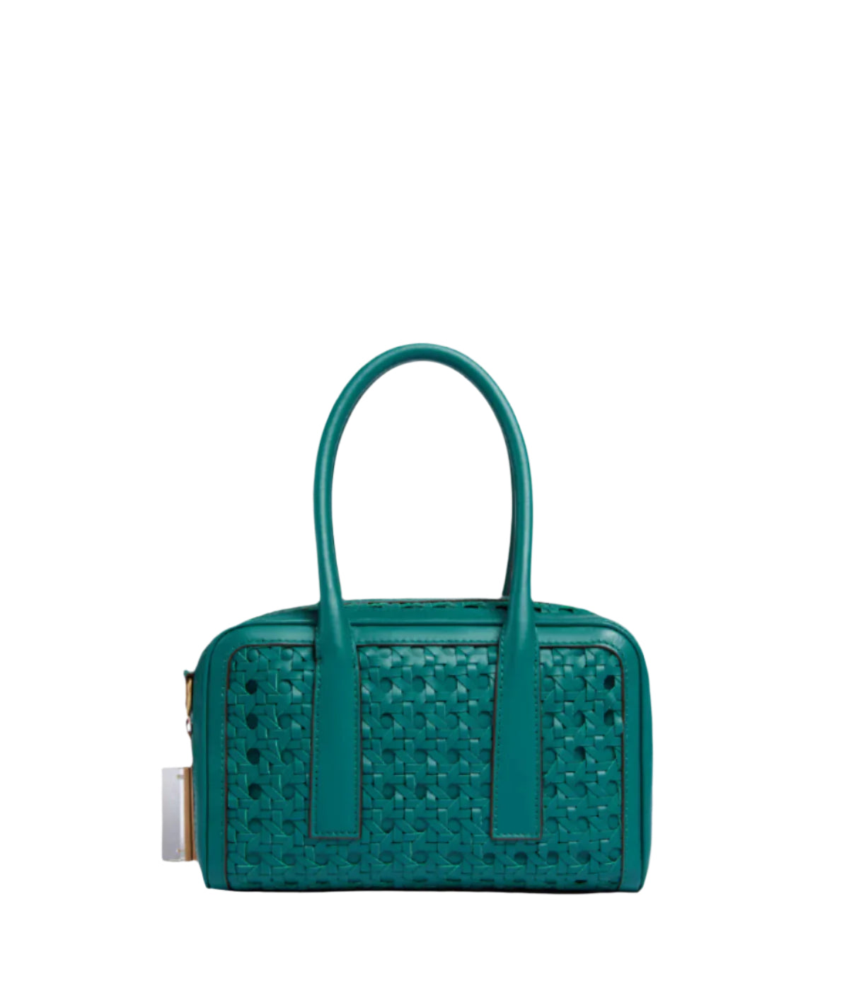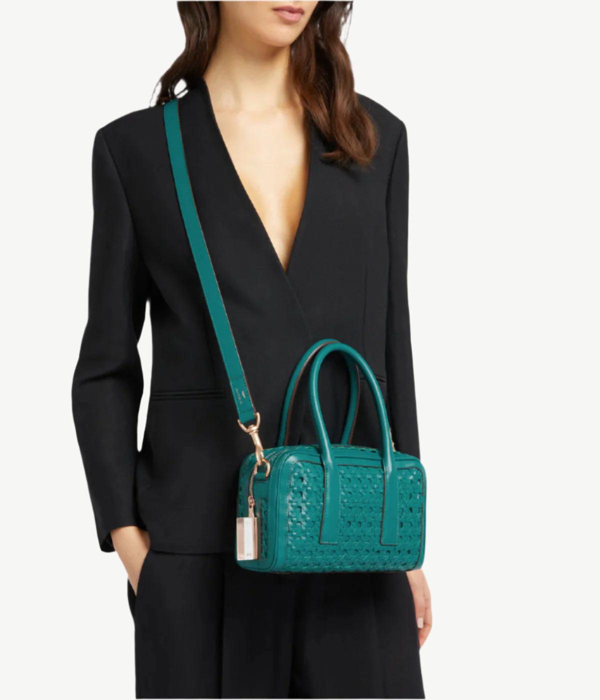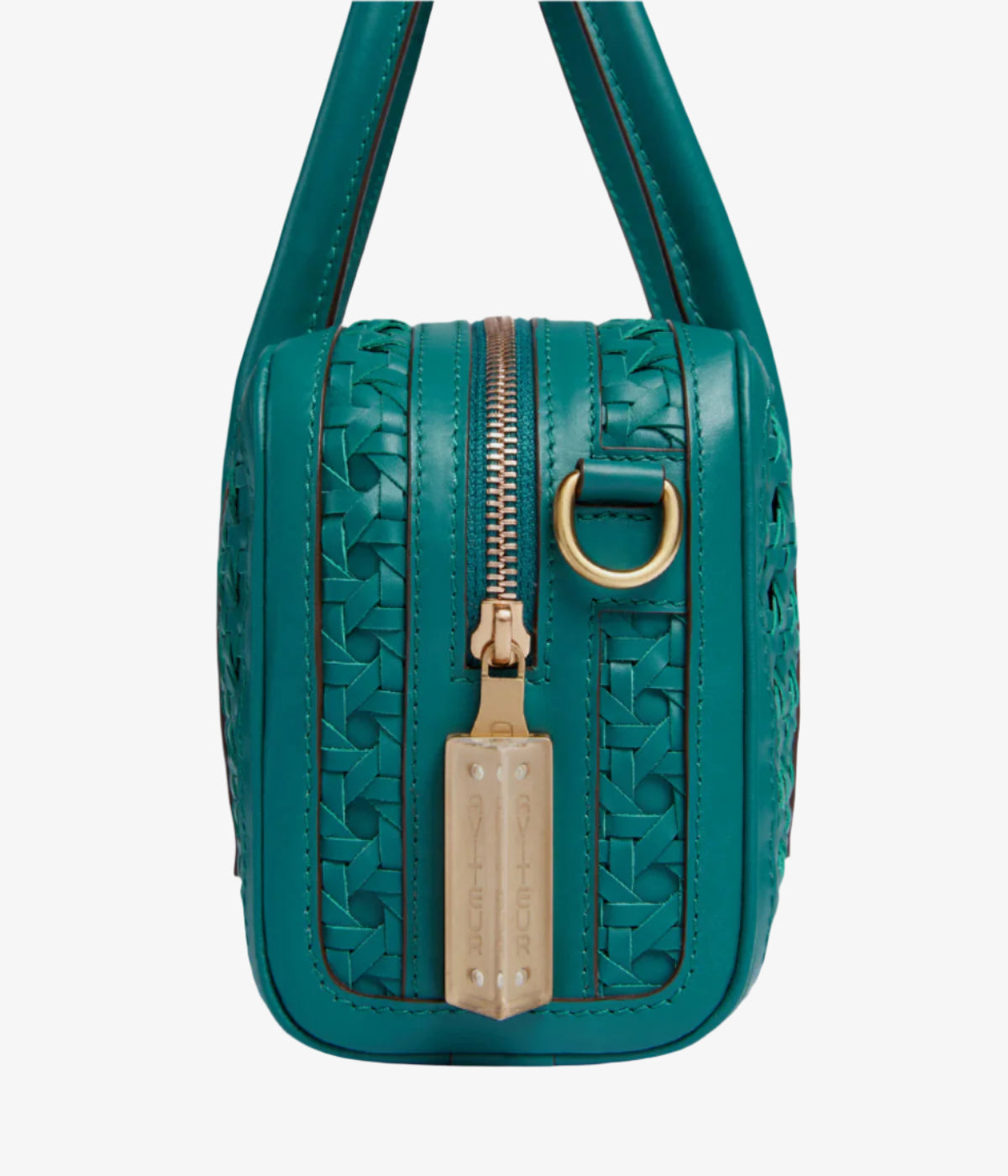 Crafted from soft, natural calfskin with an artisanal finish, this versatile handbag for day or night, carried over the shoulder, crossbody, or by hand. Timeless style featuring intreccio weave, open and zipped internal compartments, Aviteur prism clasp.