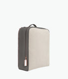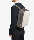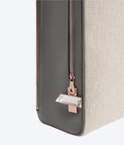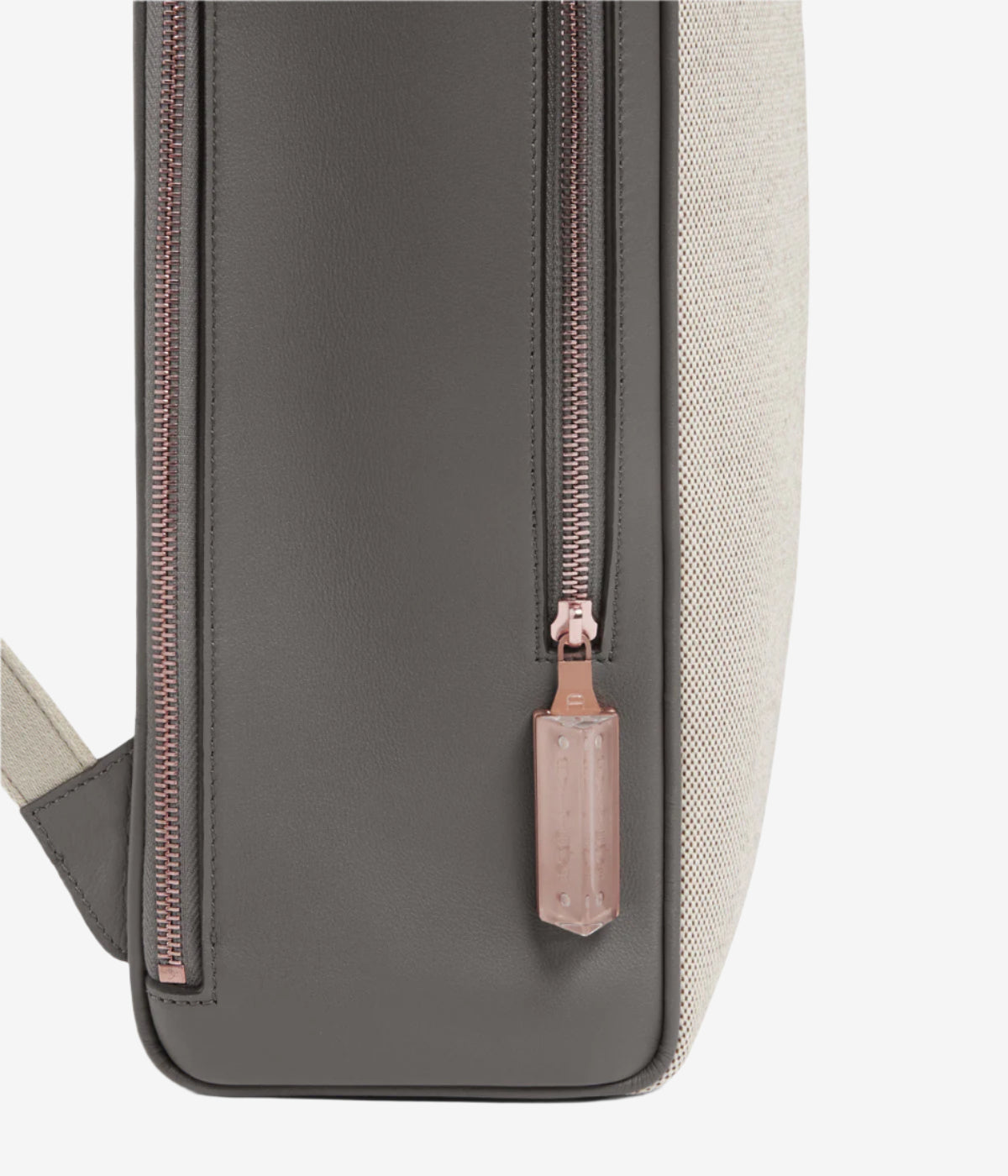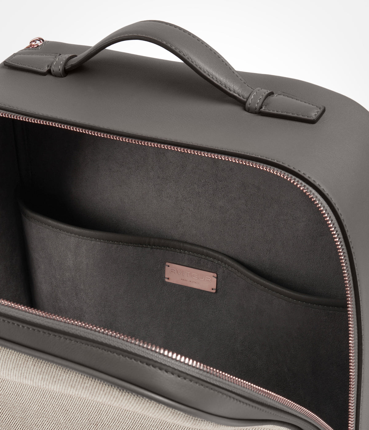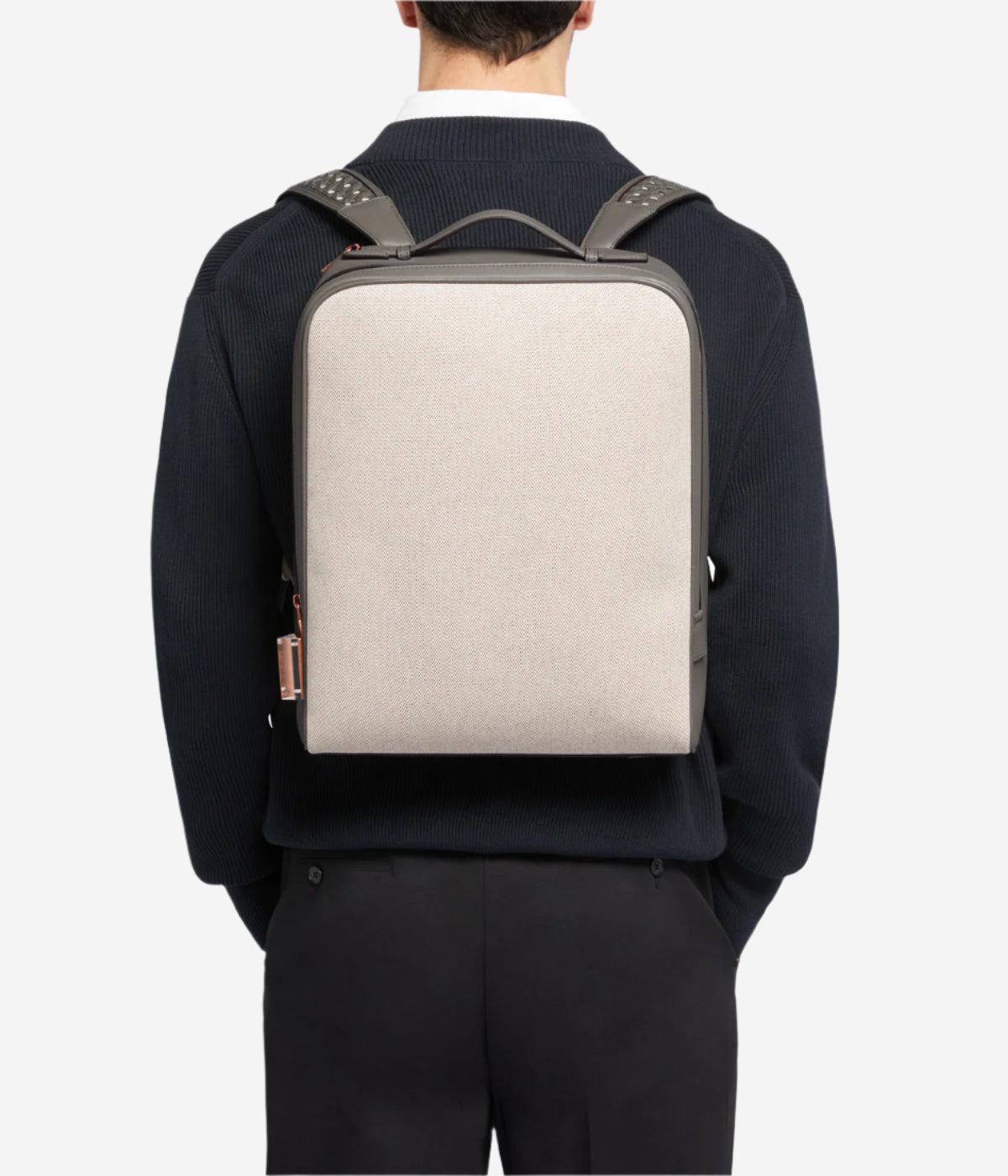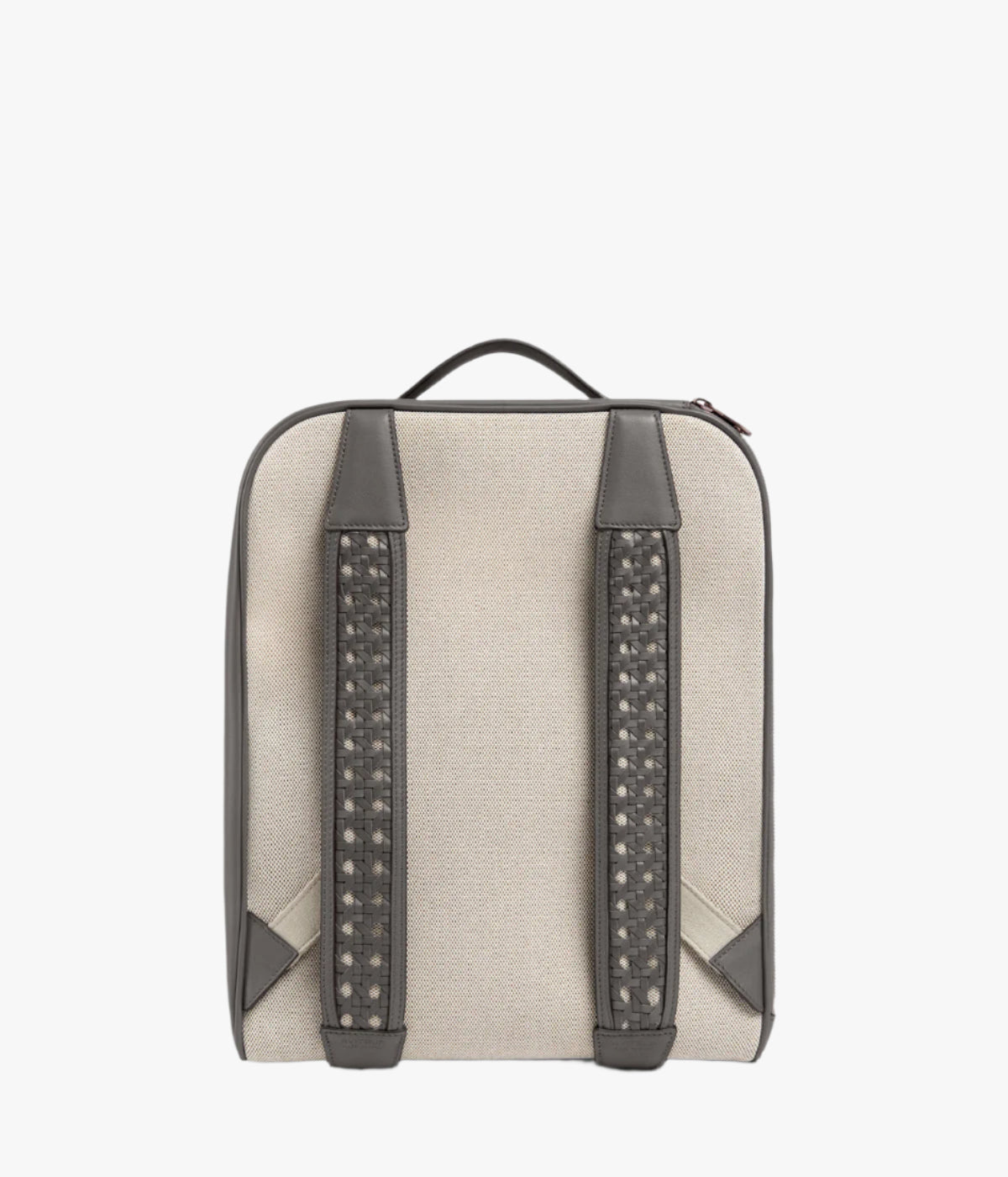 Backpack in canvas with grey leather trim and intreccio shoulder straps. Double zipped compartments, interior pocket, rose gold zips, Aviteur prism clasp.