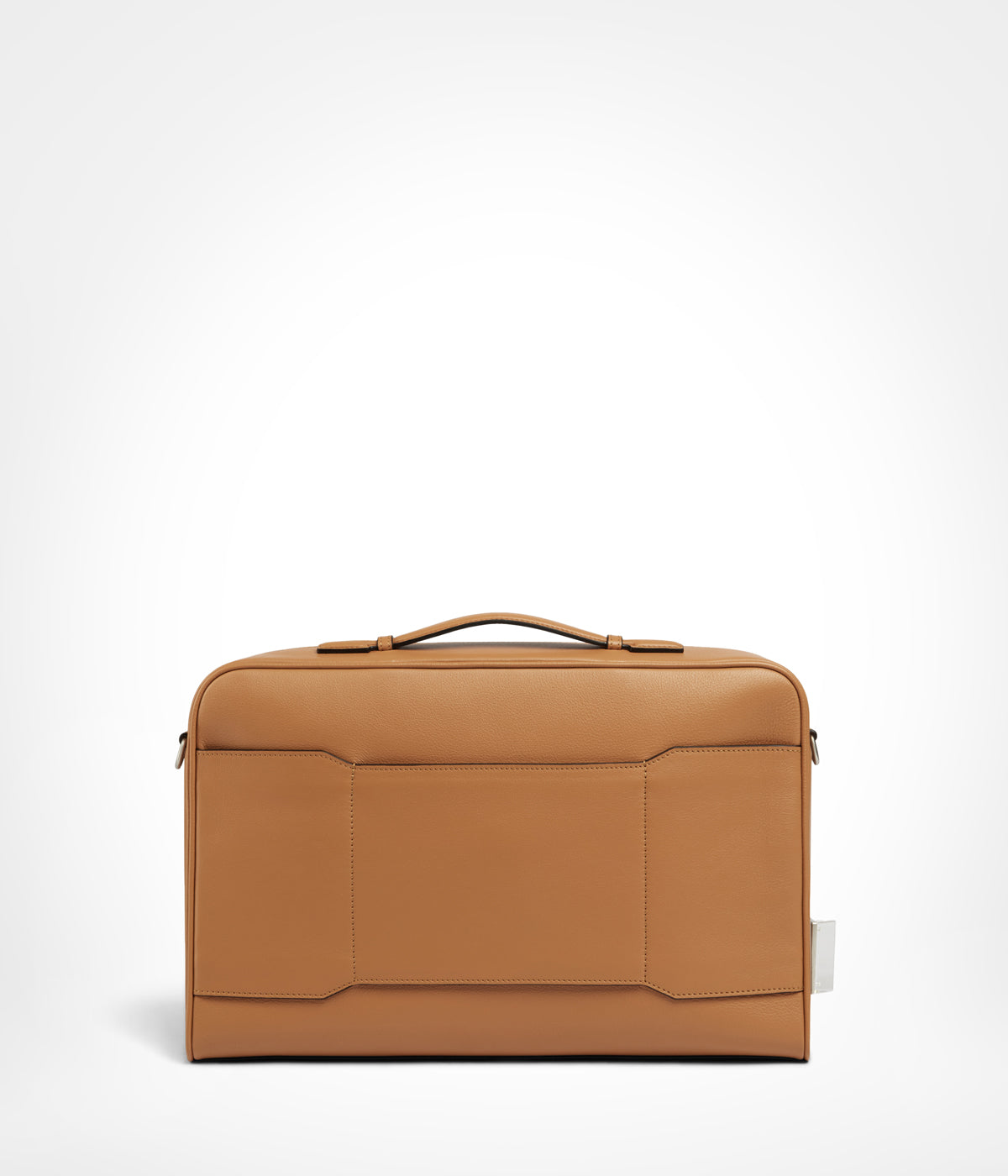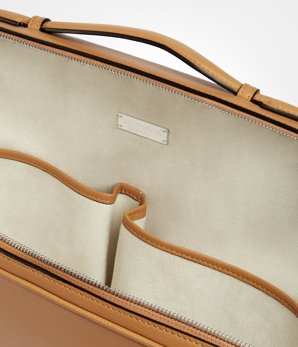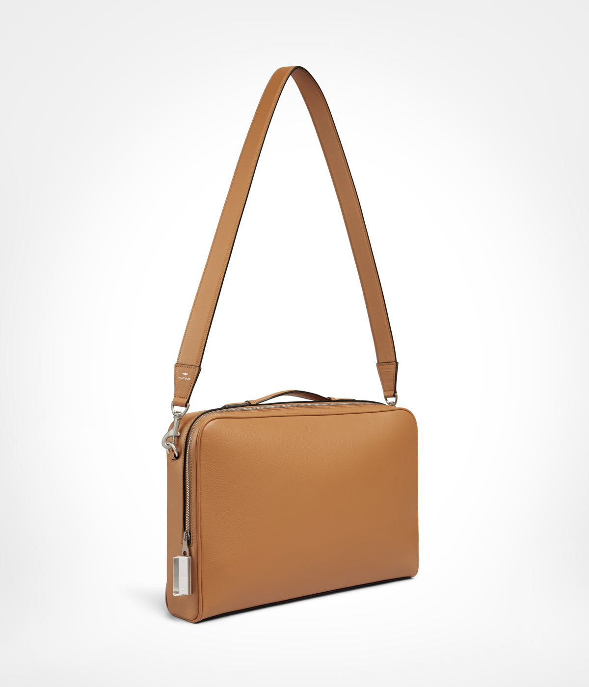 Soft briefcase with laptop compartment, interior and exterior pockets, shoulder strap, anodized brass hardware in palladium. Aviteur prism clasp. The perfect complement to the Aviteur Carry-On.