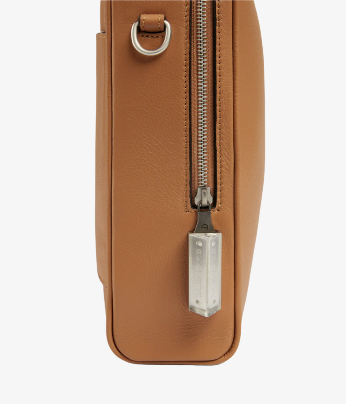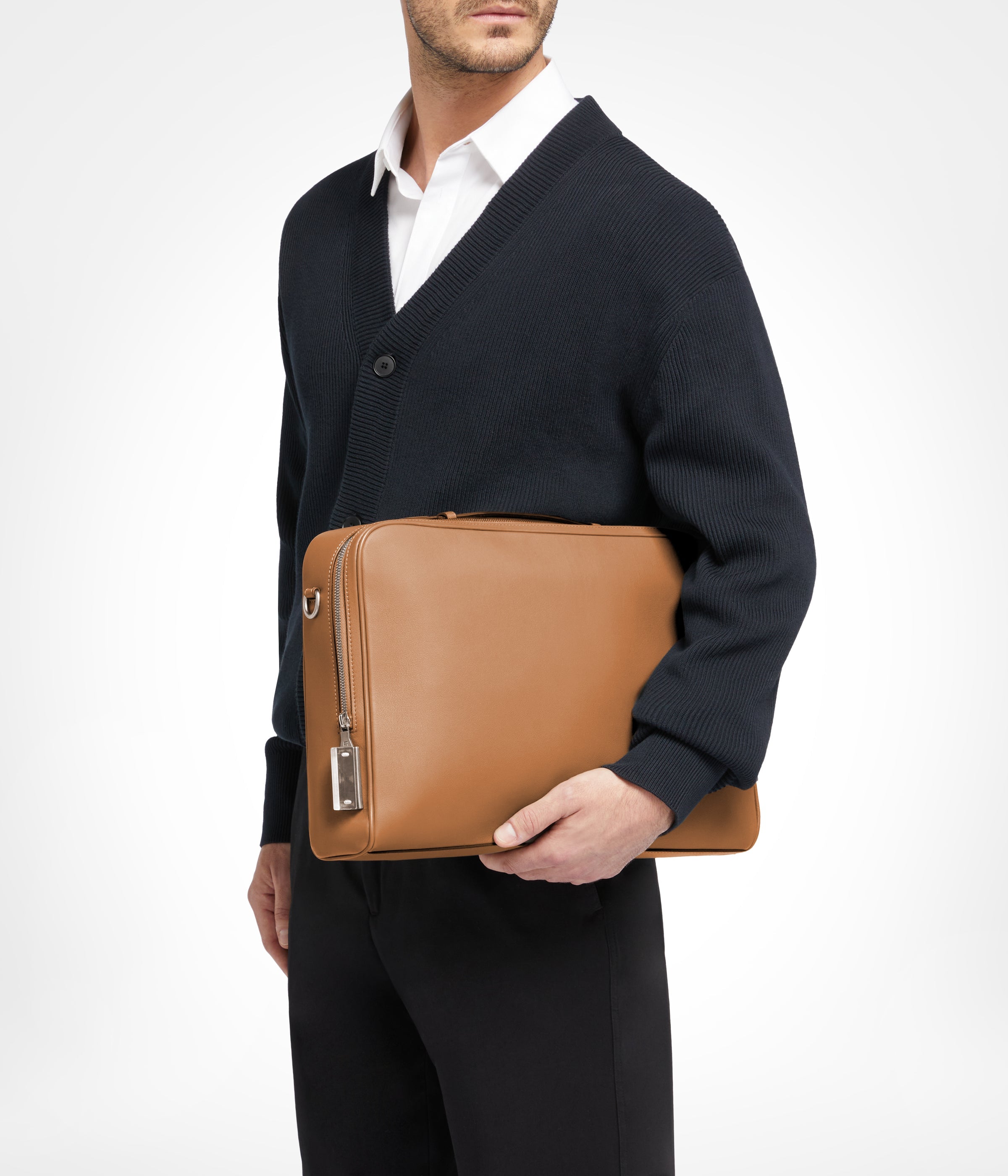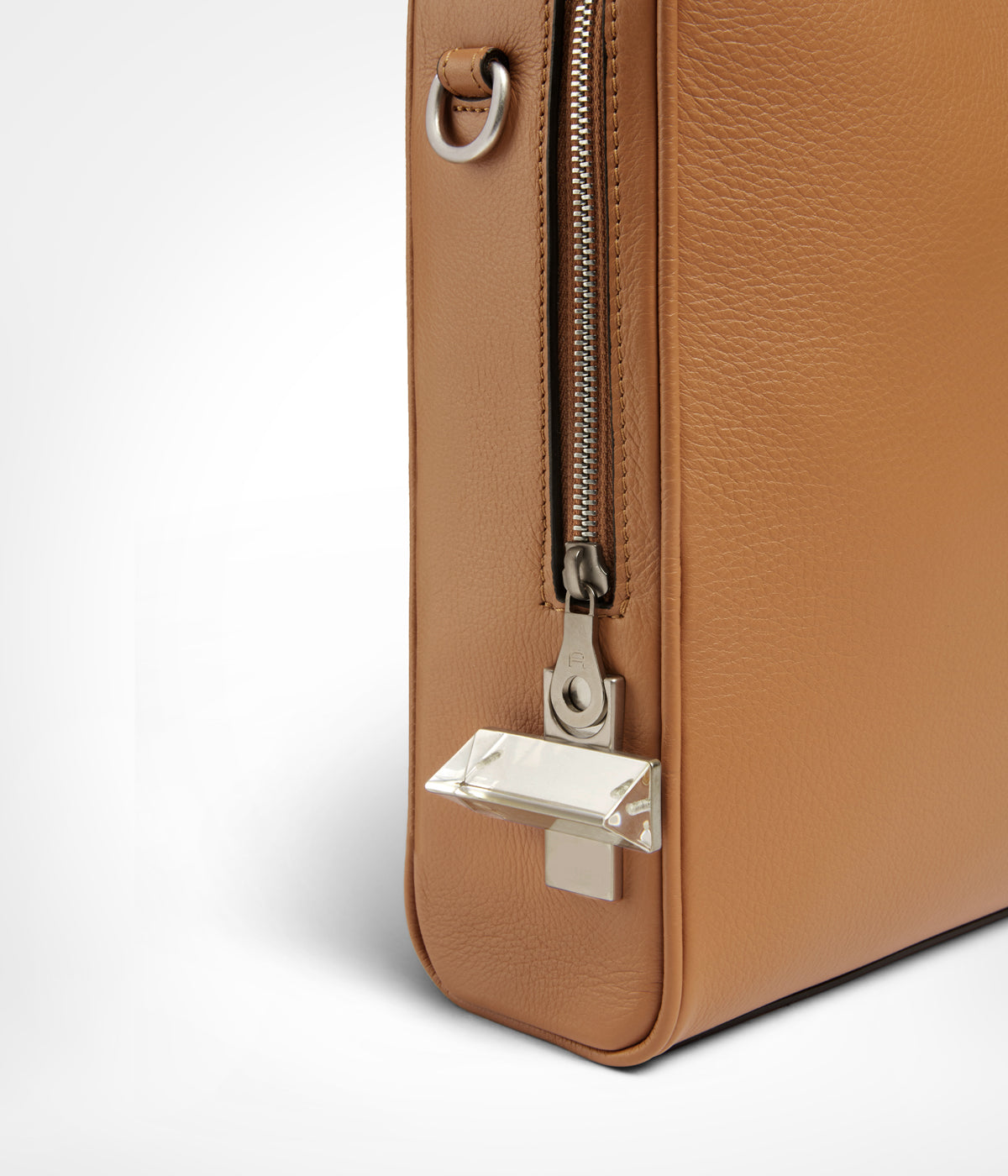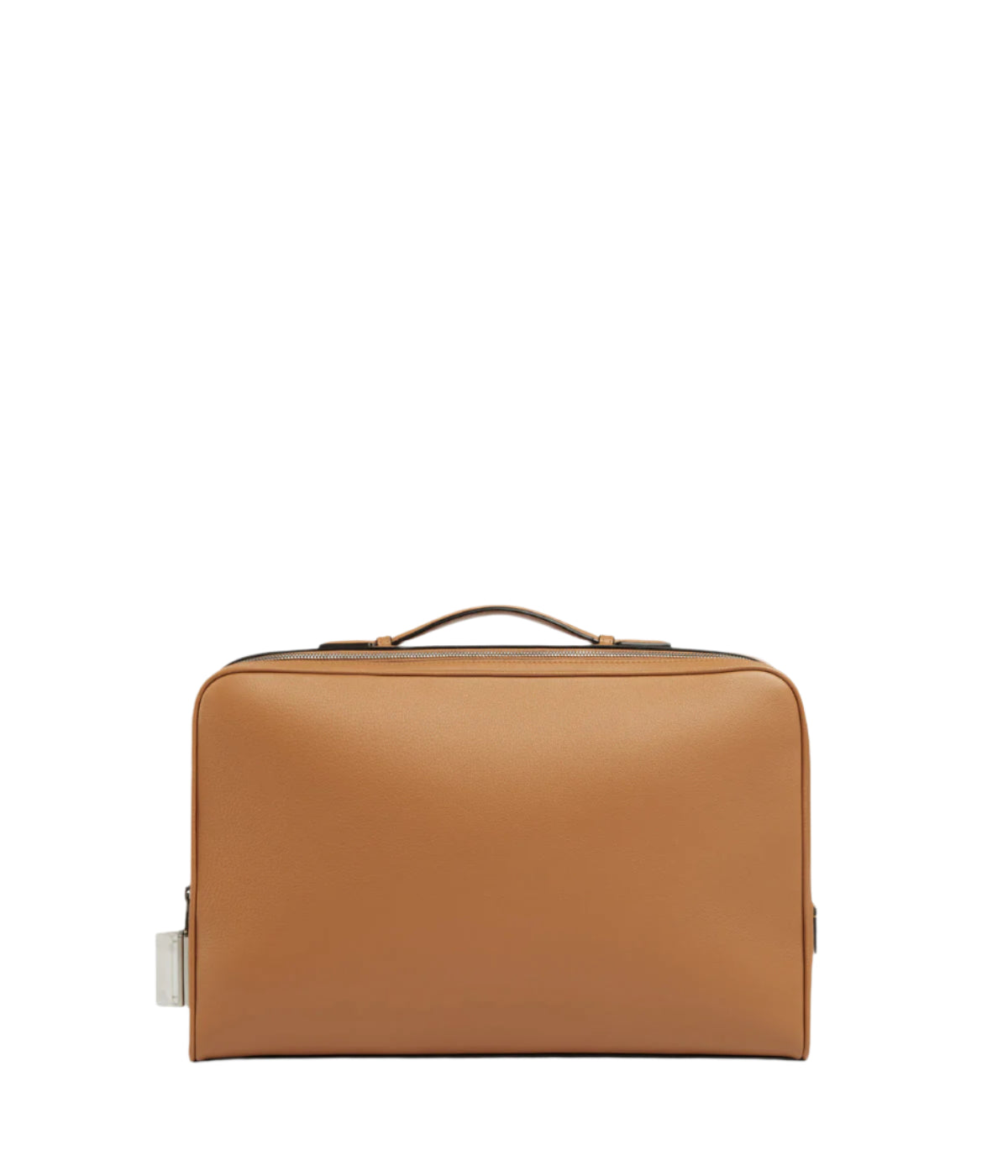 Soft briefcase with laptop compartment, interior and exterior pockets, shoulder strap, anodized brass hardware in palladium. Aviteur prism clasp. The perfect complement to the Aviteur Carry-On.