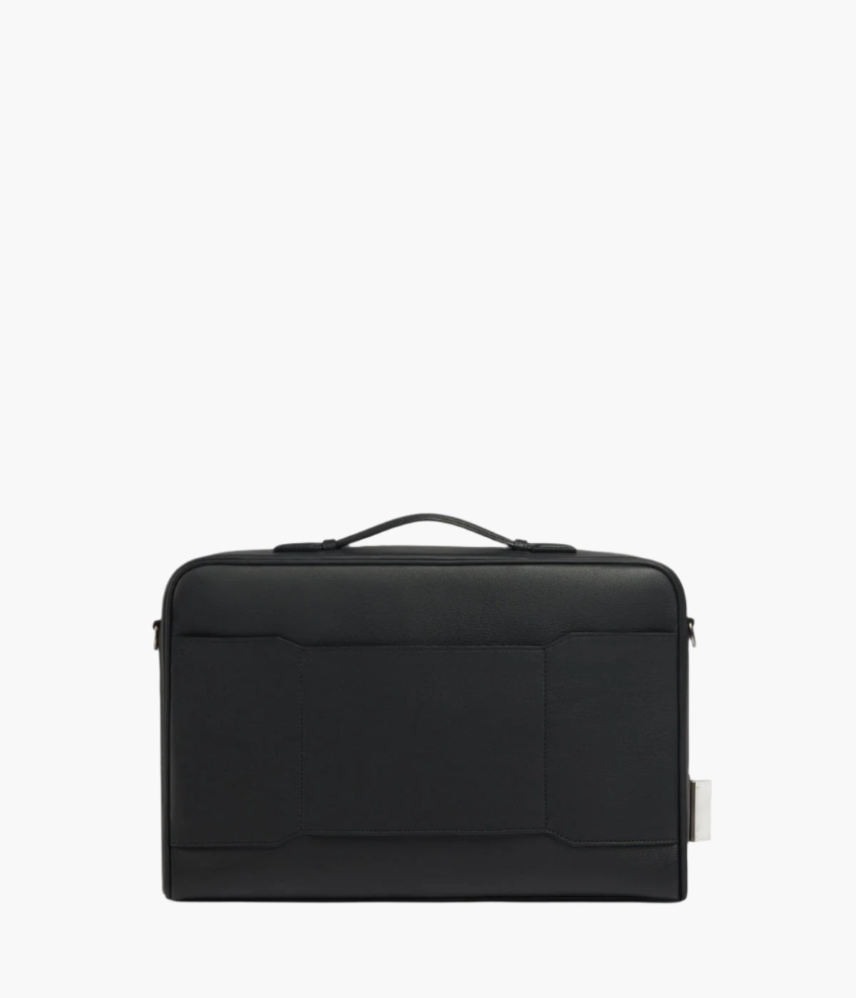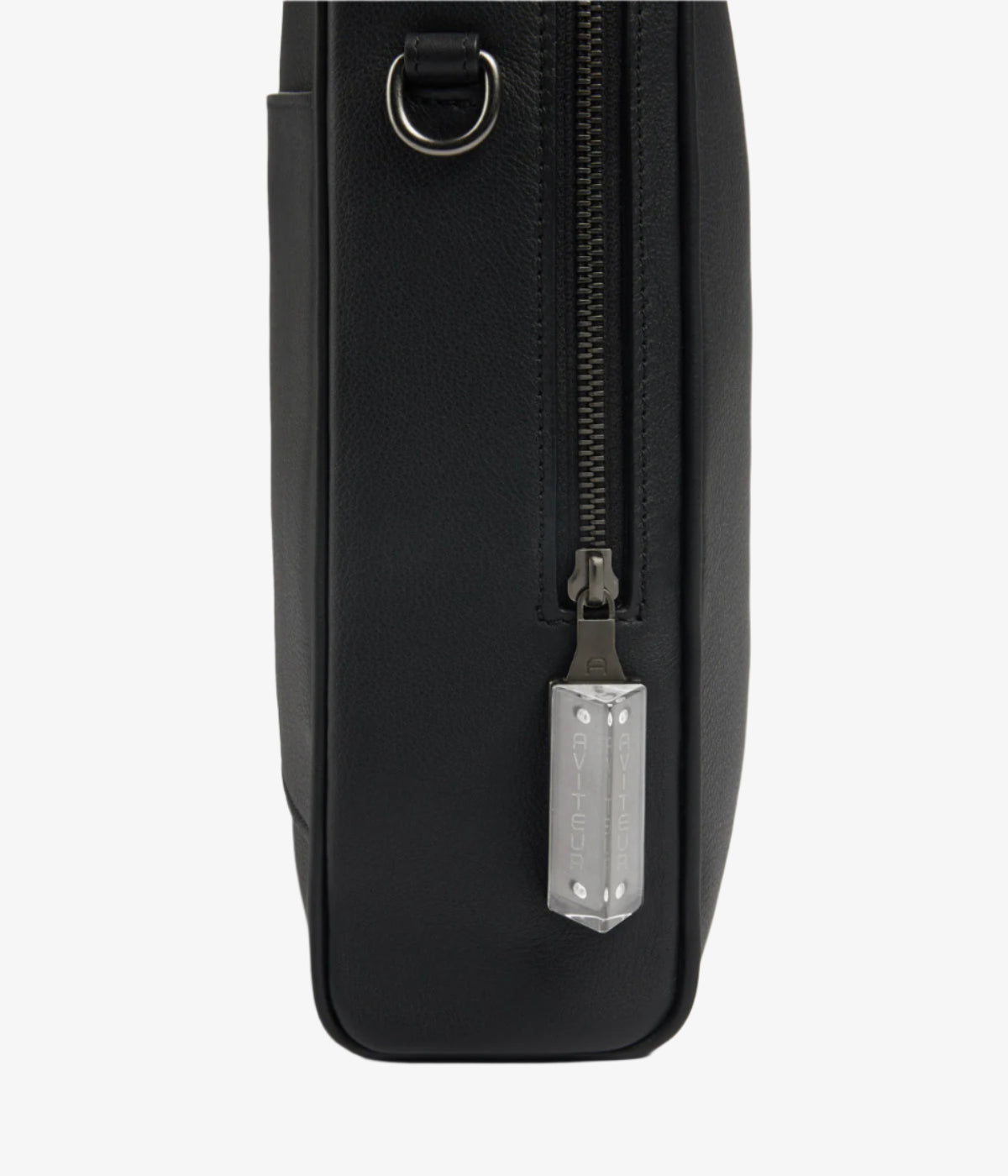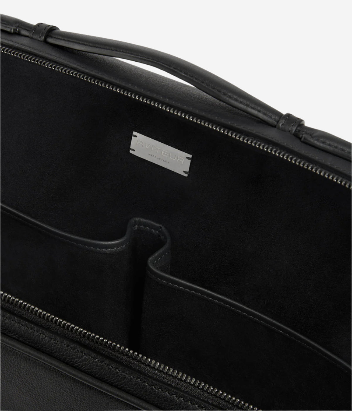 Soft briefcase with laptop compartment, interior and exterior pockets, shoulder strap, anodized brass hardware in ruthenium. Aviteur prism clasp. The perfect complement to the Aviteur Carry-On.