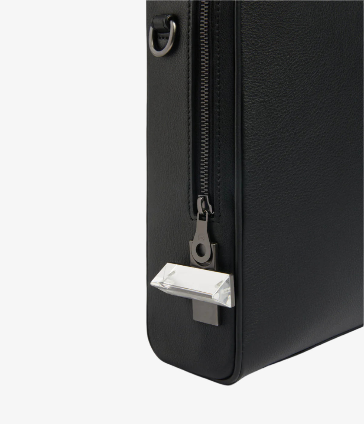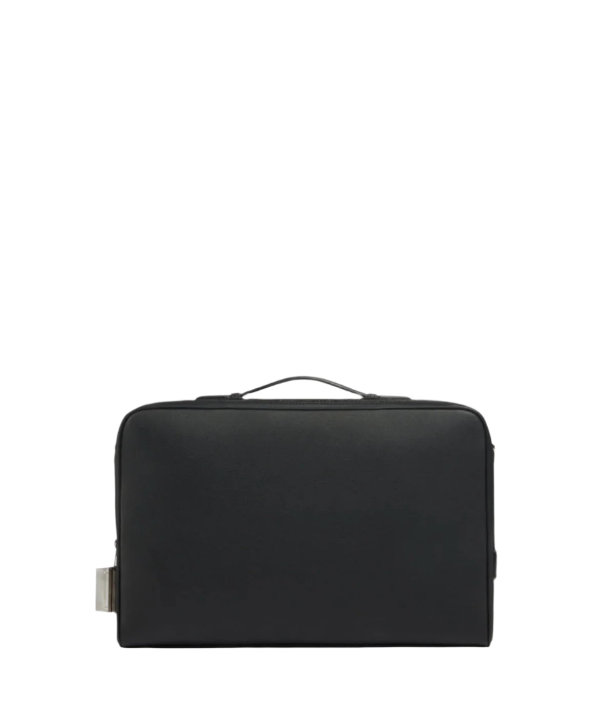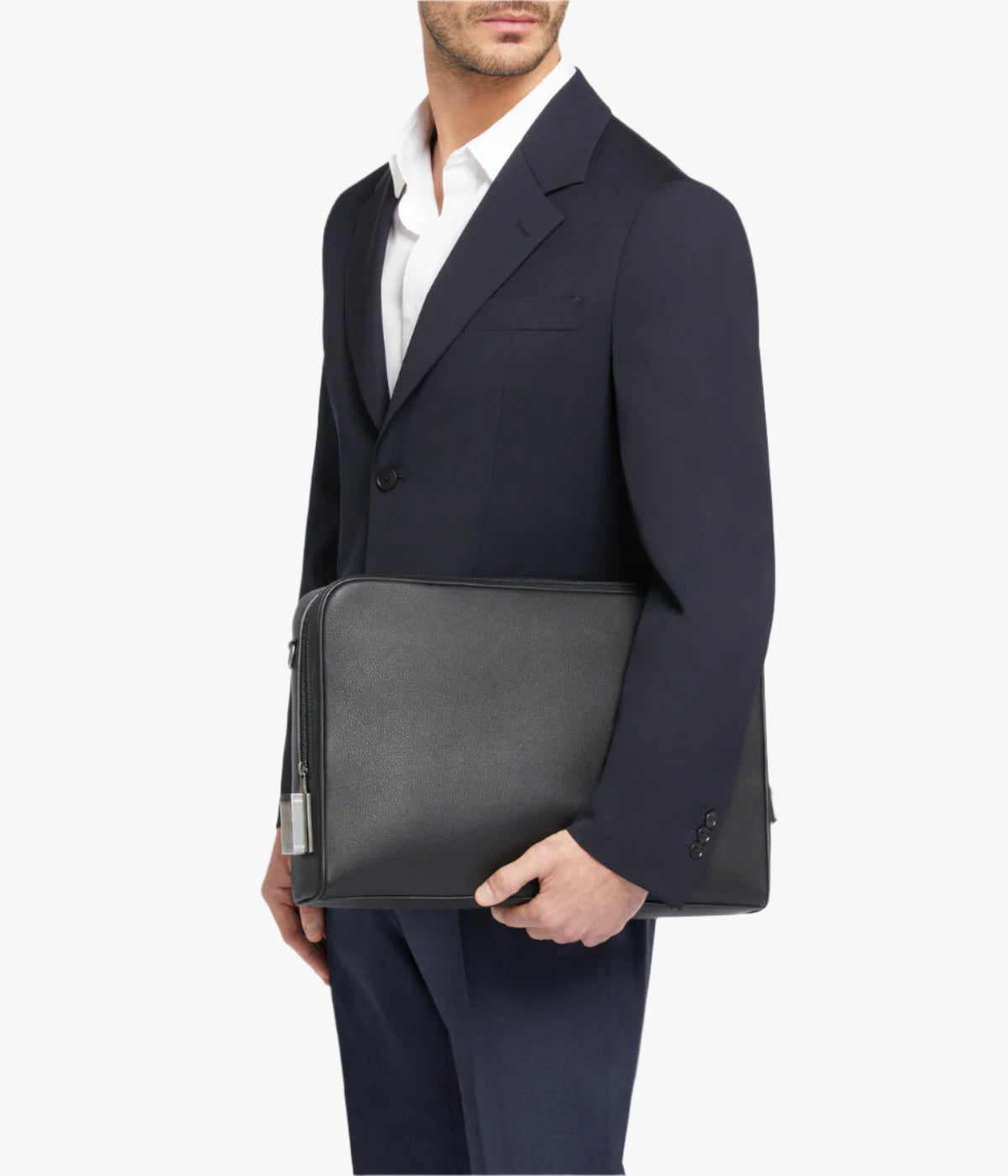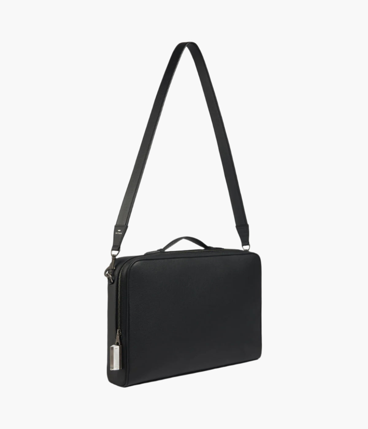 Soft briefcase with laptop compartment, interior and exterior pockets, shoulder strap, anodized brass hardware in ruthenium. Aviteur prism clasp. The perfect complement to the Aviteur Carry-On.