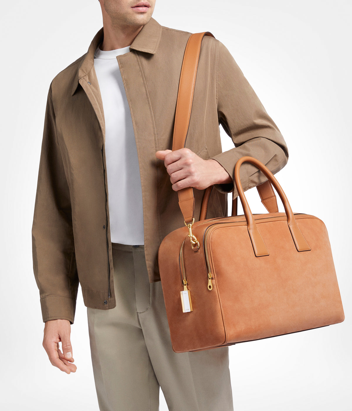 Versatile Weekend Bag in nubuck lined in Alcantara. Double zipped compartments, interior and exterior pockets, trolley sleeve, shoulder strap, Aviteur prism clasp.
