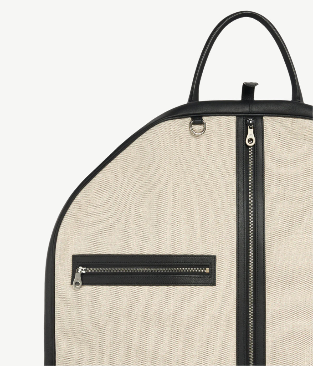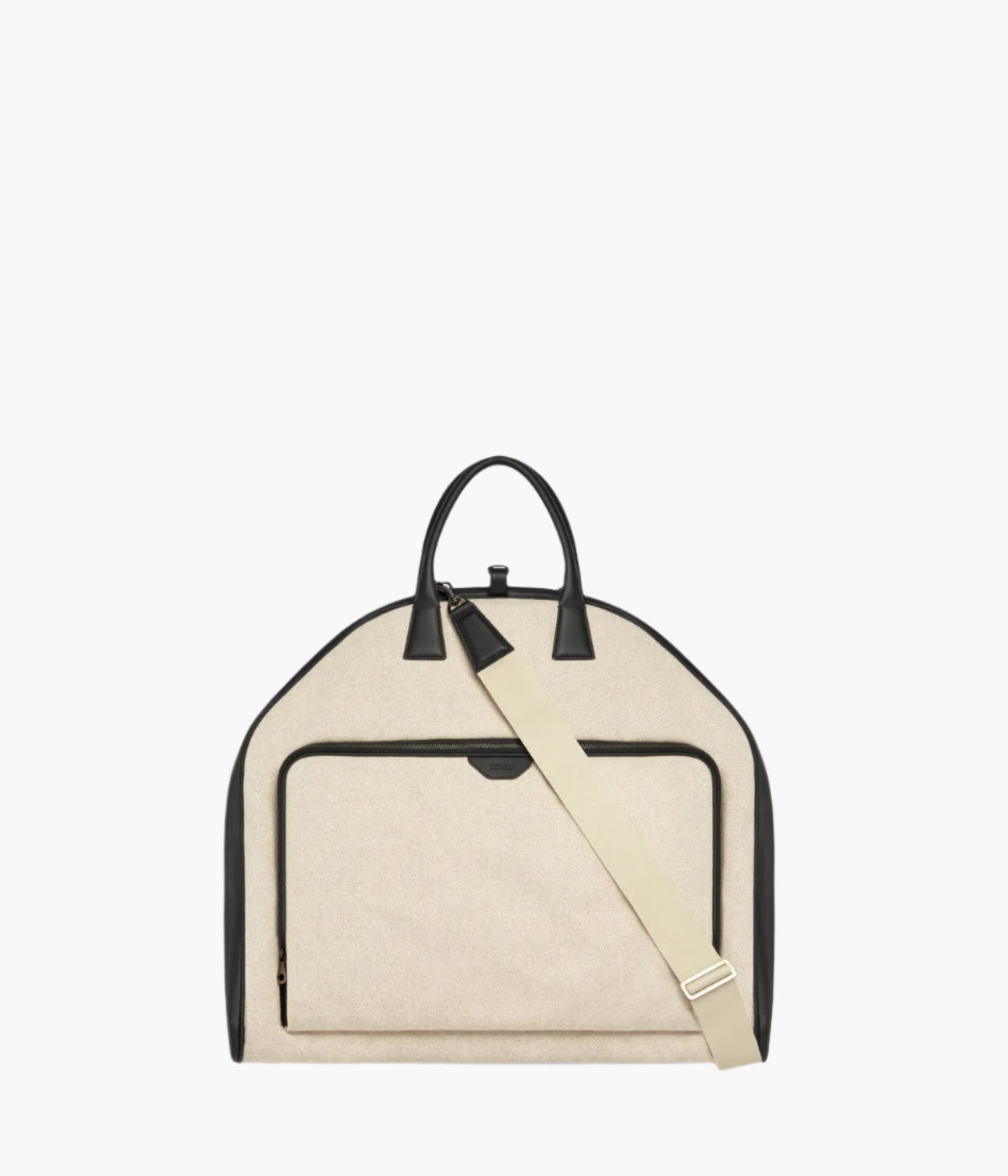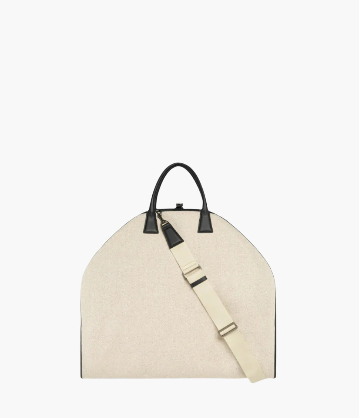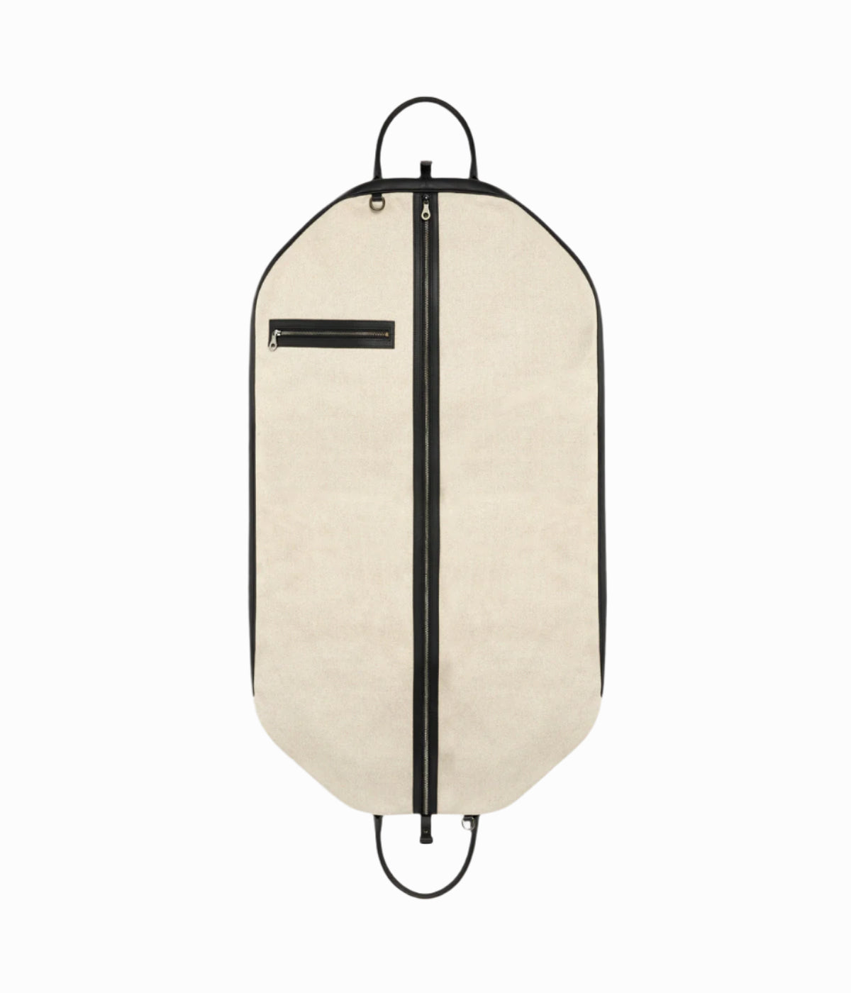 Canvas garment bag with leather trim, external compartment, and adjustable shoulder strap.