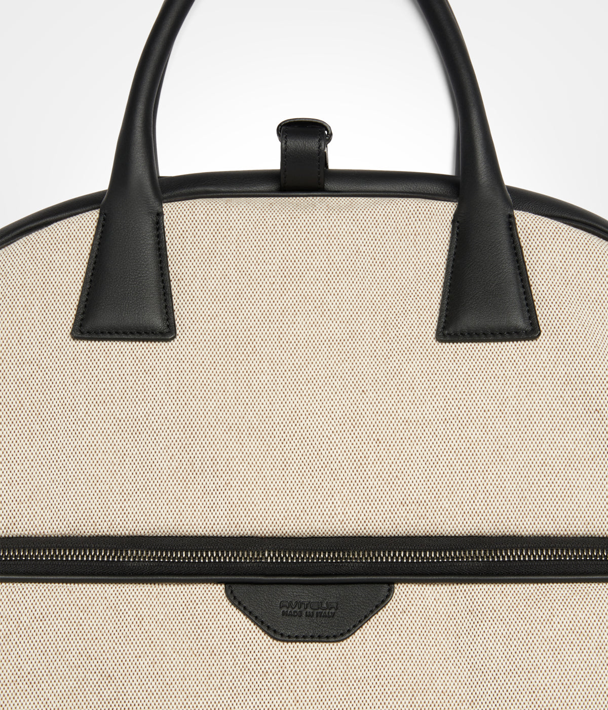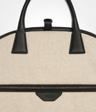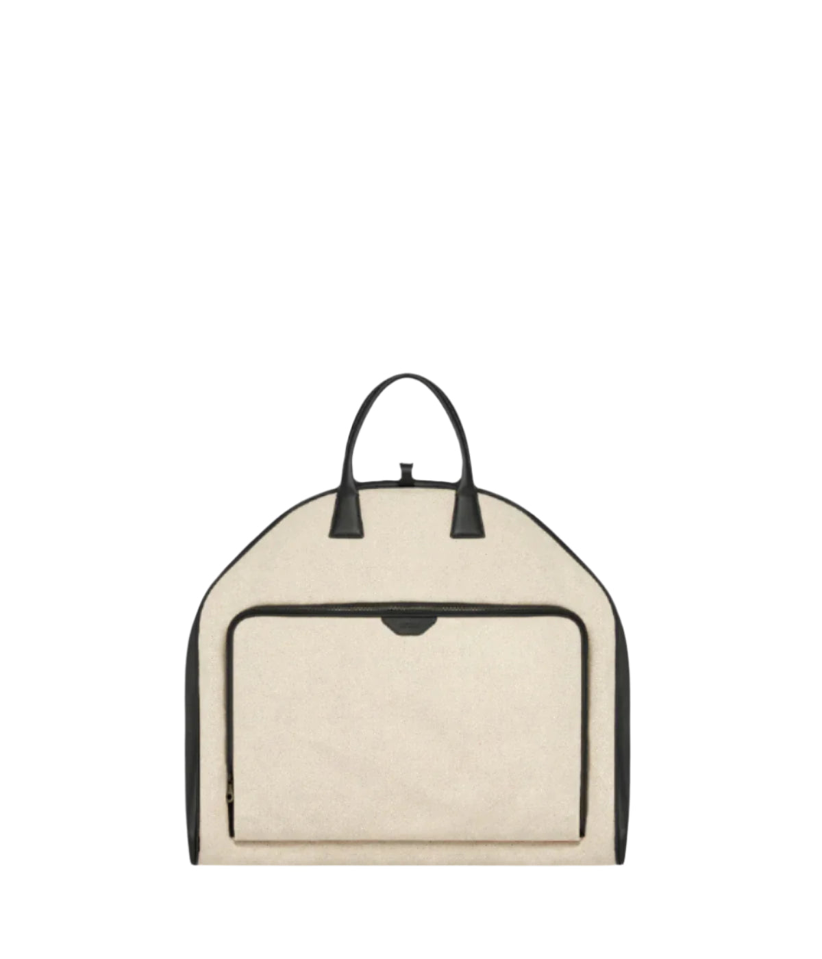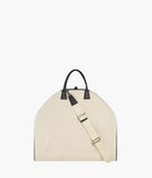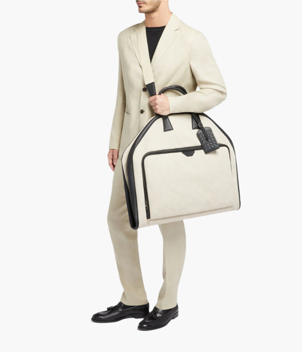 Canvas garment bag with leather trim, external compartment, and adjustable shoulder strap.