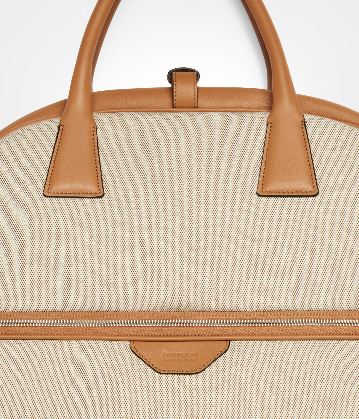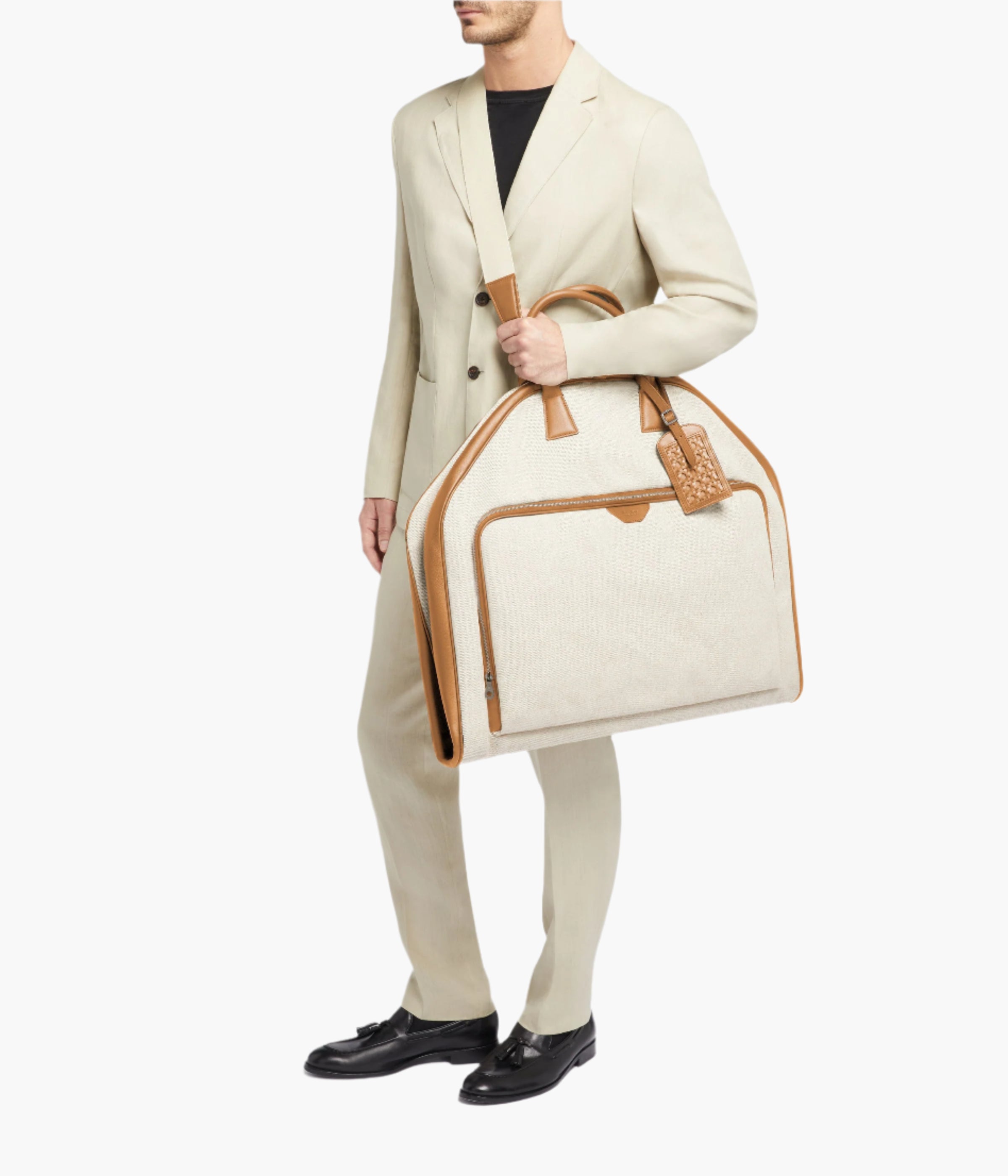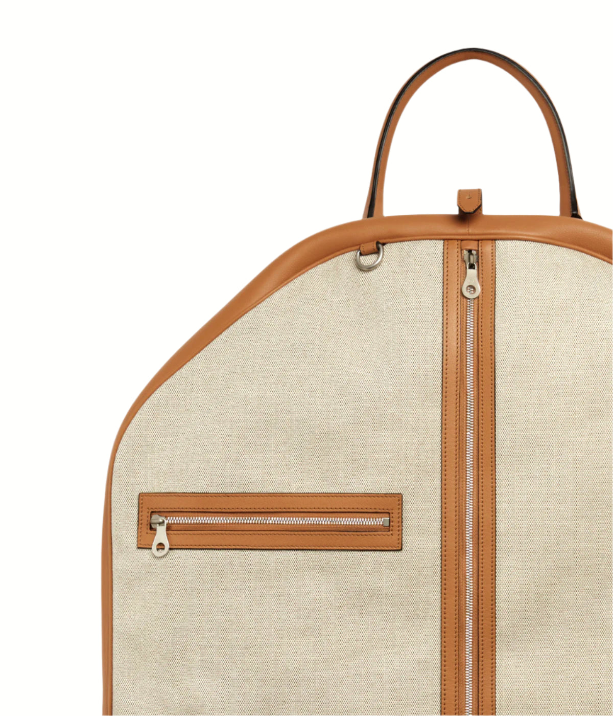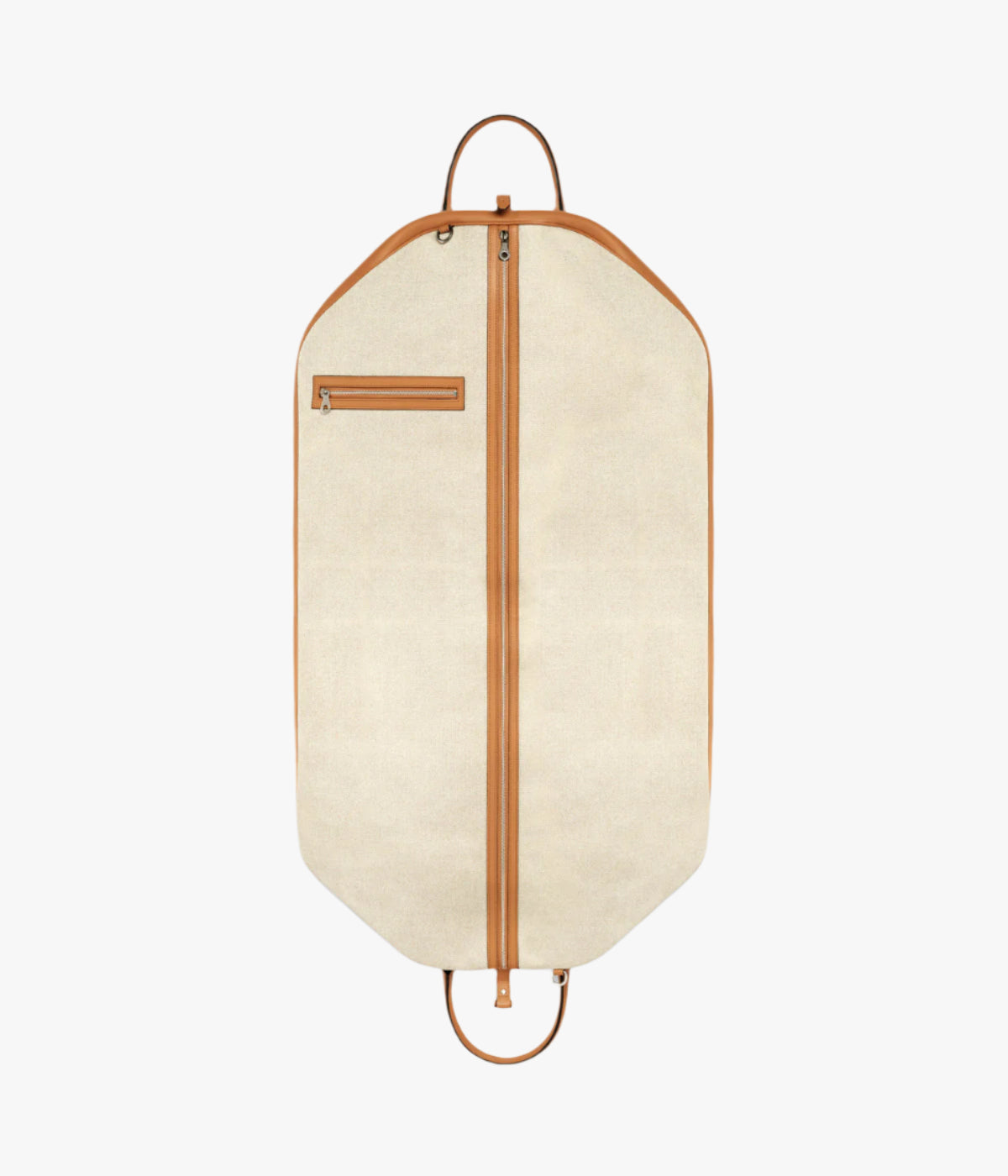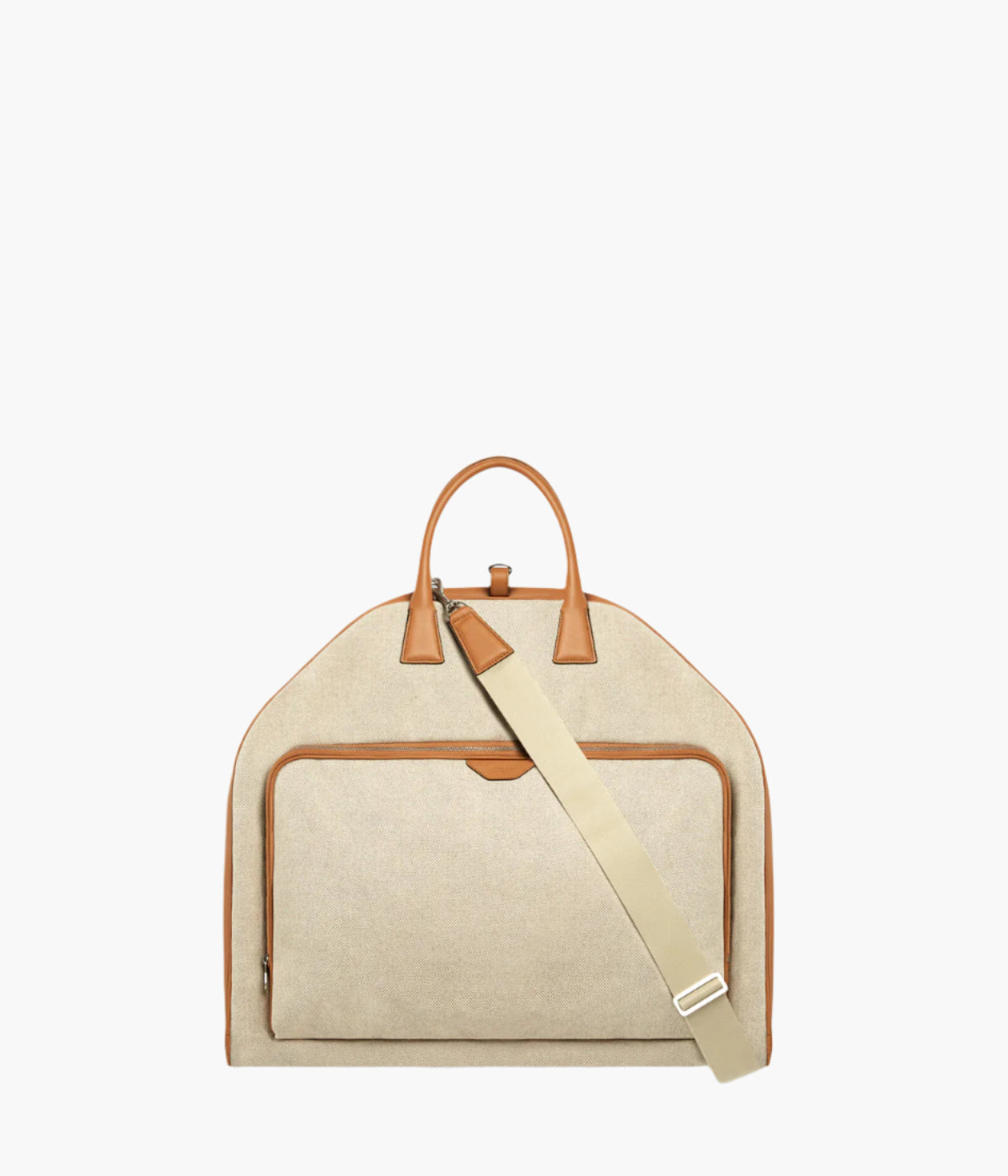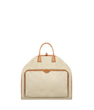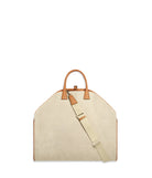 Canvas garment bag with leather trim, external compartment, and adjustable shoulder strap.