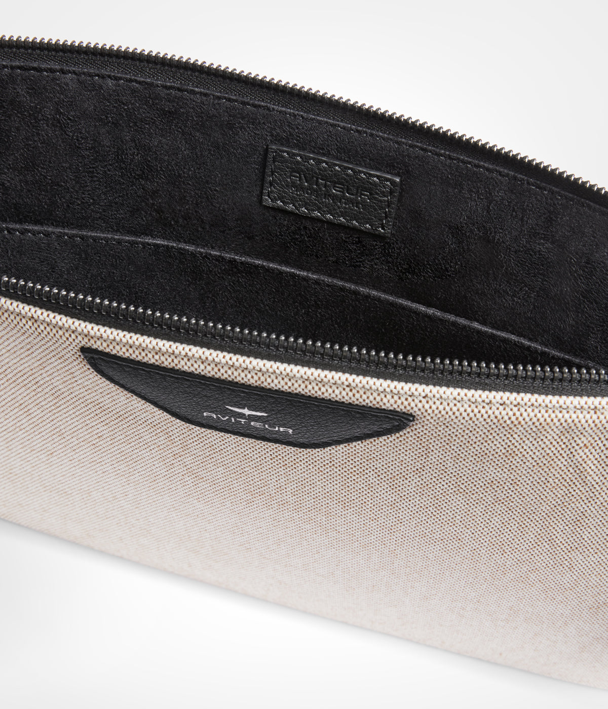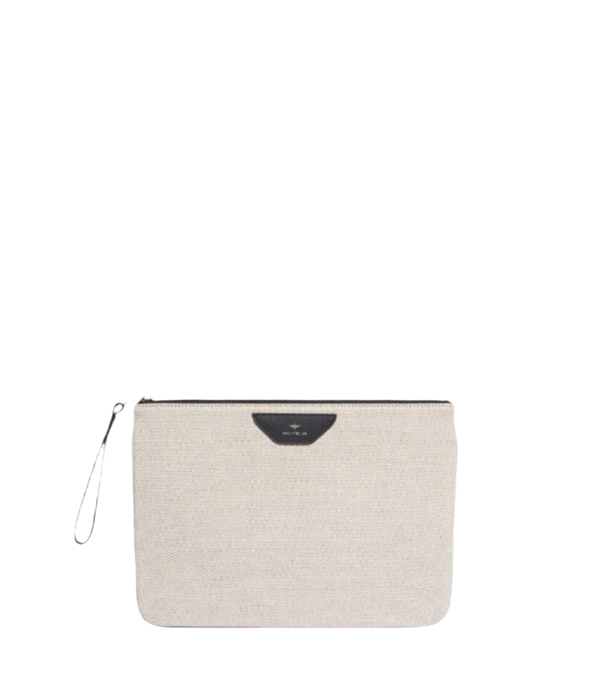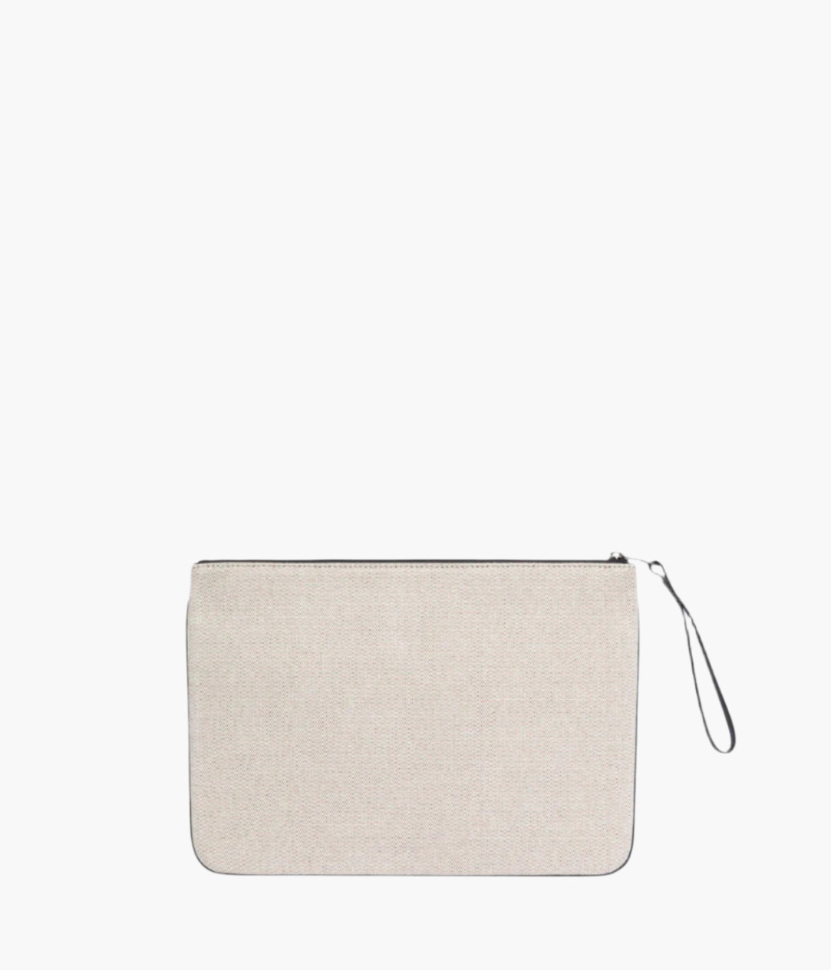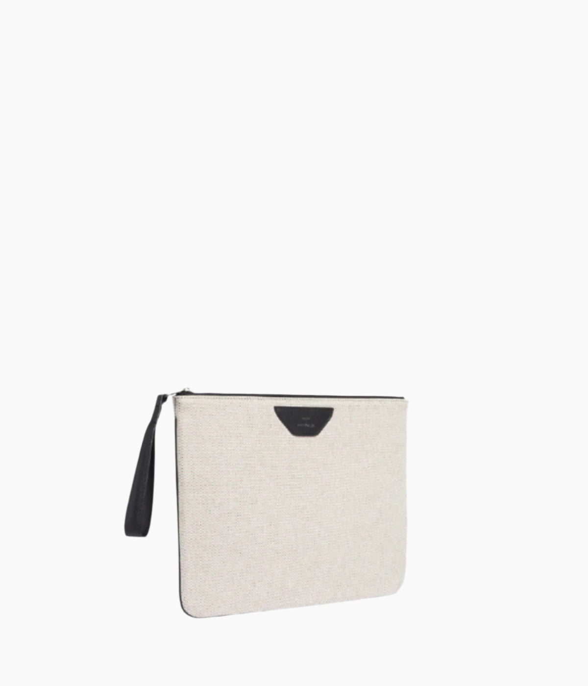 Pouch in canvas with leather trim, suitable for laptops and documents. Inside pocket, zip in anodised ruthenium.