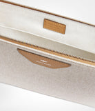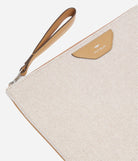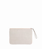 Pouch in canvas with leather trim, suitable for laptops and documents. Inside pocket, zip in anodised palladium.