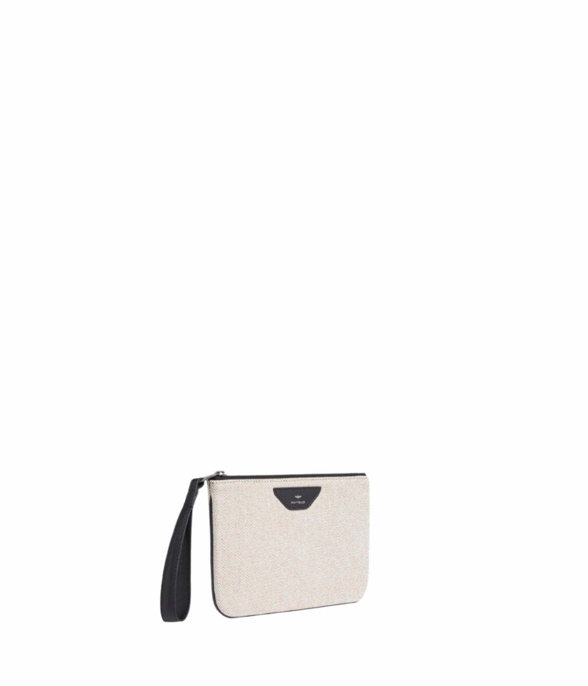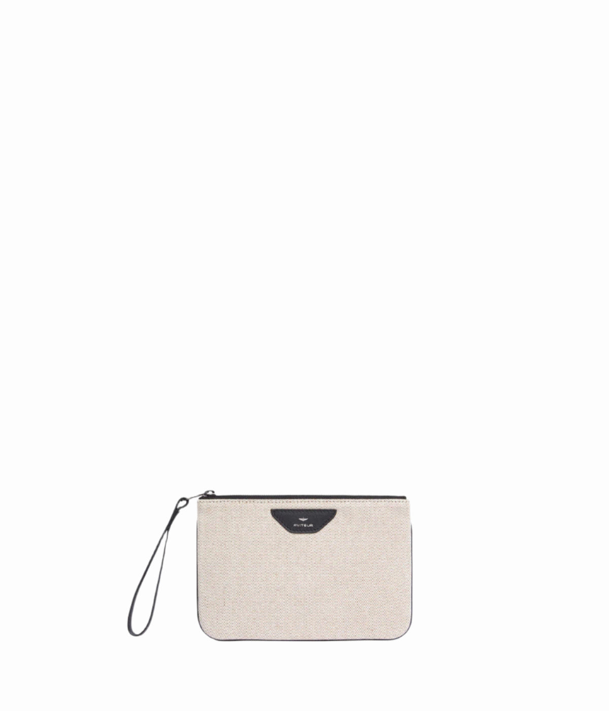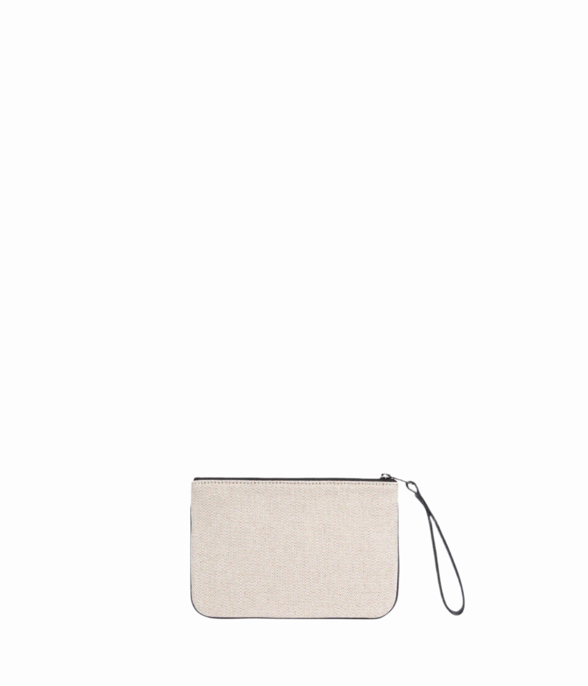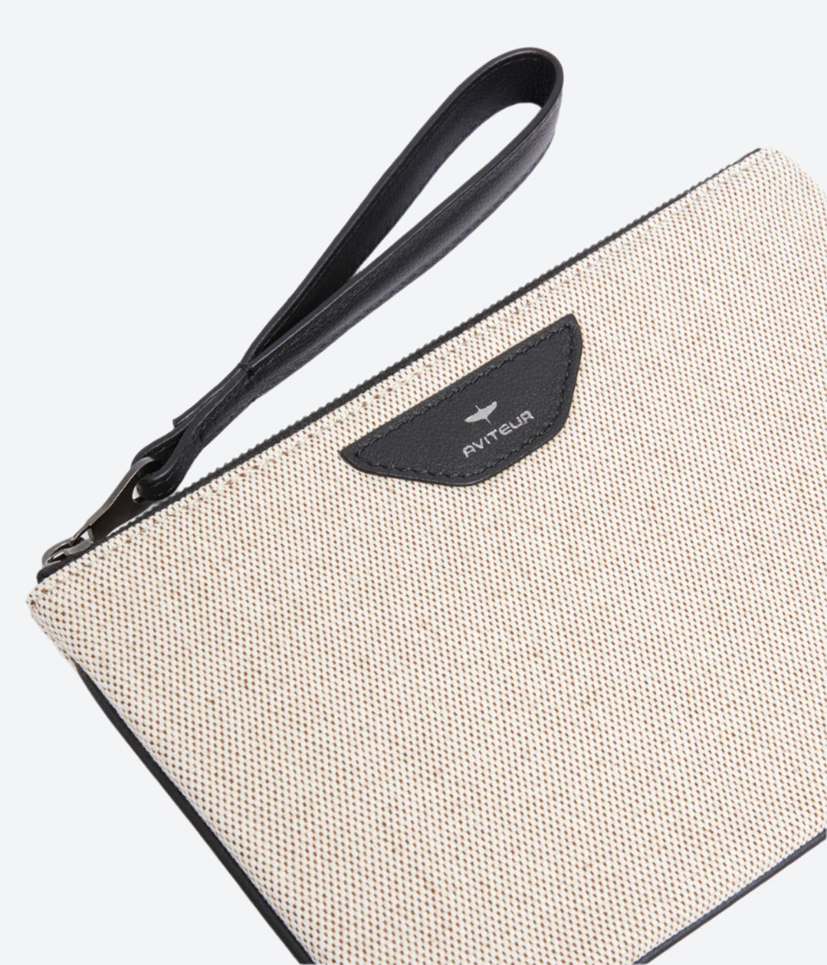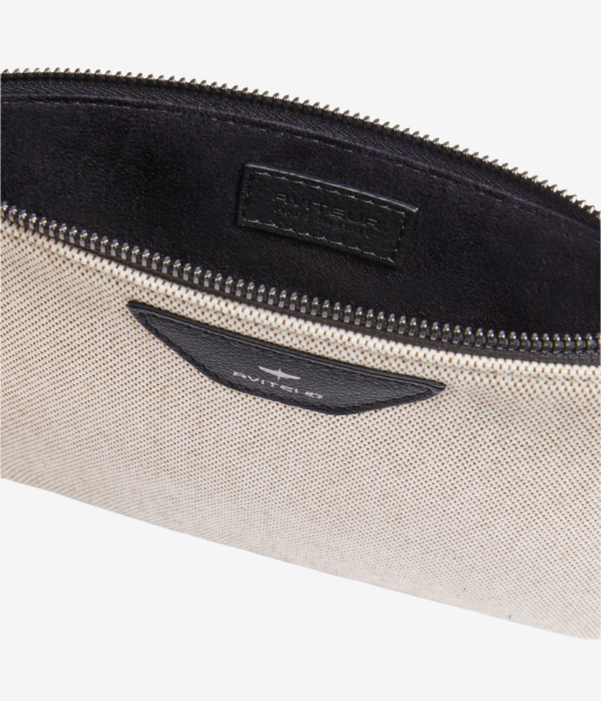 Pouch in canvas with leather trim, suitable for make-up, valuables and loose items. Inside pocket, zip in anodised ruthenium.