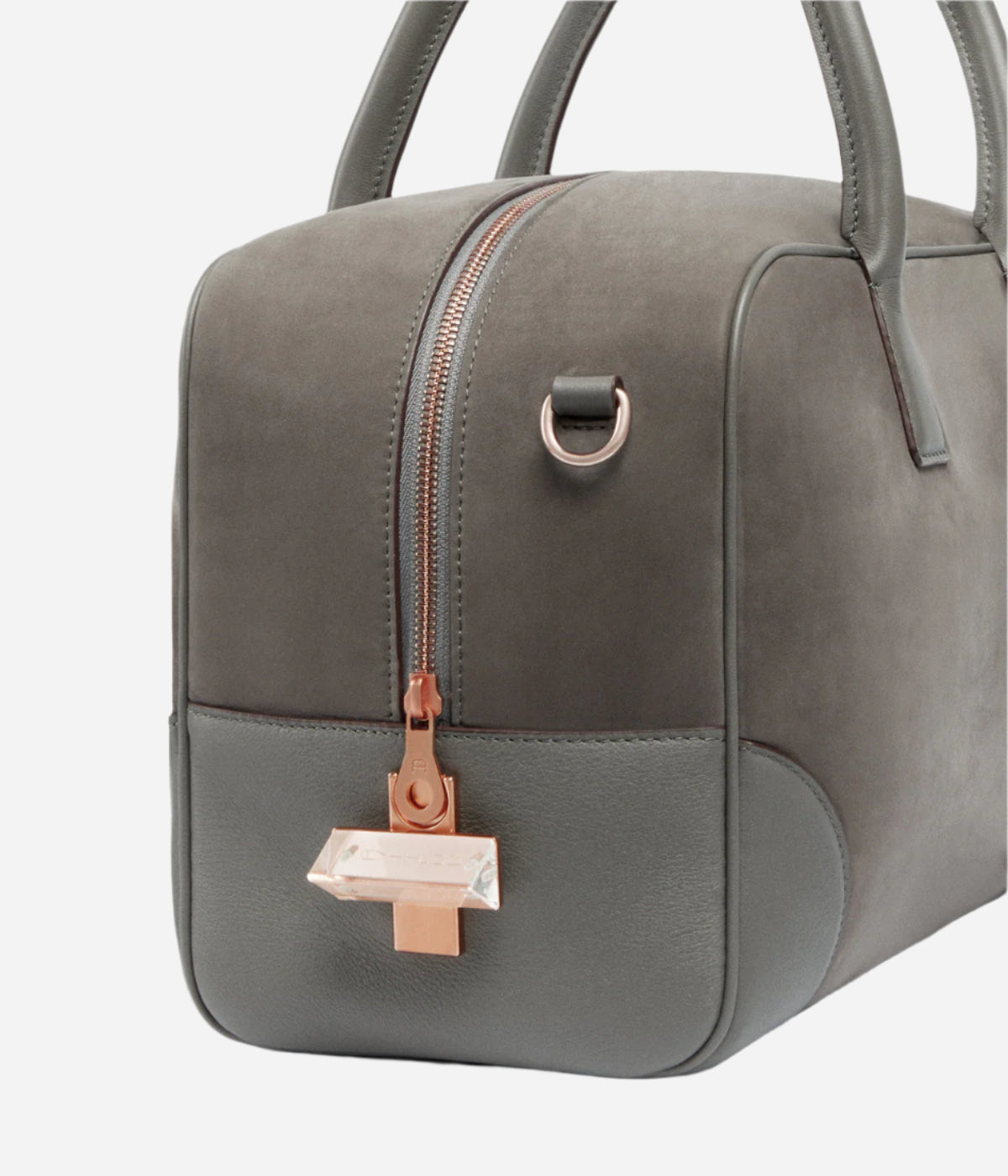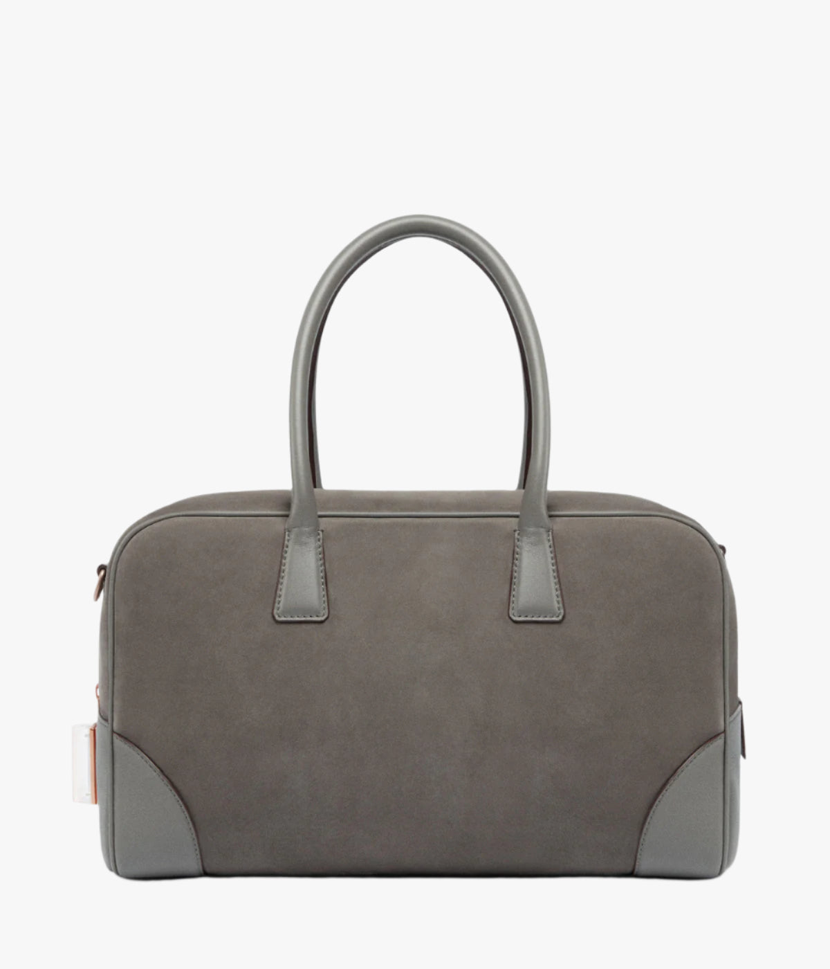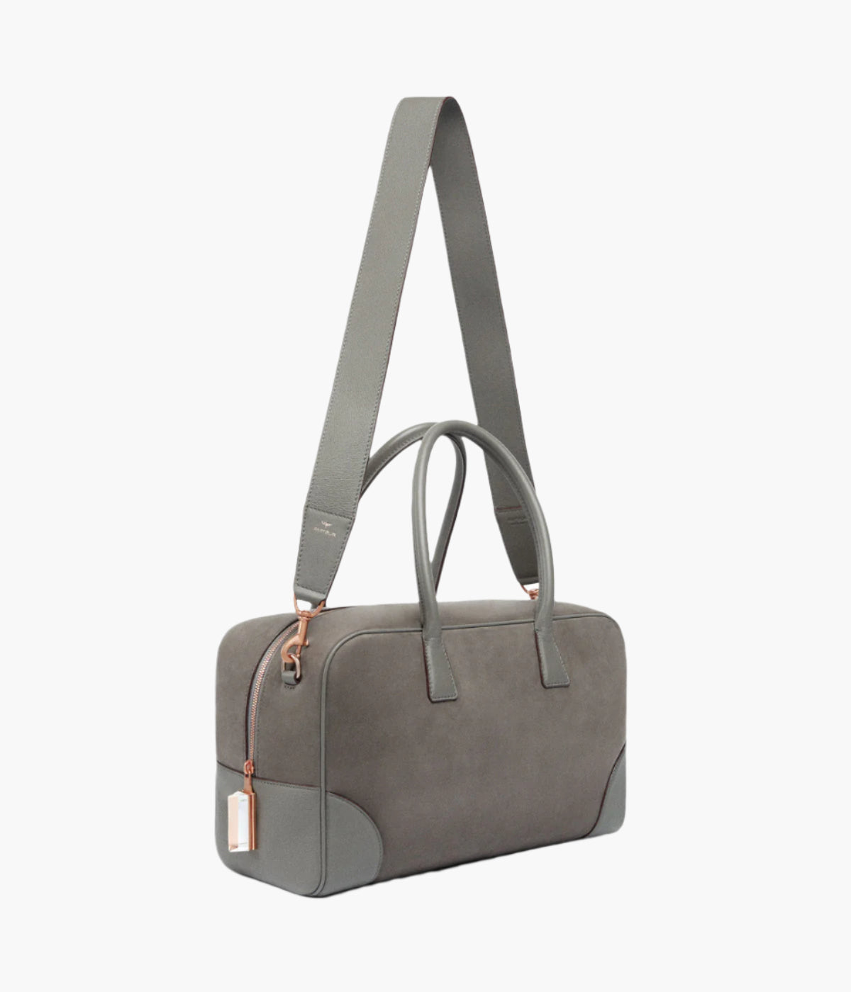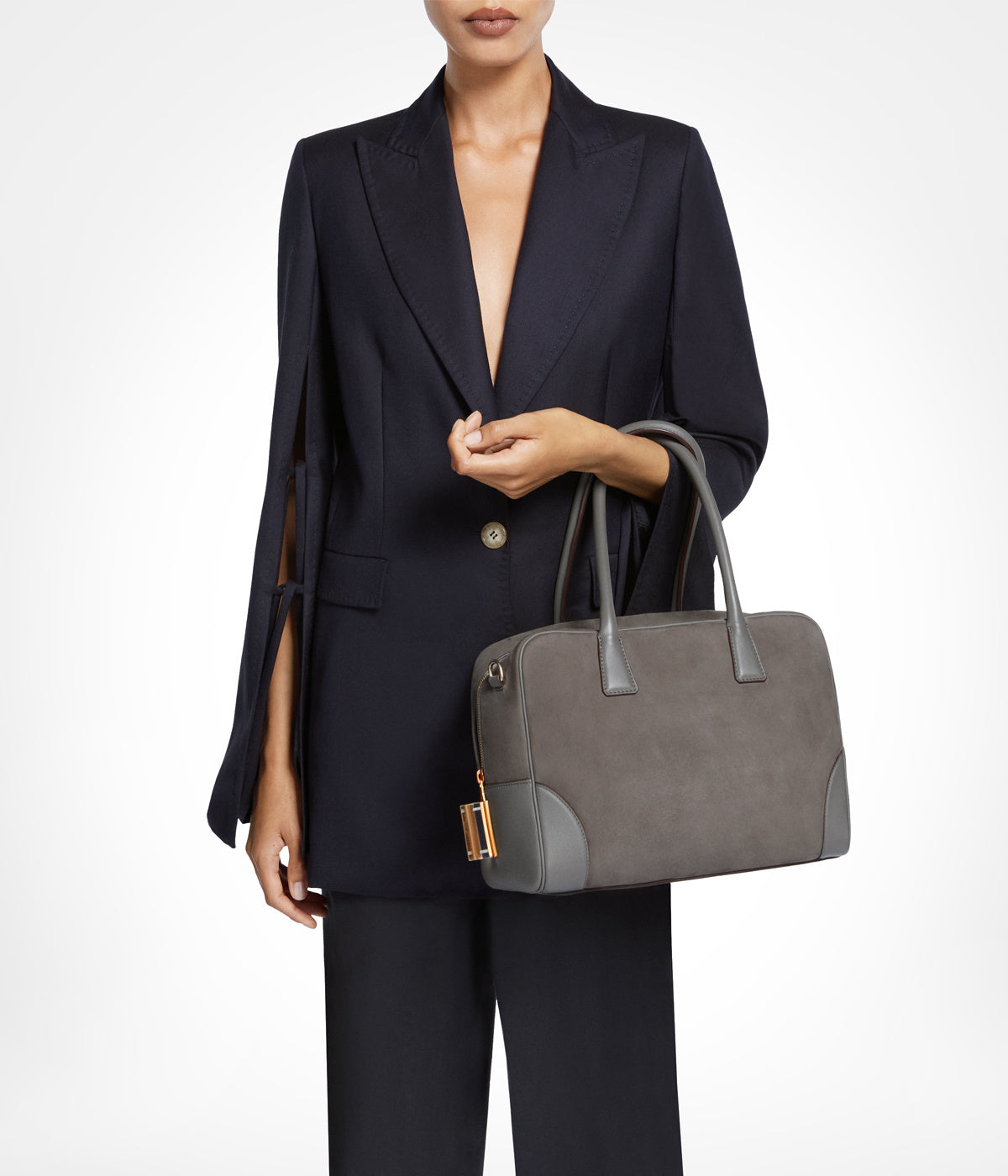 A travel/city bag in luxurious nubuck, in the classic “Boston” shape of the Cristallo Weekenders, lined in Alcantara. Adjustable shoulder strap, anodized brass hardware, Aviteur prism clasp.