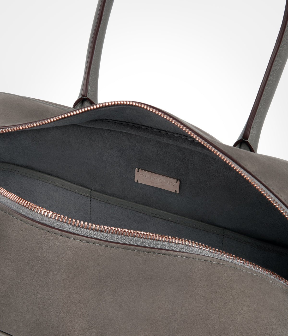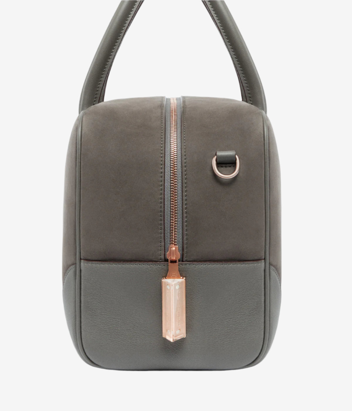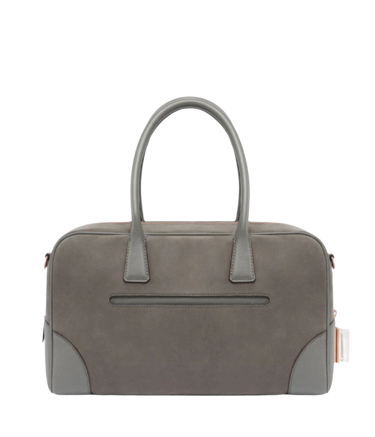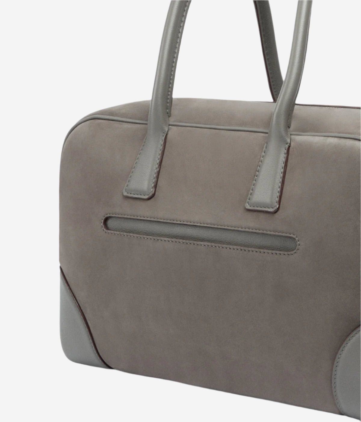 A travel/city bag in luxurious nubuck, in the classic “Boston” shape of the Cristallo Weekenders, lined in Alcantara. Adjustable shoulder strap, anodized brass hardware, Aviteur prism clasp.