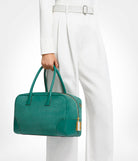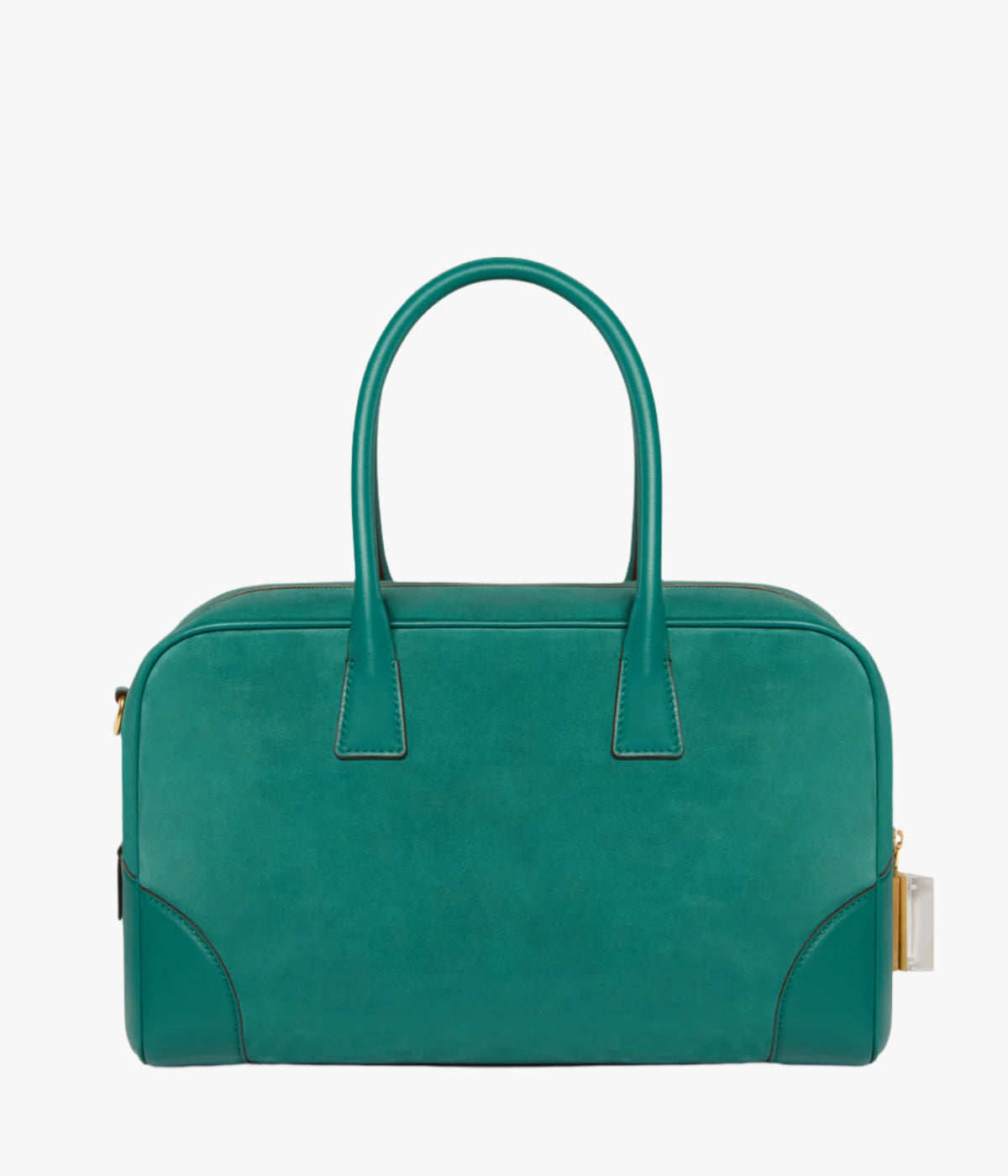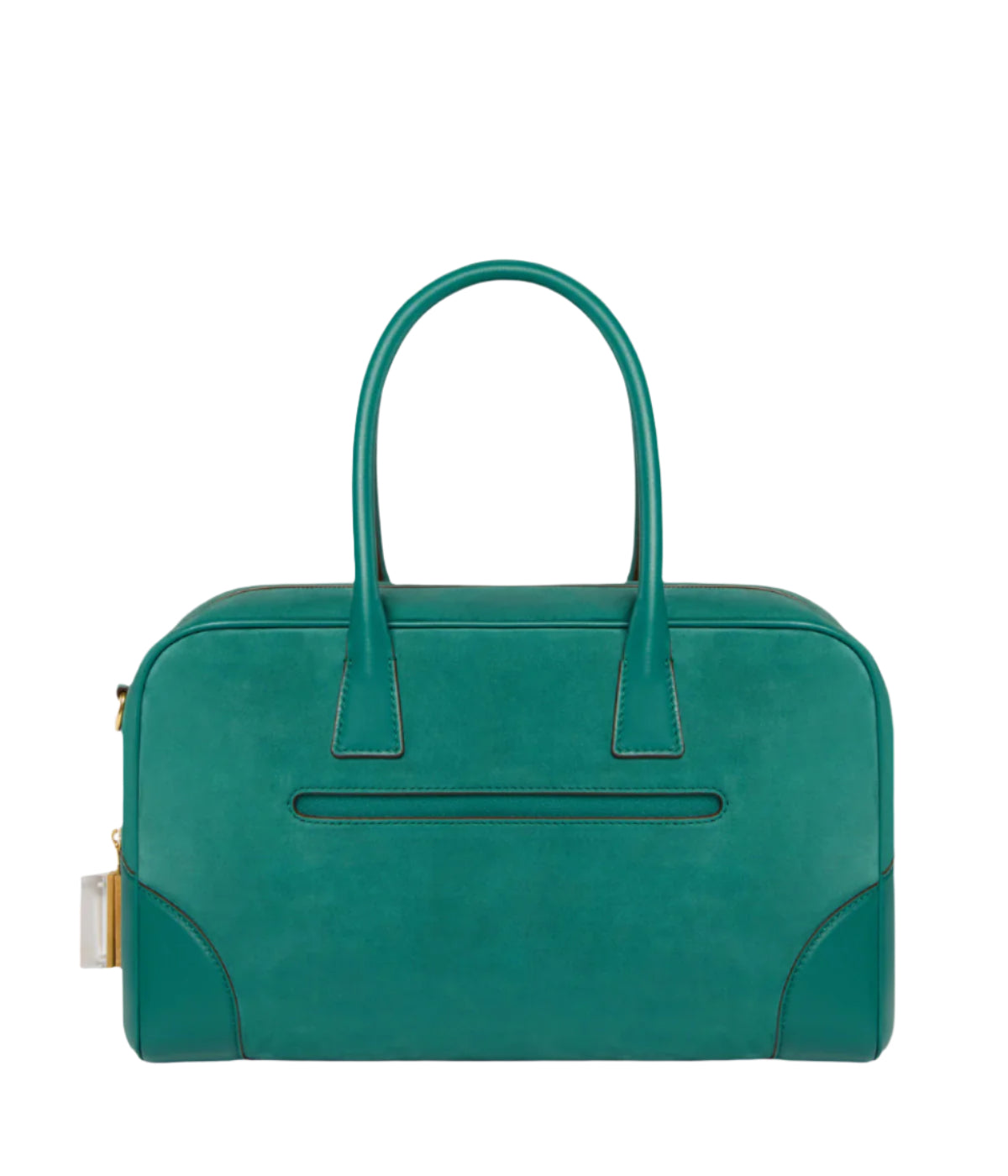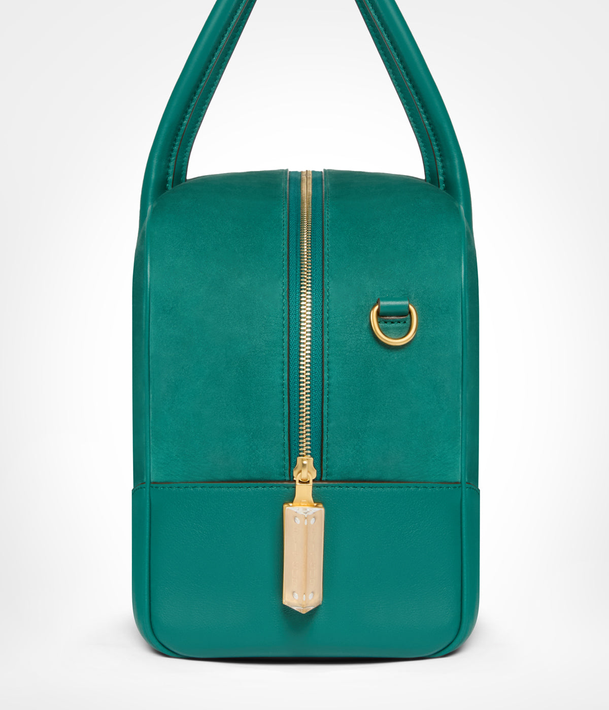 A travel/city bag in luxurious nubuck, in the classic “Boston” shape of the Cristallo Weekenders, lined in Alcantara. Adjustable shoulder strap, anodized brass hardware, Aviteur prism clasp.