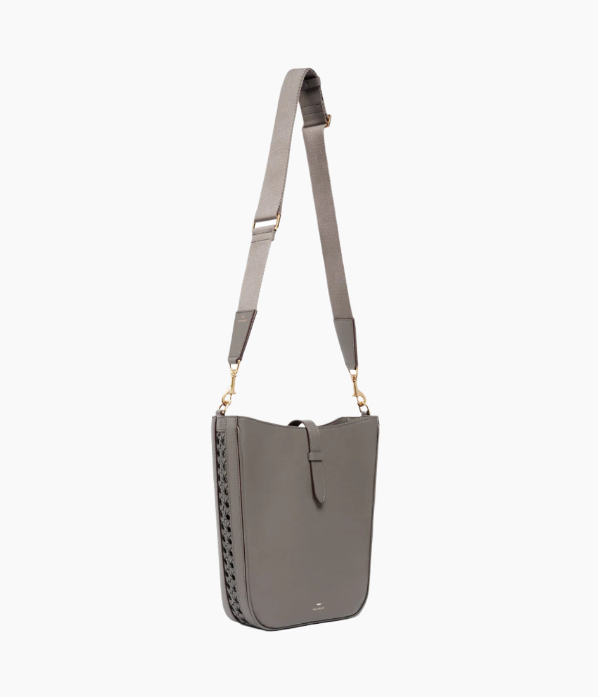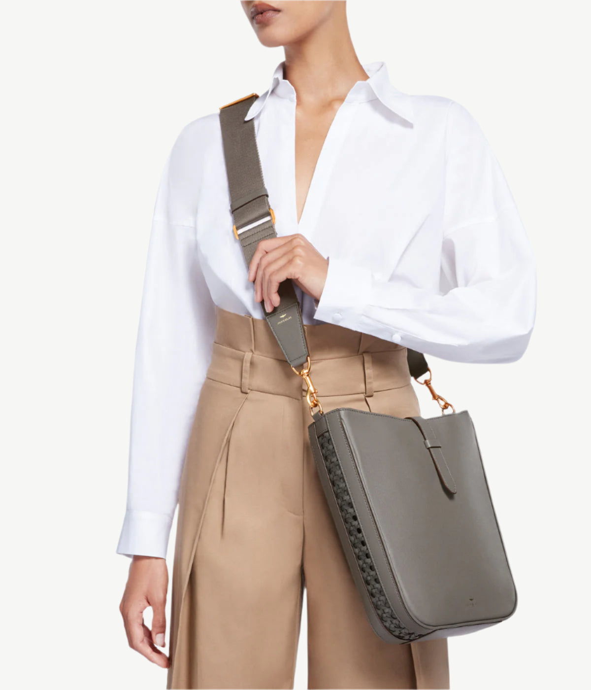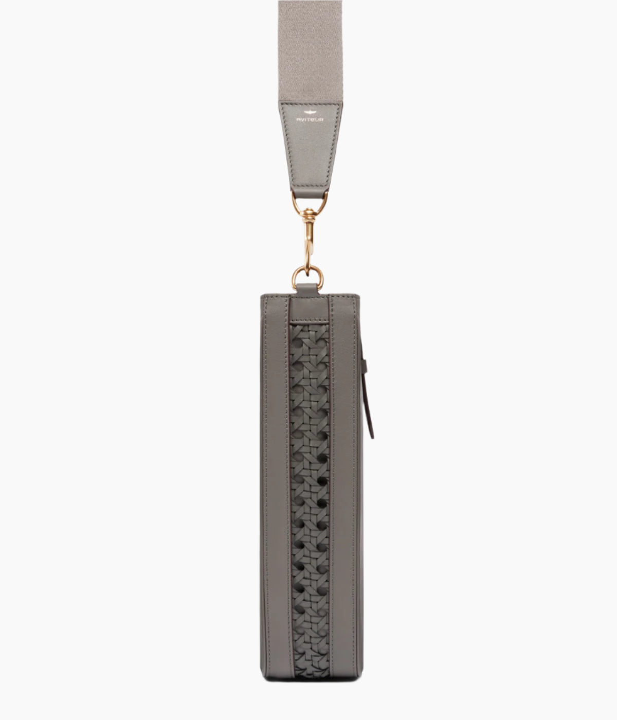 Shoulder bag in calfskin with signature weave.  Shoulder strap, suede-like washable microfibre lining, interior zipped compartment.