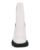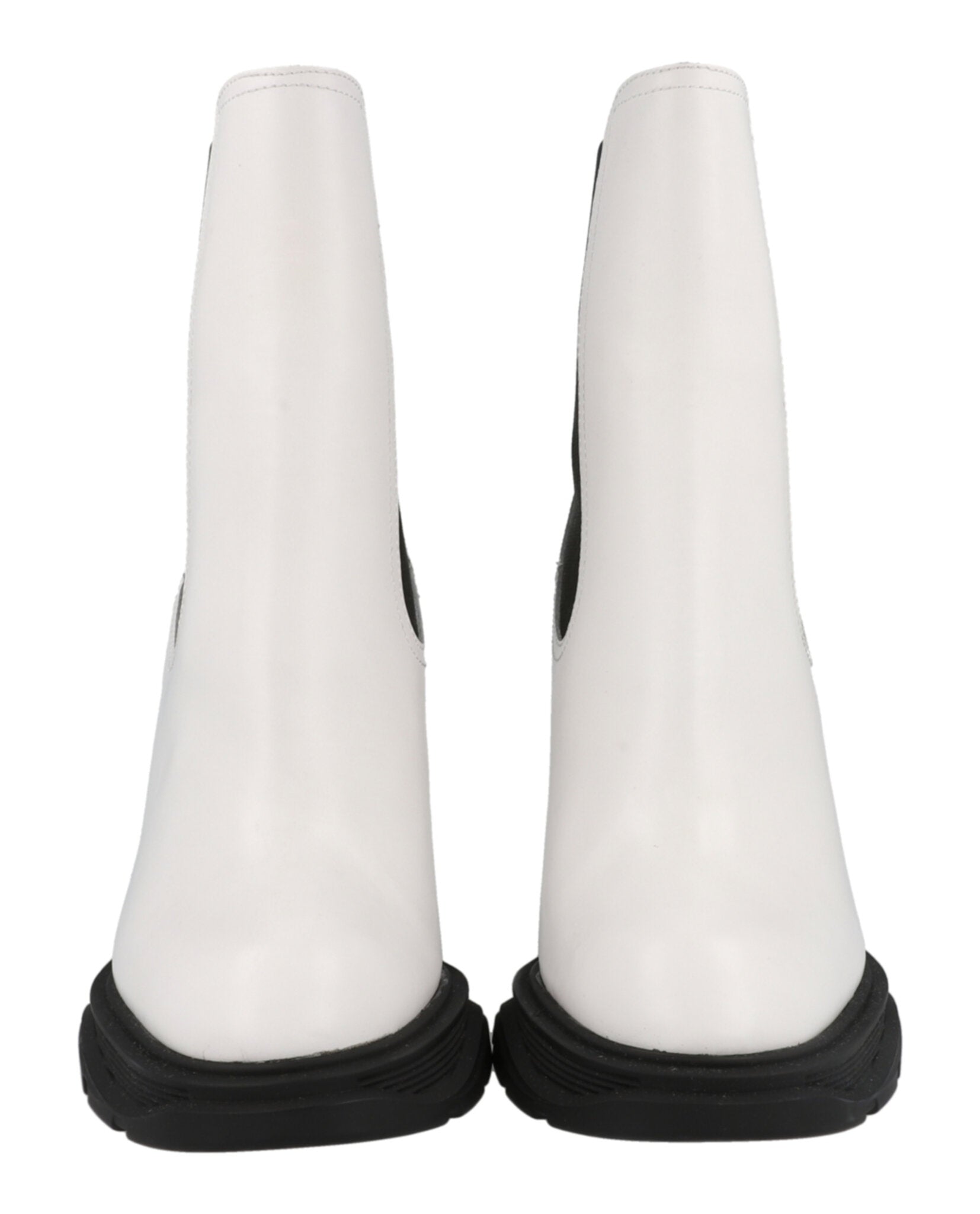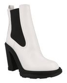 Elevate your everyday style with these sophisticated Alexander McQueen Leather Heeled Chelsea Boots. Crafted from luxurious 100% calfskin leather in a chic cream colorway with contrasting black elastic side panels, these ankle boots feature a sleek almond toe and substantial 4.1875" block heel.