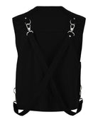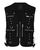 The front zip closure and V-neck silhouette create a sleek, modern look, while the removable suspenders and silver-tone D-rings add an edgy, fashion-forward touch. With two front flap pockets, two patch pockets, and four additional zip pockets, this vest offers both style and functionality.