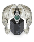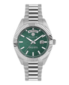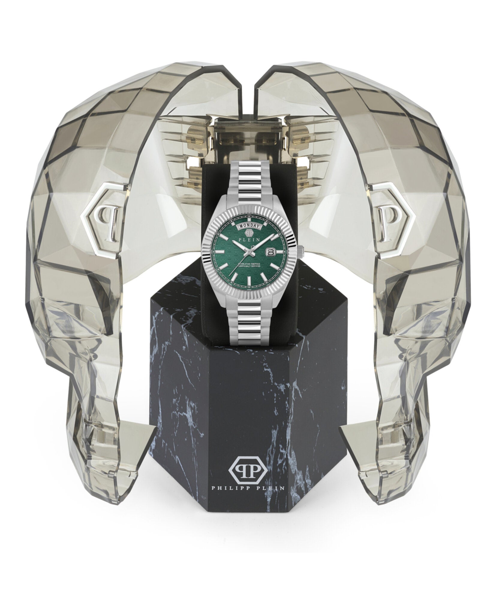 Elevate your wrist game with the Philipp Plein Date Superlative Bracelet Watch, a stunning timepiece that combines luxury craftsmanship with contemporary style. This sophisticated watch features a striking green guilloche dial with day-date functionality, housed in a robust 42mm stainless steel case with an elegant fluted bezel.