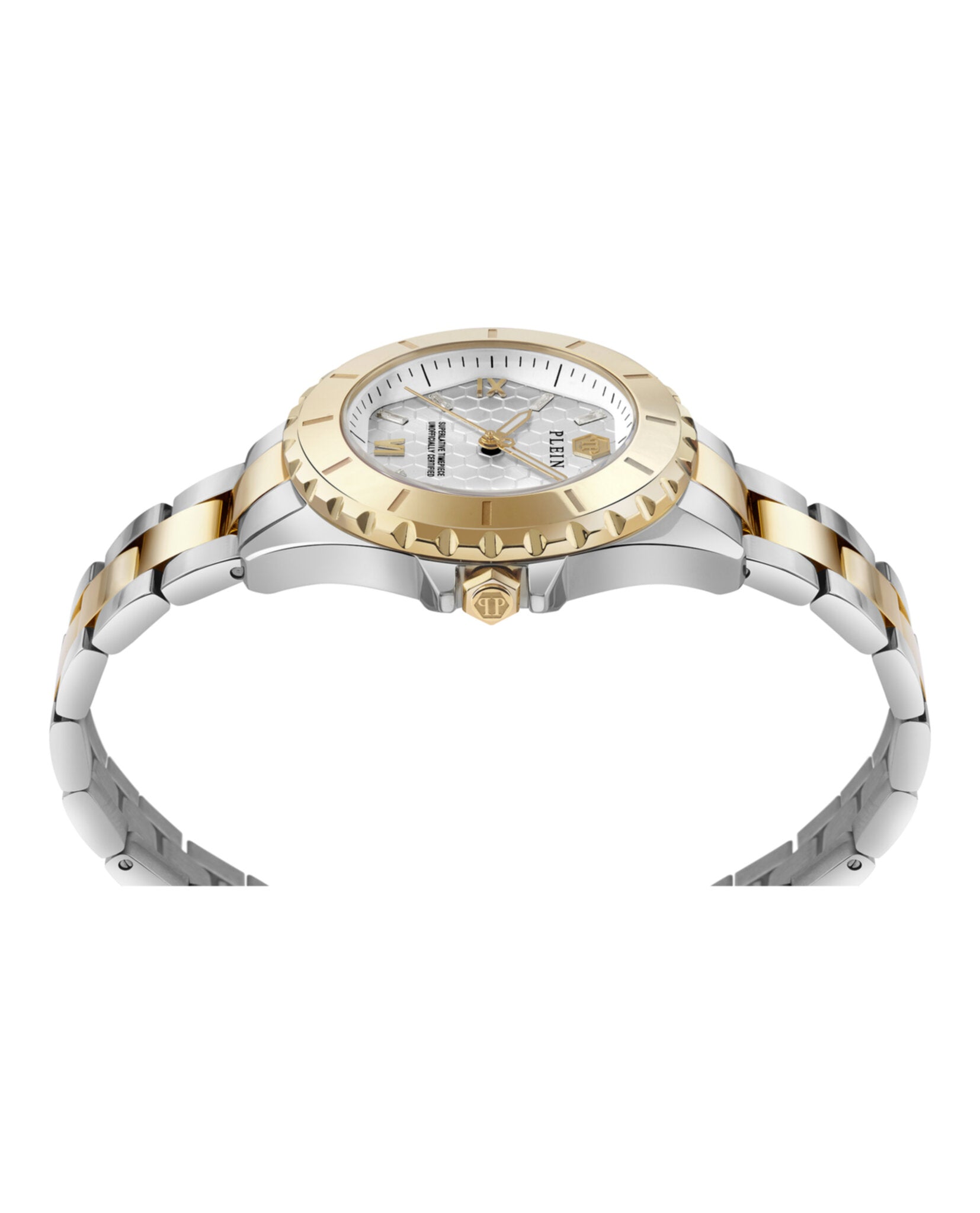 Elevate your wrist game with the Philipp Plein Plein Heaven Bracelet Watch, a stunning timepiece that seamlessly blends luxury and functionality. This exquisite watch features a sophisticated two-tone case and bracelet design, complemented by a pristine white guilloche dial adorned with elegant Roman numerals and eight sparkling Preciosa crystals.