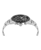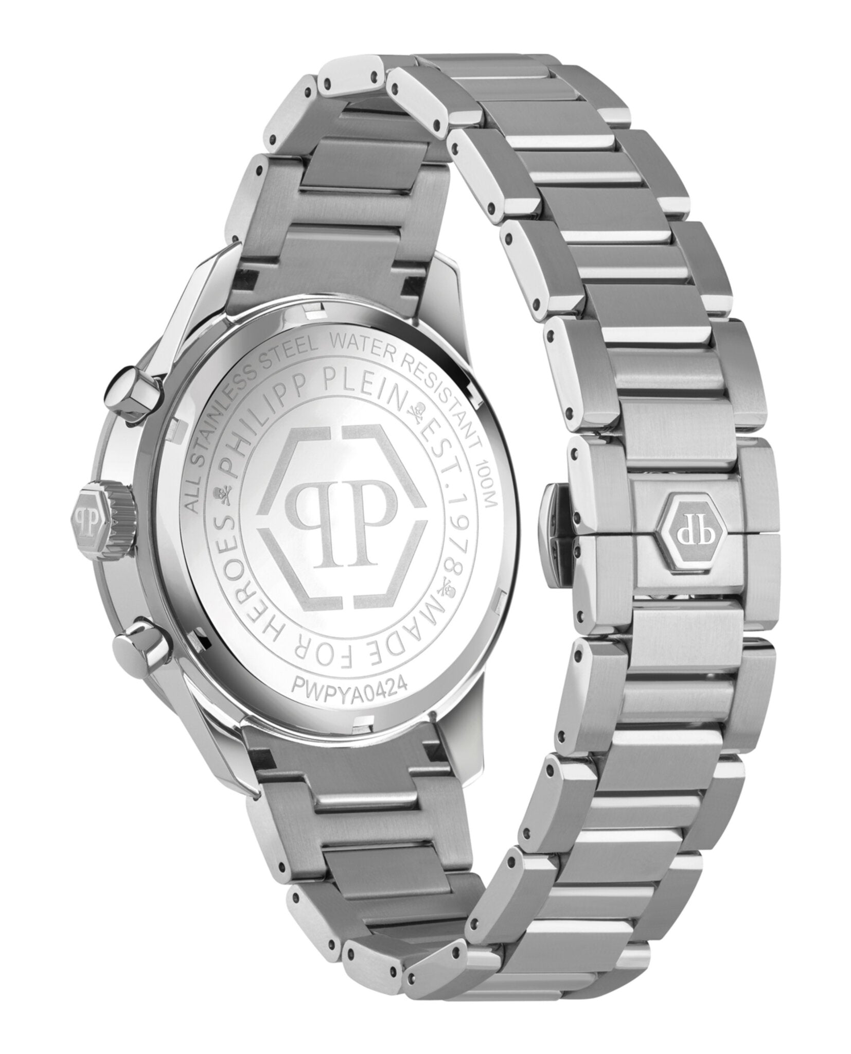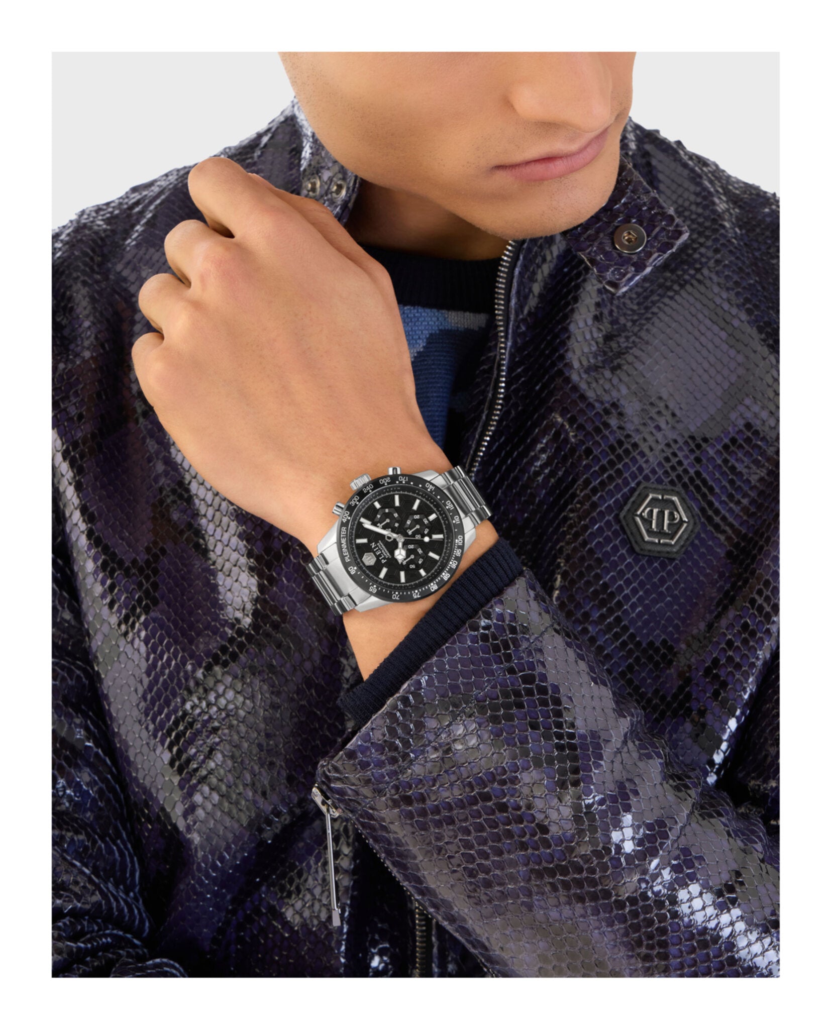 This sophisticated timepiece features a 44mm stainless steel case paired with a recycled stainless steel bracelet, showcasing Philipp Plein's commitment to both style and sustainability. The striking black guilloche dial houses chronograph subdials and a tachymeter bezel, offering both functionality and refined aesthetics.
