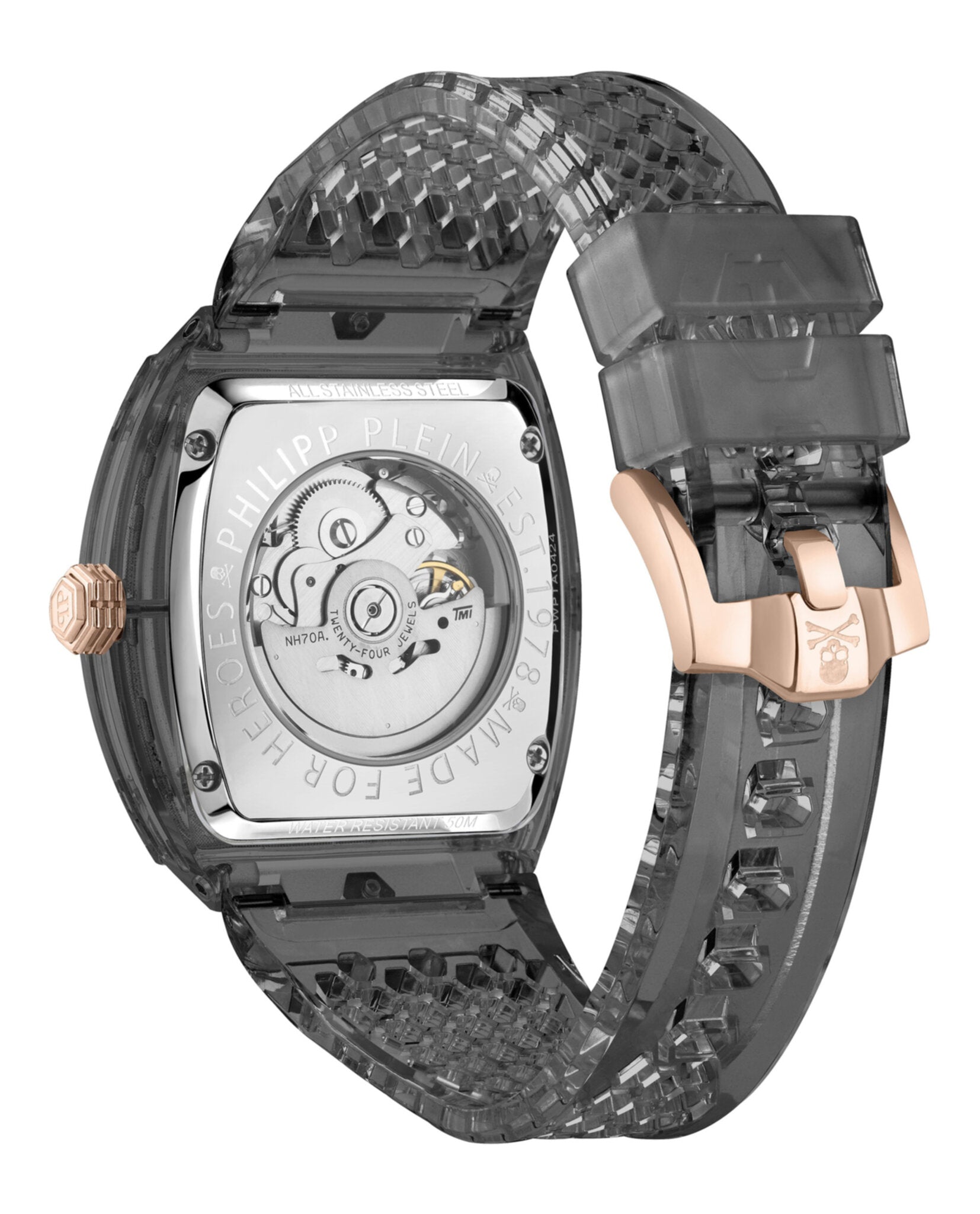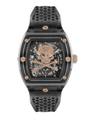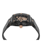 Introducing The $keleton Crystal Automatic Watch by Philipp Plein, a bold statement piece that merges haute horlogerie with edgy luxury design. This striking timepiece features a 3-hand automatic movement housed in a distinctive 44x56.2mm grey bio nylon case, showcasing an intricate grey skeleton dial that reveals the mechanical artistry within.