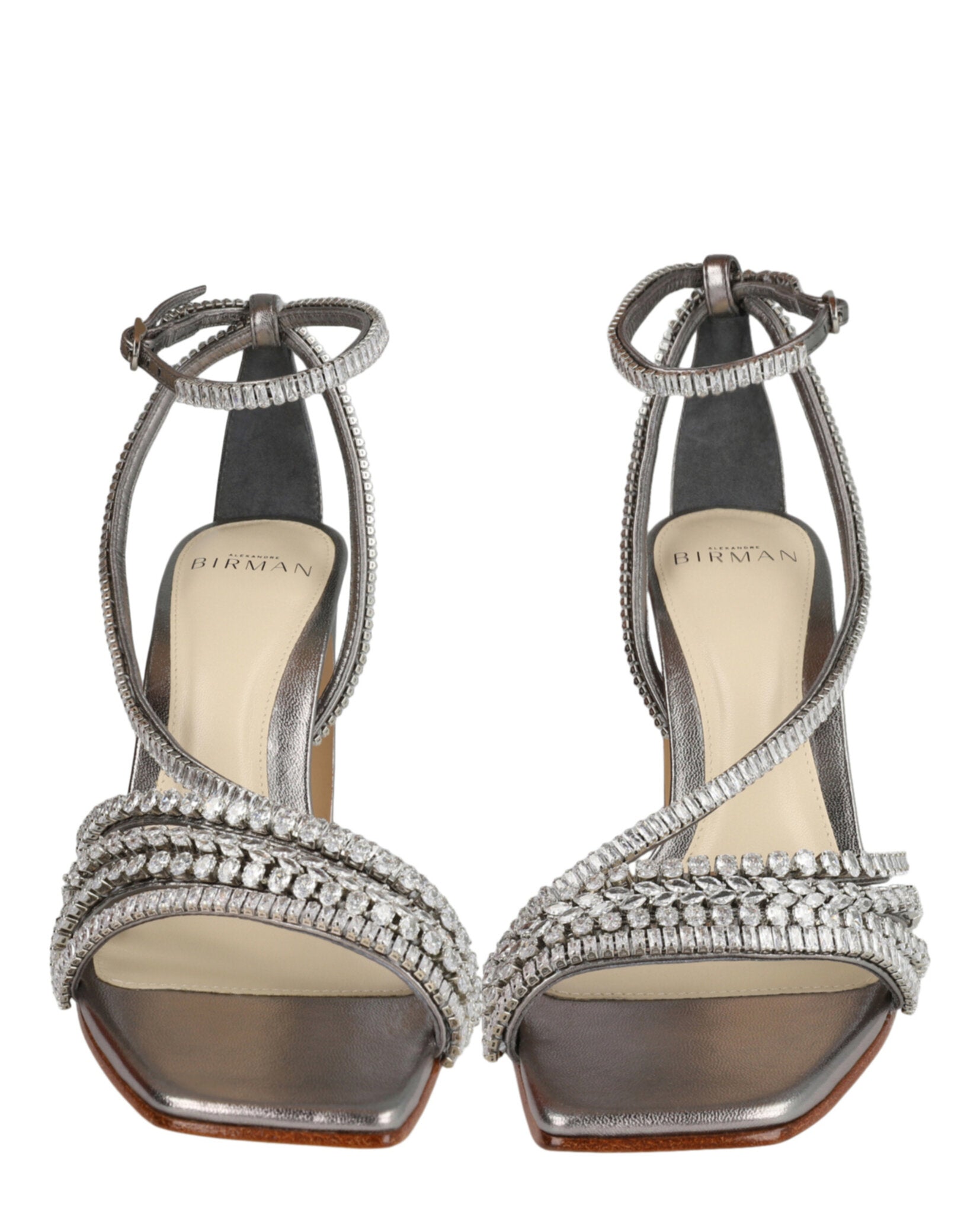 Elevate your evening look with the stunning Stacy Crystal-Embellished Heels by Alexandre Birman. These luxurious heels feature dazzling crystal embellishments and a sophisticated metallic construction that catches the light beautifully.