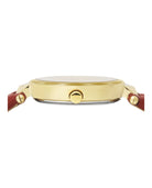 This exquisite watch features a 32mm IP yellow gold case paired with a rich red leather strap and matching red enamel dial, adorned with sparkling crystal accents that catch the light beautifully. The 2-hand quartz movement ensures precise timekeeping, while the ardillon buckle provides secure and comfortable wear.