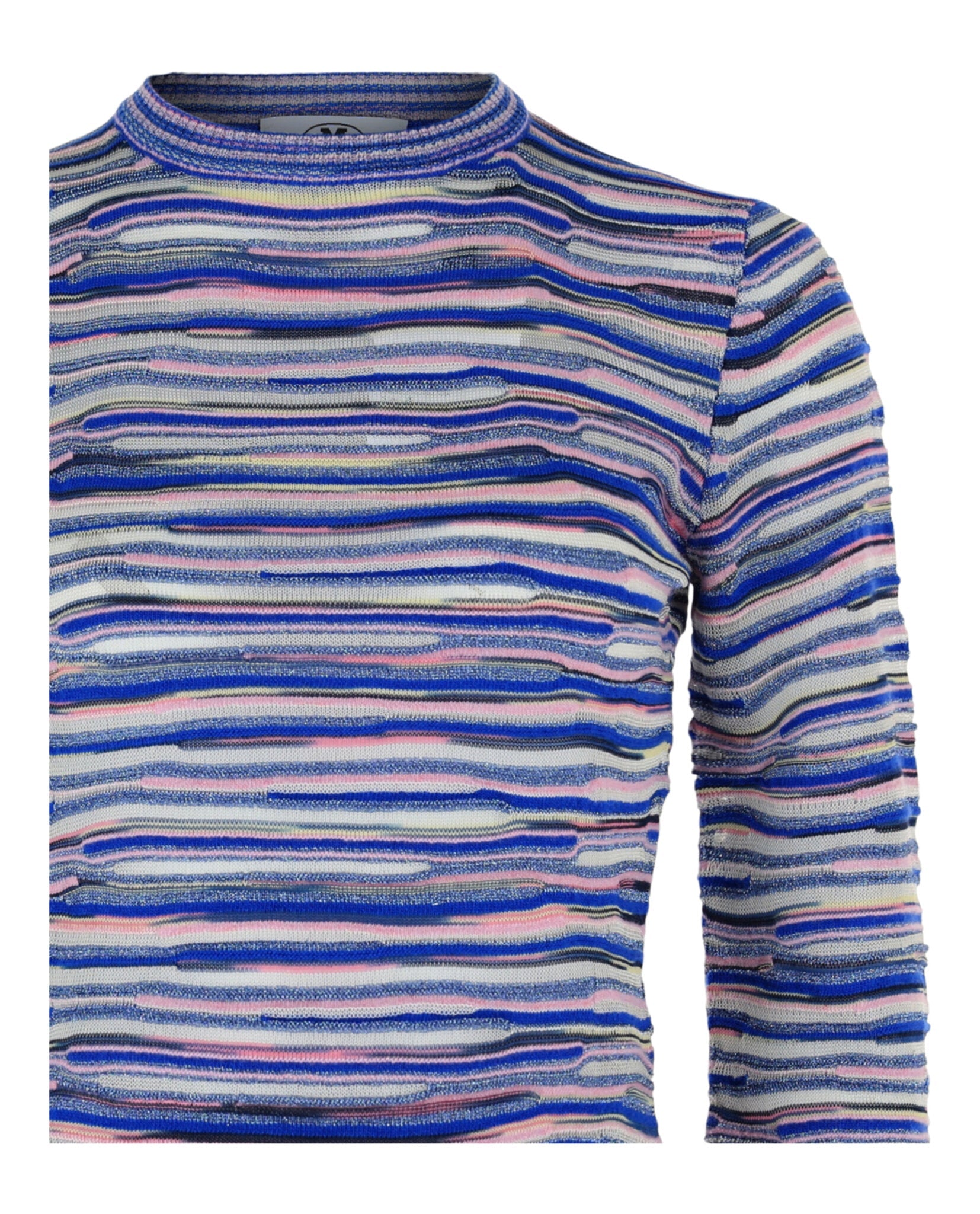 - Features an undulating striped pattern and multitonal color palette woven with metallic fibers throughout