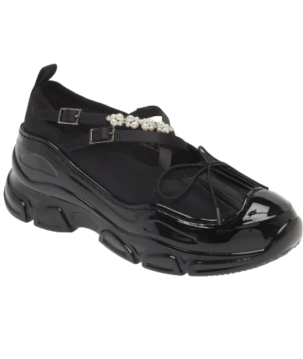 Elegant bow accents and lustrous pearl-inspired embellishments infuse designer sophistication into this substantial, multi-textured sneaker. Built on a deeply ridged sole for superior traction, it features an adjustable buckle strap for personalized comfort. The textile exterior, leather-lined interior, and synthetic sole combine practicality with polished style.