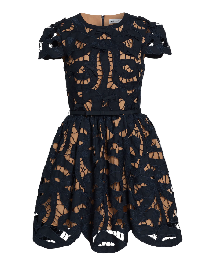 This Self-Portrait minidress combines timeless elegance with contemporary design. Constructed from crisp cotton poplin, it features a precisely tailored fitted bodice that flows into a voluminous gathered skirt, creating a flattering silhouette.