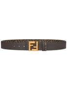 This exquisite belt features rich brown leather with Fendi's iconic FF logo pattern subtly embossed throughout, while the statement squared gold-tone FF buckle adds an unmistakable touch of designer elegance.