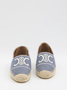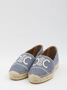 LES ESPADRILLES IN BLUE AND BEIGE STRIPED FABRIC. FEATURING ALMOND TOE, EMBROIDERED TRIOMPHE LOGO, HAND-STITCHED UPPER TO THE SOLE, AUTHENTIC JUTE INSOLE WITH PADDED LEATHER INSERT. SLIP-ON STYLE. DUSTBAG INCLUDED.