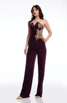 The Beck Jumpsuit boasts a strapless v-neck design and wide leg silhouette, adorned with exquisite gold embellishments on the bodice.
