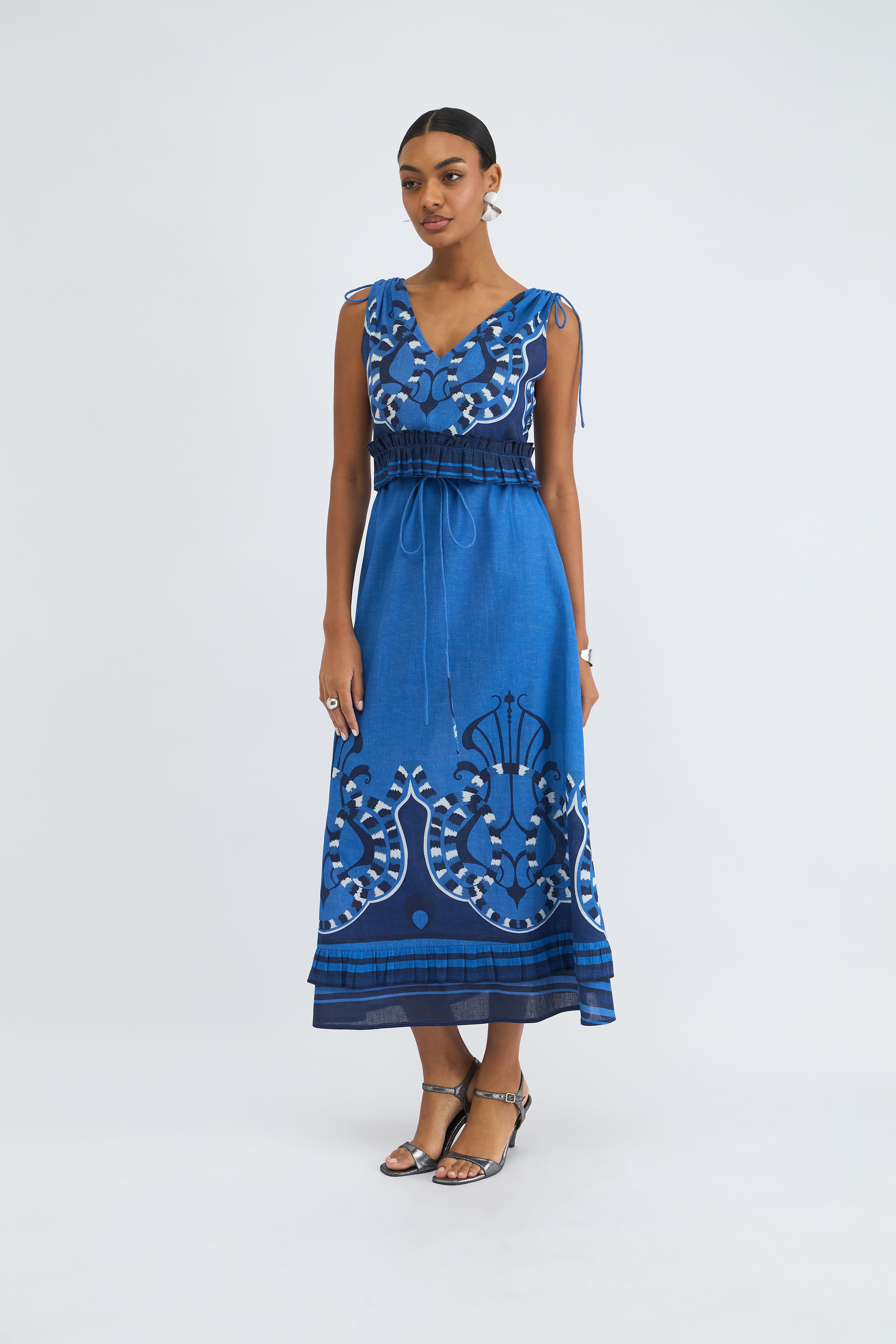 Stay cool and stylish in this airy dress, designed with drawstring ties at the shoulders for a customizable fit. The chic A-line silhouette is enhanced by delicate ruffle details, making it a versatile piece that transitions seamlessly from casual days in sandals to elegant evenings in heels.