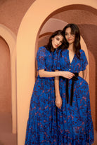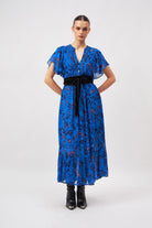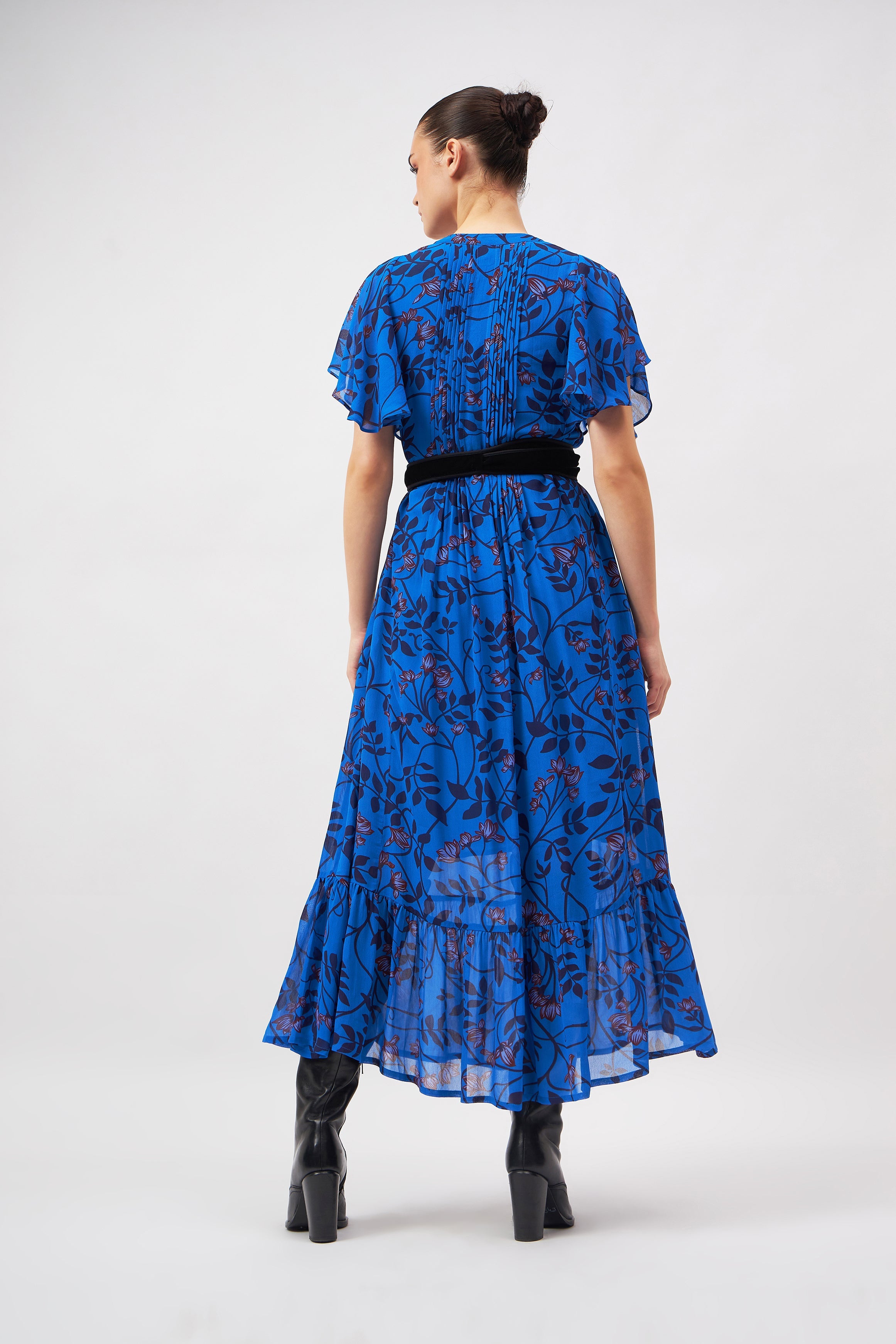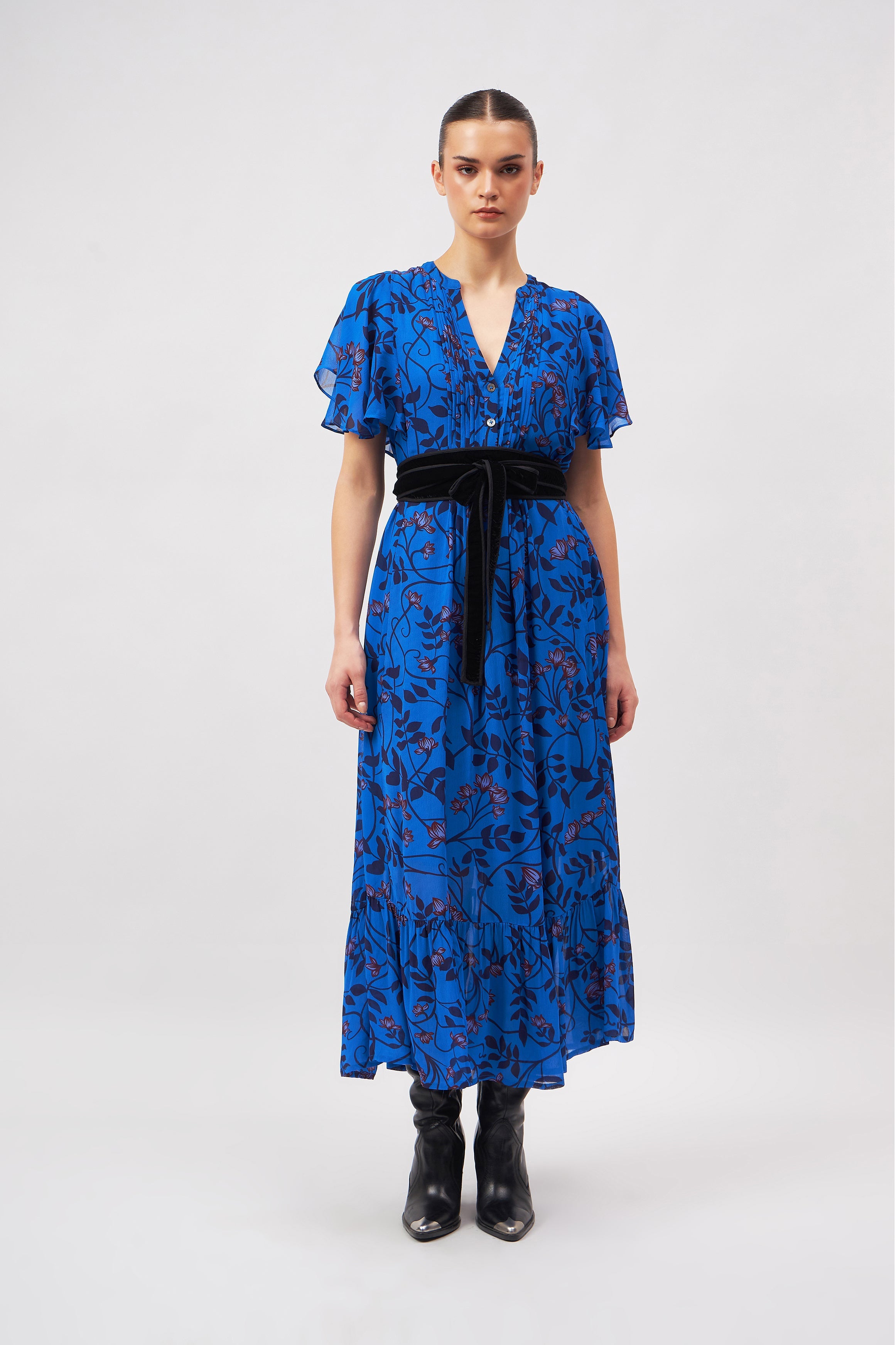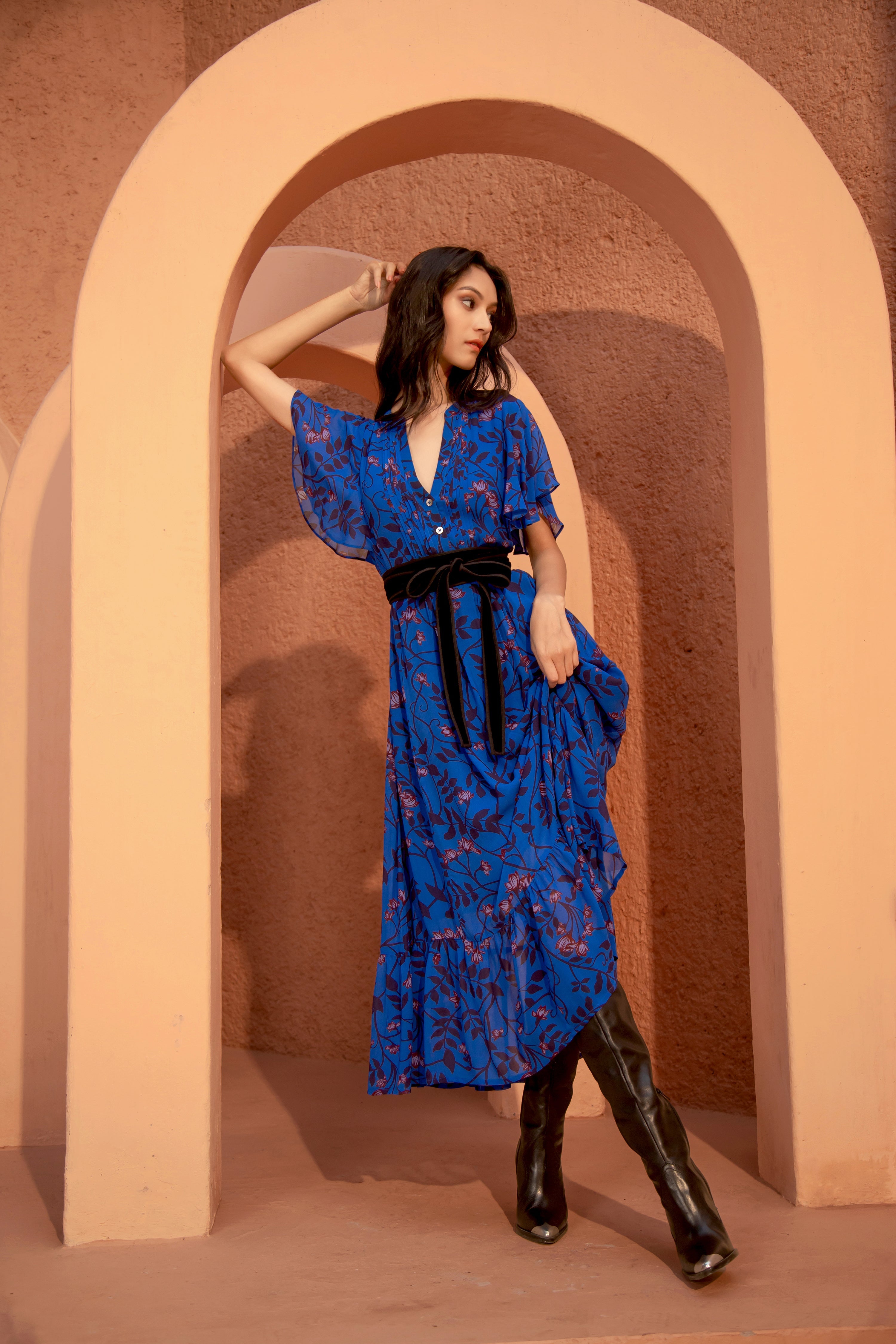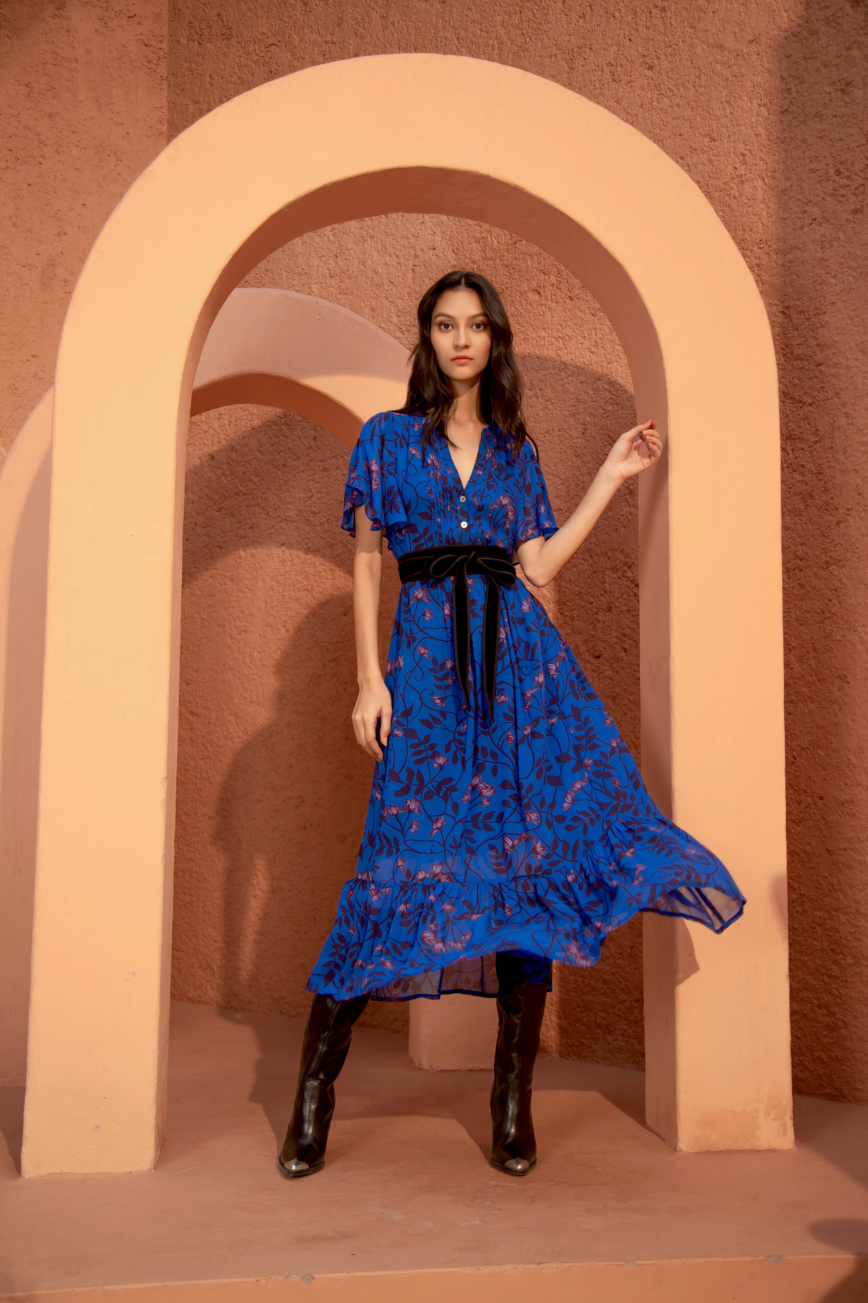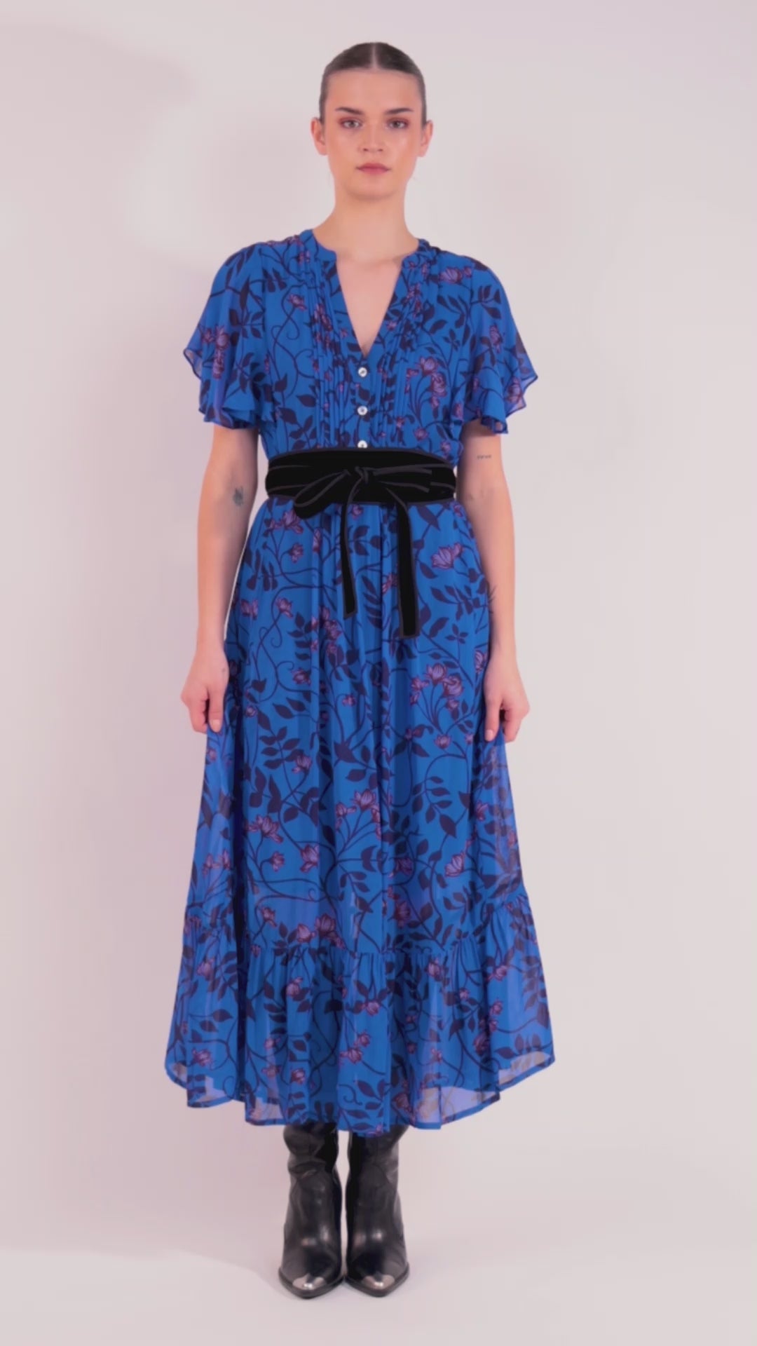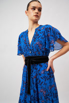 It's all in the details: Leni features subtle pleats on the bodice, silhouette-enhancing flutter sleeves and a ruffled hem. Cut loose for a universally flattering fit, the featured Obi belt gives you the flexibility to highlight your waist as desired. The artwork references Jardin Majorelle, an iconic botanical garden in Marrakesh designed by a French painter. The print captures the vibrant hues of the garden's structures, entwined with the lush greens and exotic flora that define this Moroccan oasis.