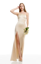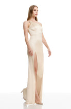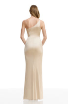 The Amy is a body-hugging floor-length gown made of classic crepe. This elegant gown features an asymmetrical neckline that highlights the shoulders and decolletage. The long trumpet skirt and fitted bodice, which hugs the bust, waist, and hips, helps to create a gorgeous hourglass shape. This gown is flattering and versatile for any formal event.
