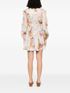 Embrace effortless elegance with the Ascension Dress by Zimmermann. This stunning mini dress features a beautiful floral print in soft yellow, pink, and green hues against a crisp white backdrop, perfect for warm-weather occasions.