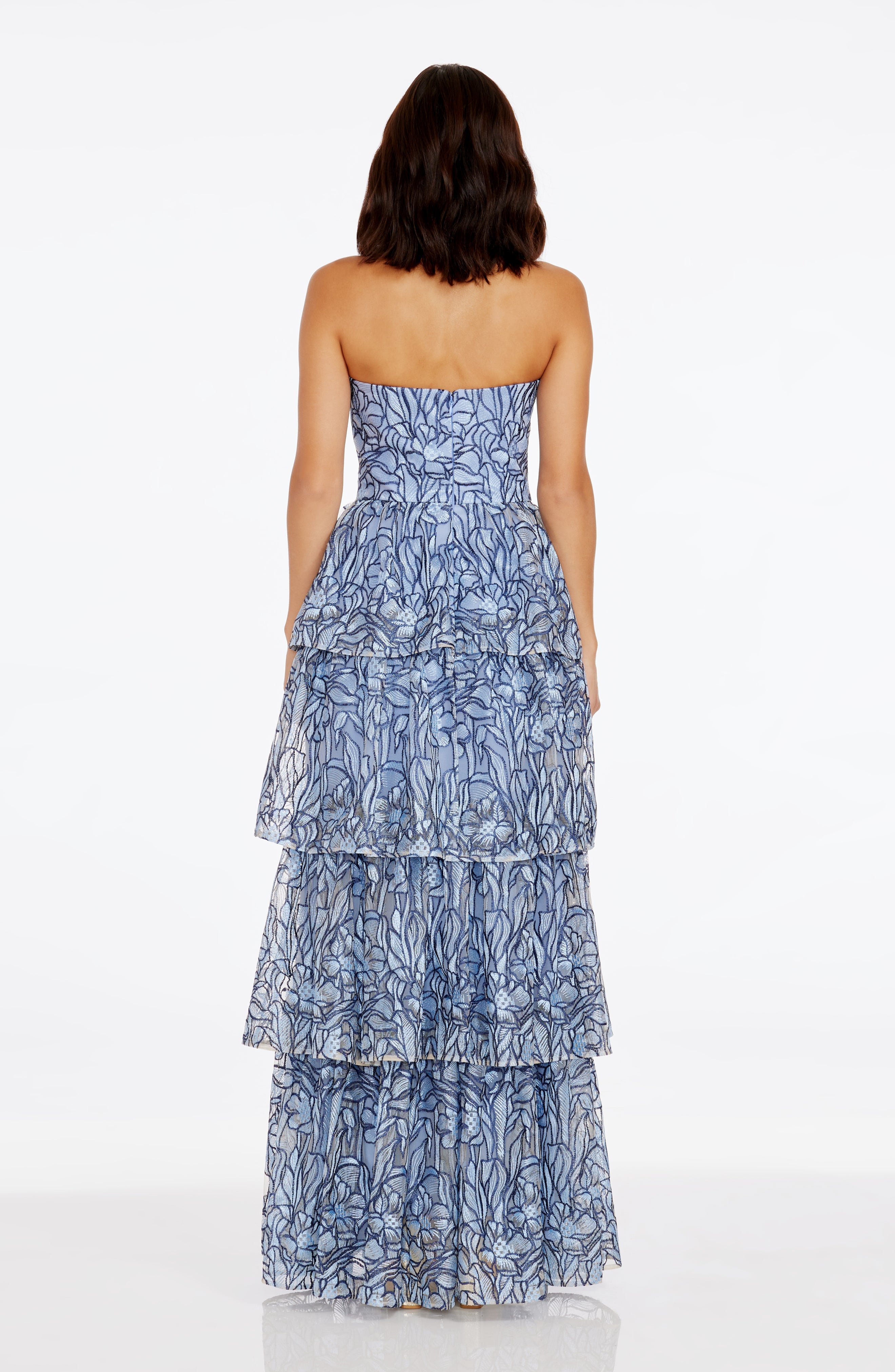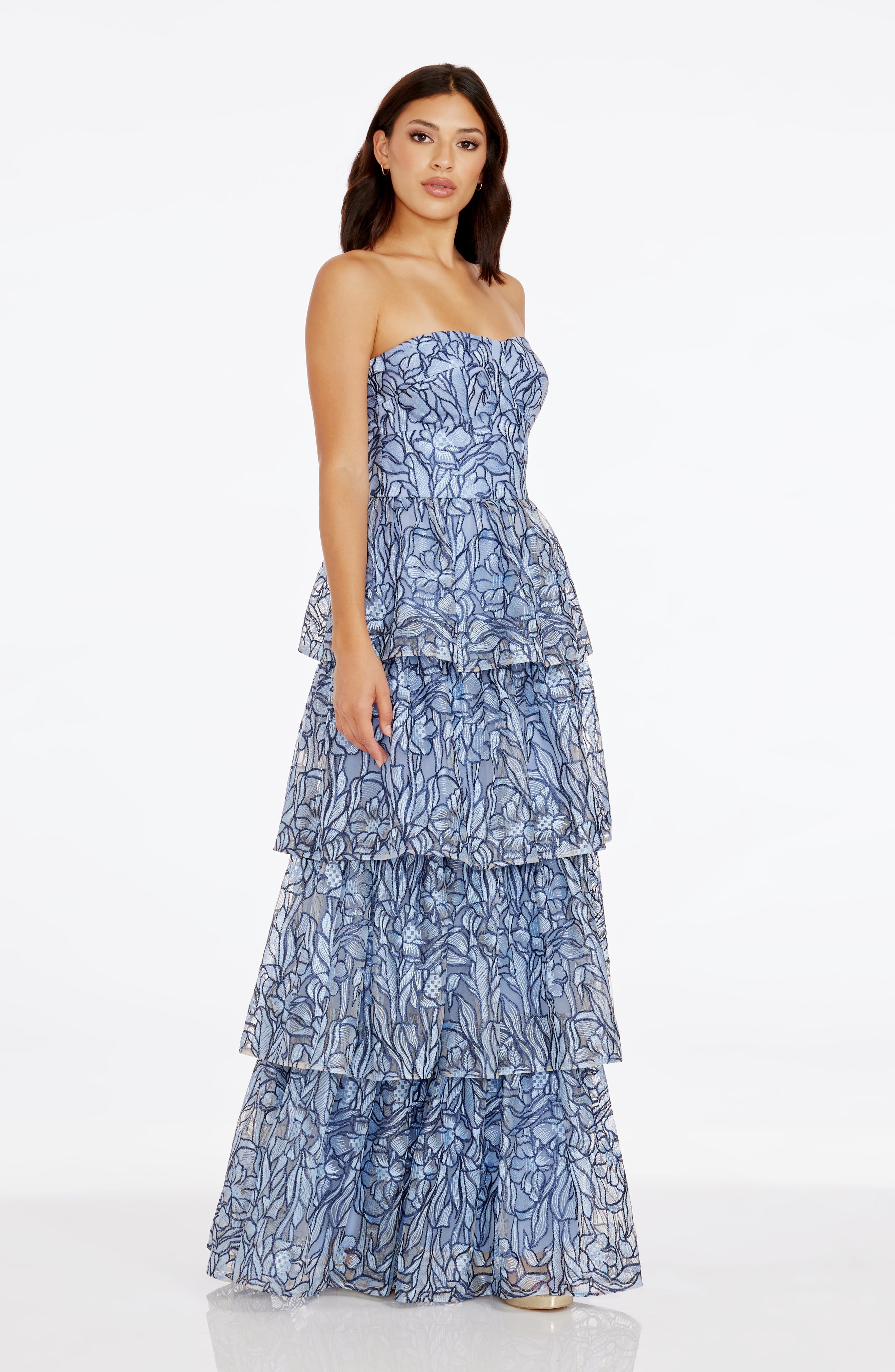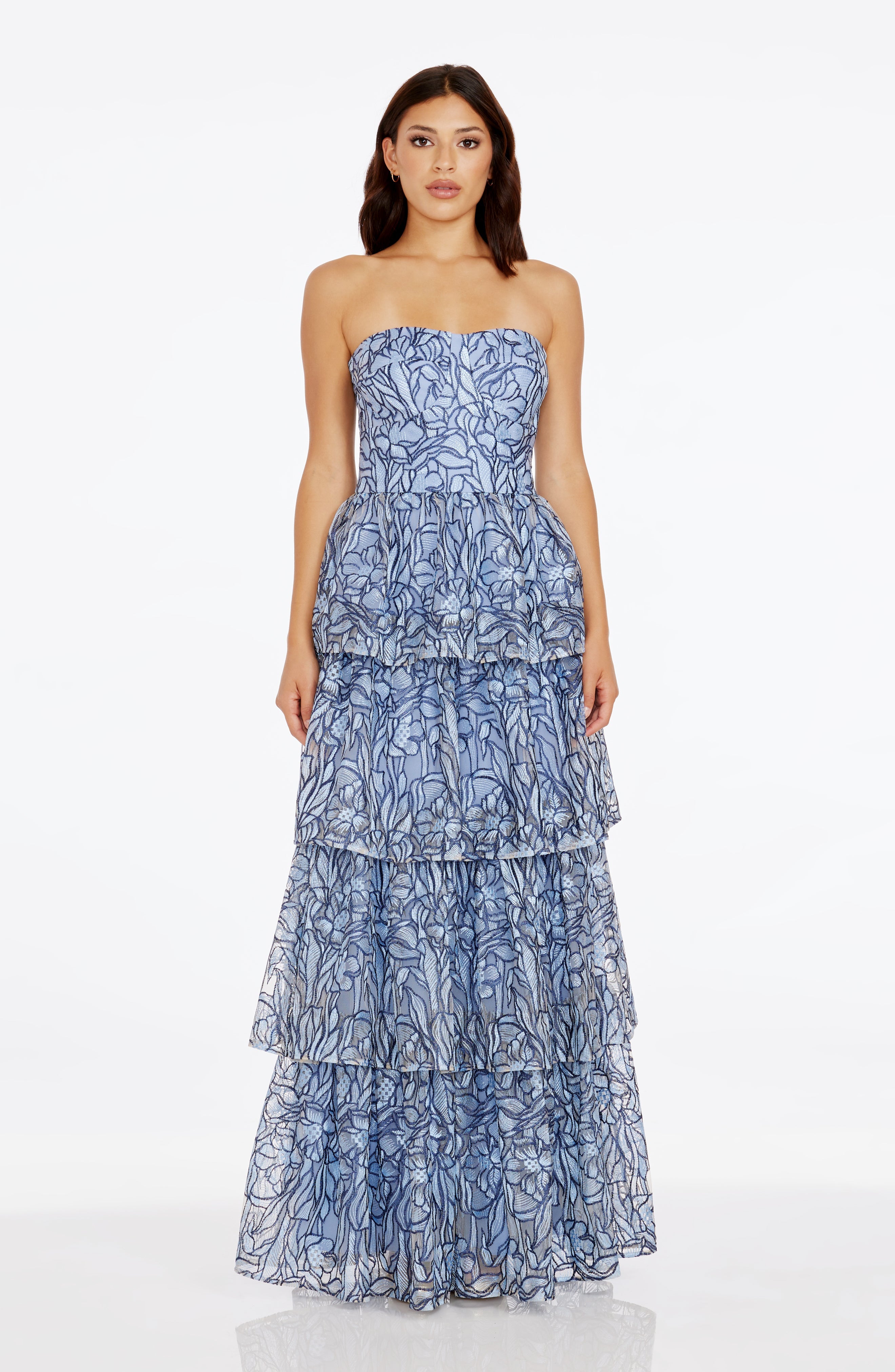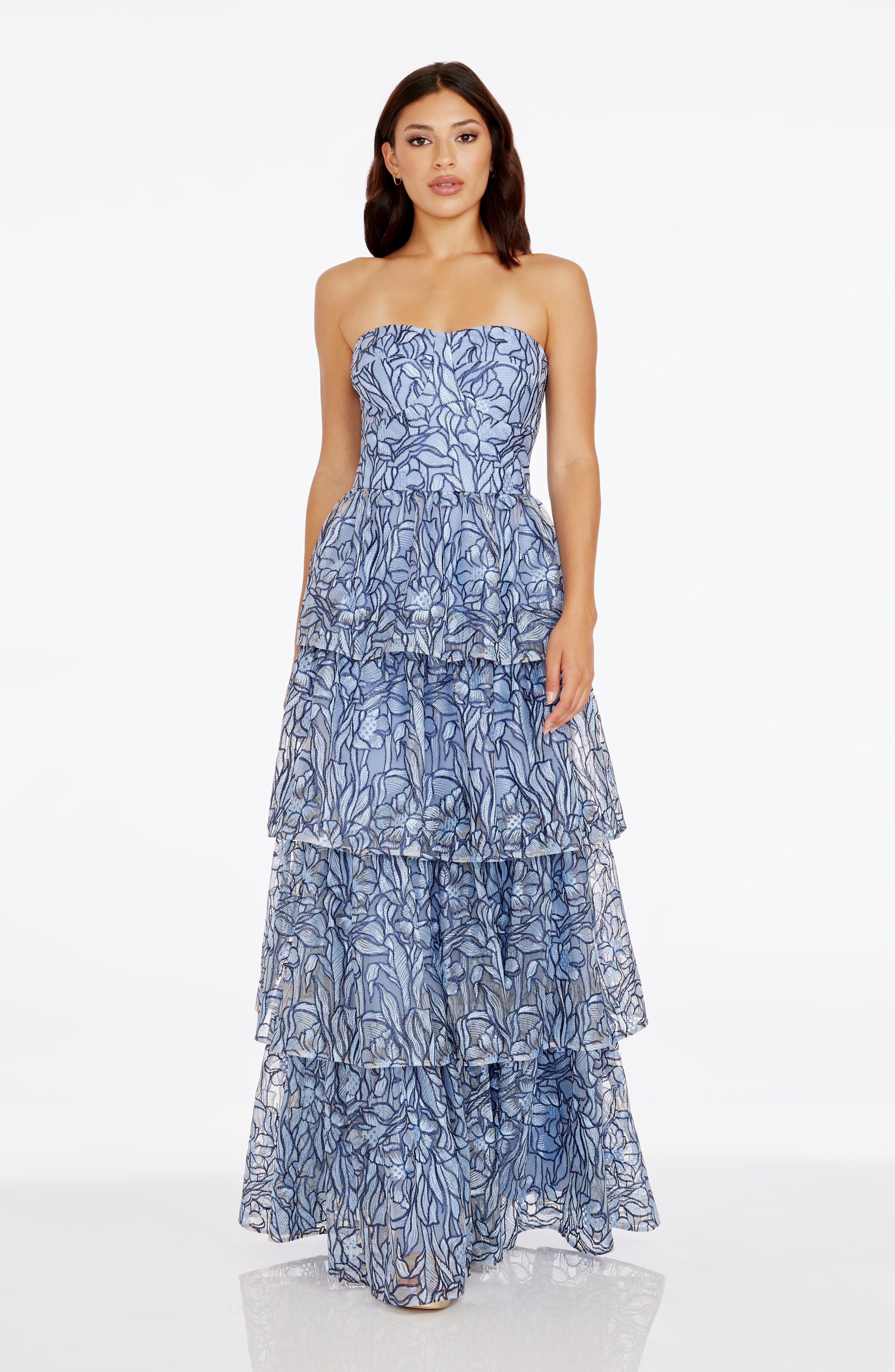 This stunning Aubriella Dress boasts a strapless sweetheart bodice and a tiered skirt, creating a beautiful and elegant gown.