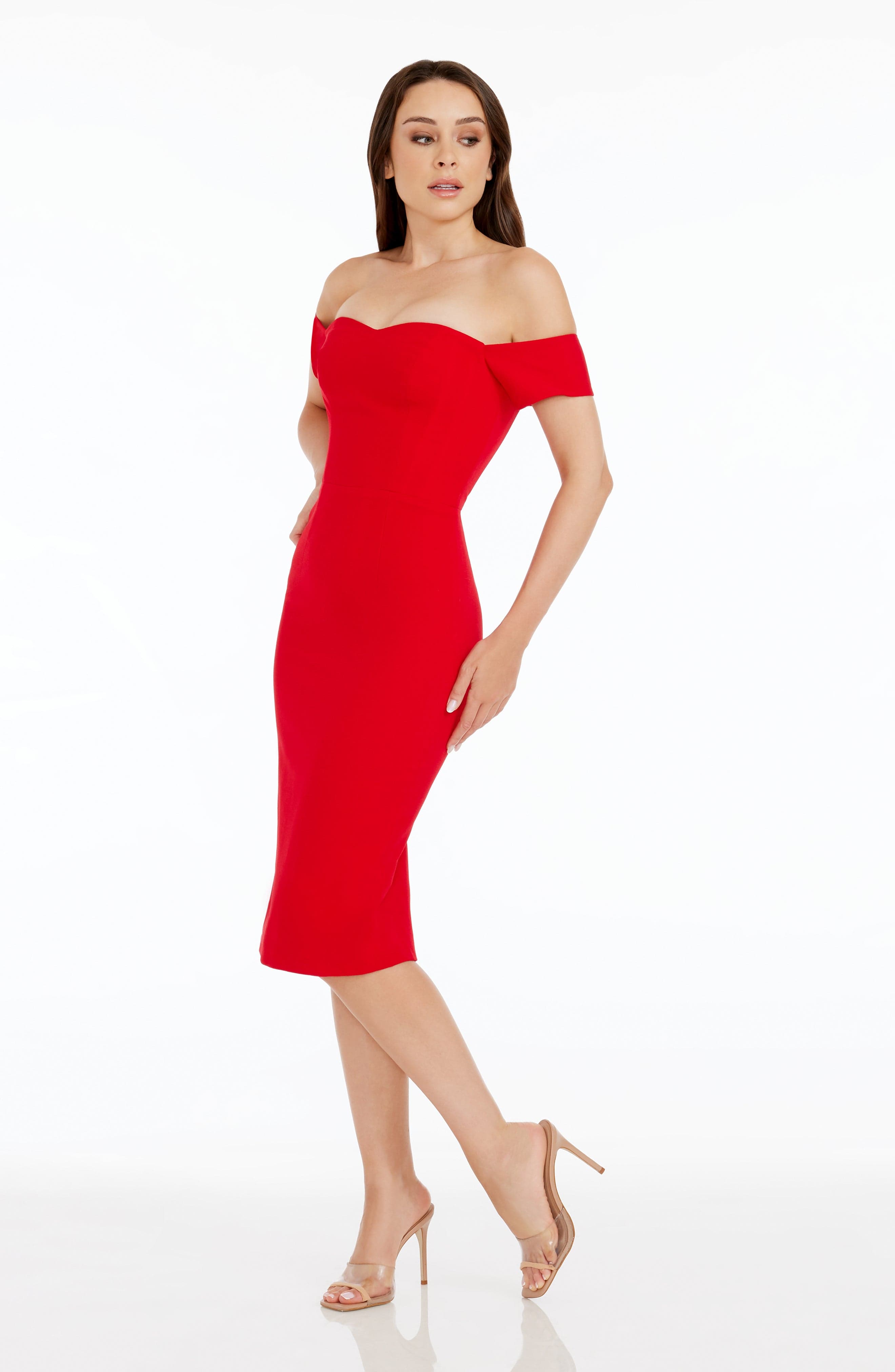 Flaunt a cold shoulder in the form-fitting Bailey dress. With off-the-shoulder cap sleeves and a semi-sweetheart neckline, this beautiful dress in our classic crepe fabric will flatter your figure. The slit in the back of the snug pencil-shaped skirt adds a flirty touch to this sophisticated cocktail dress in Rouge.
