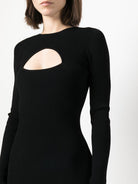 This striking DSQUARED2 cut-out mini dress combines edgy sophistication with contemporary style. The form-fitting black ribbed knit silhouette features an eye-catching crossed cut-out detail at the chest, creating a bold statement piece that's perfect for making an impression.