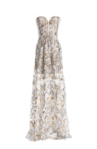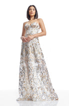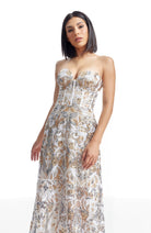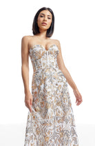 Indulge in the timeless elegance of our strapless sweetheart bustier fit and flare gown, complete with convenient sheer pockets.