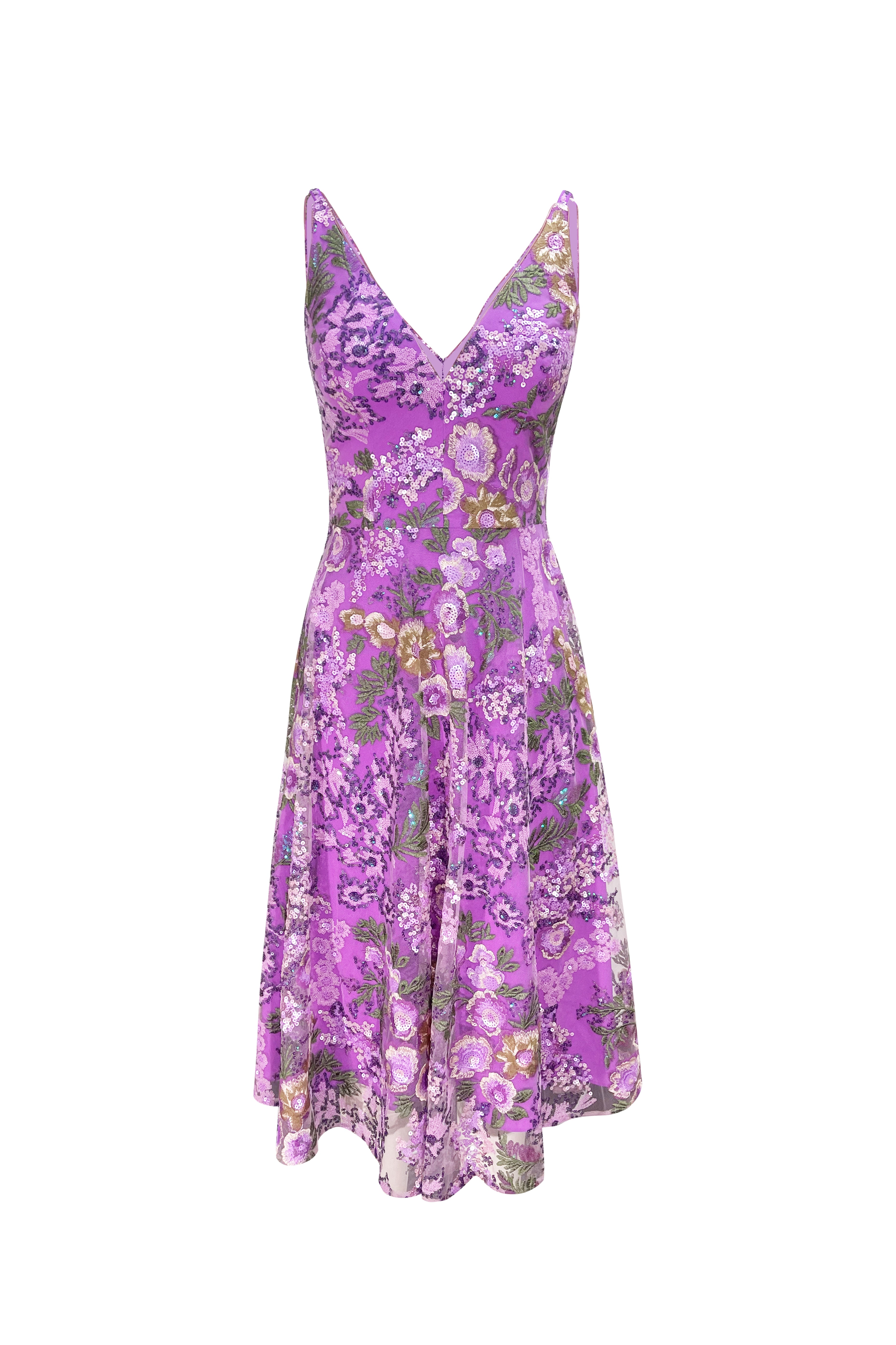 This flattering fit and flare sleeveless dress features thin straps and a plunging neckline. A playful scalloped lace hem on the cocktail-length skirt makes for a modern romance finish.