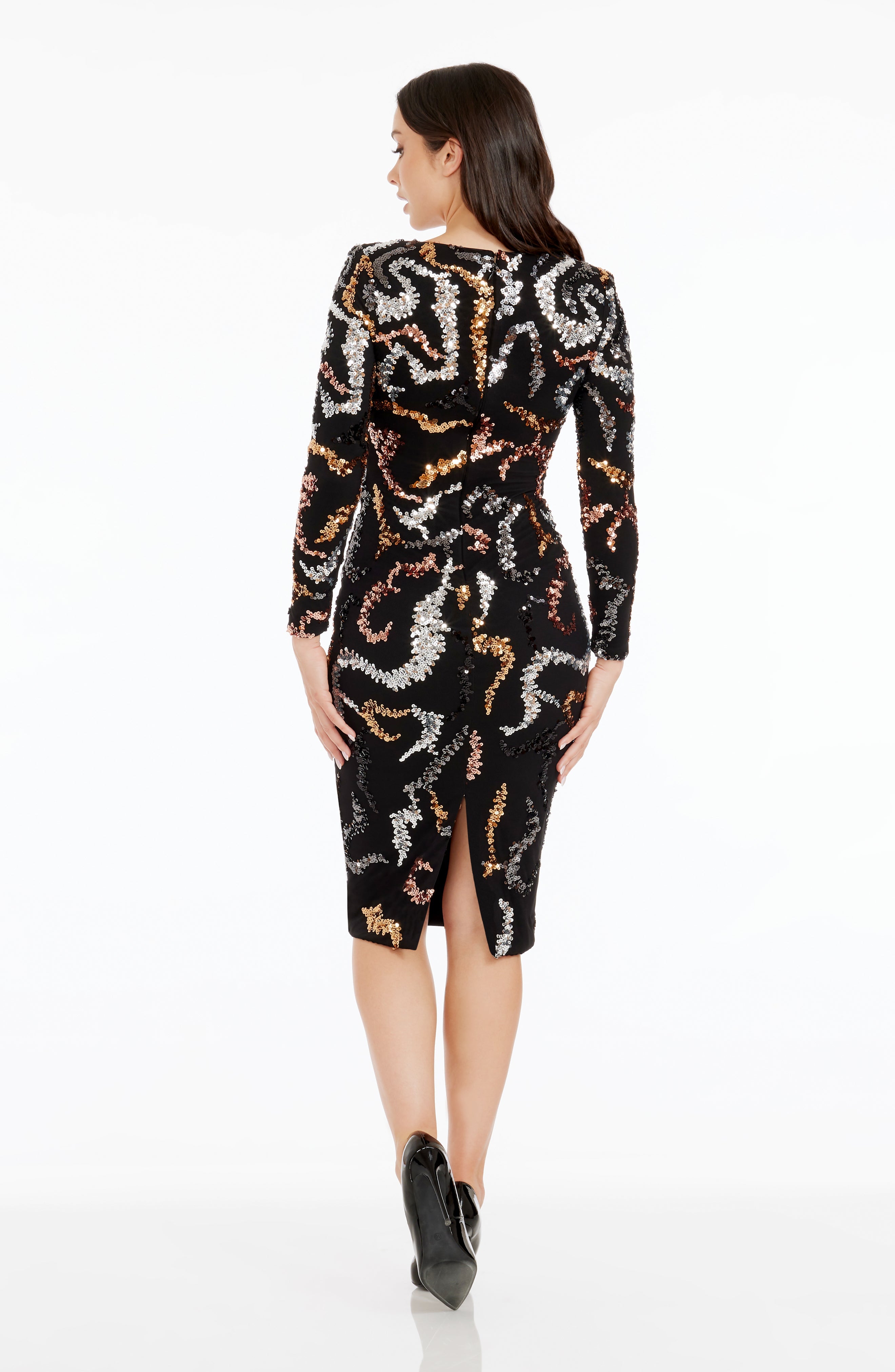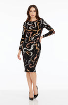This bodycon midi dress features a long-sleeved, round-neck design.