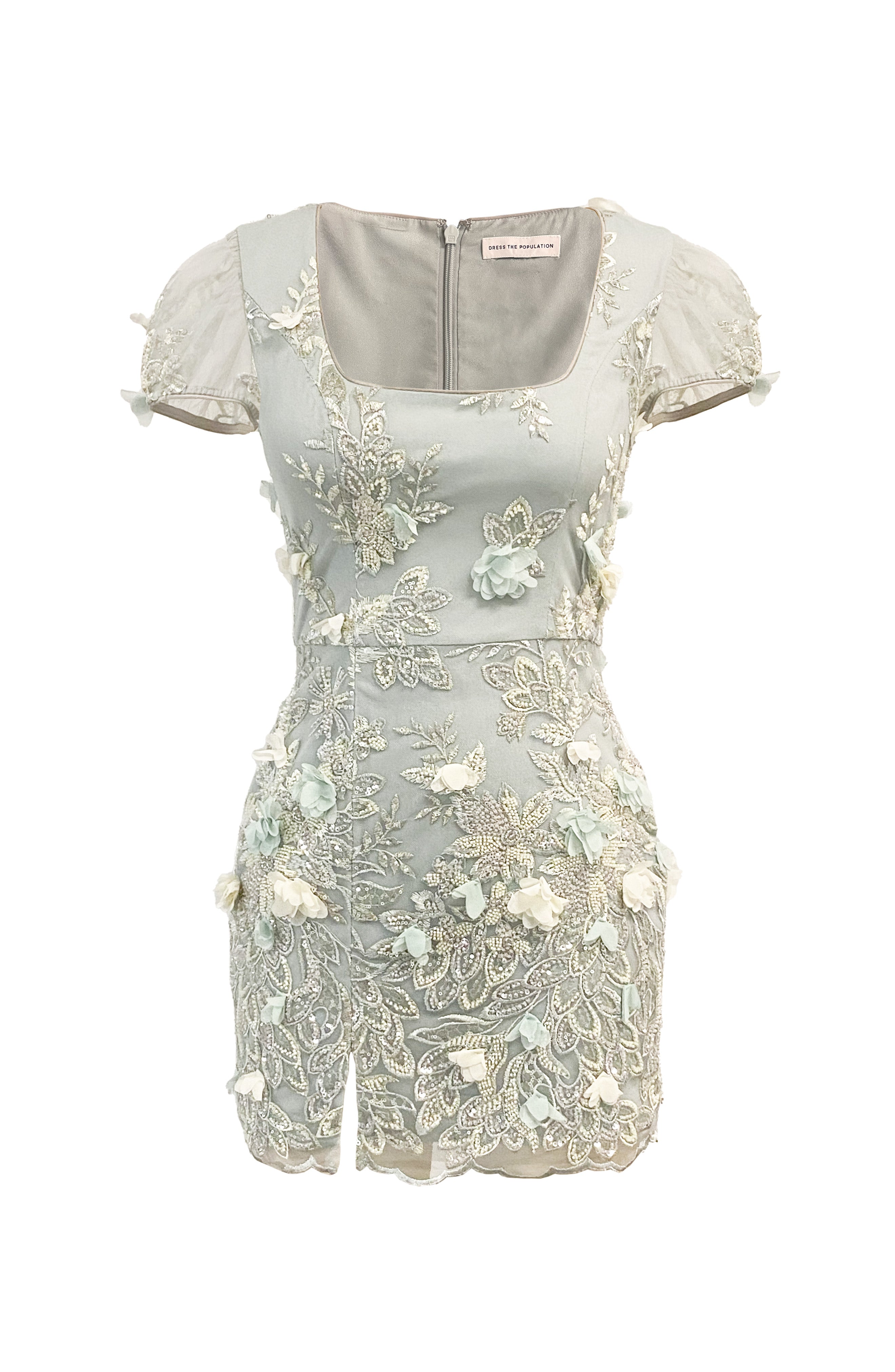 This dress features short puff sleeves, a square neck, and a bodycon fit, with a mini length and a slit for added style.