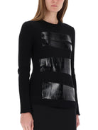 Elevate your wardrobe with this striking MM6 MAISON MARGIELA mesh dress featuring bold metallic tape detailing. Crafted from a luxurious blend of 80% virgin wool and 20% polyamide, this Italian-made piece combines comfort with high-fashion edge. The long-sleeve silhouette is adorned with horizontal sequined stripes that catch the light beautifully, creating a captivating visual effect against the classic black base. Perfect for transitioning from day to night, this versatile dress can be styled with ankle boots for a casual look or elevated with heels for cocktail hour. The mid-thigh length and crew neckline offer a flattering, modern fit that embodies MM6's signature avant-garde aesthetic. Make a statement in this contemporary piece that seamlessly blends texture, shine, and sophisticated design.