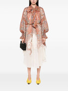 Introducing the stunning Rhiannon Midi Dress by Zimmermann, a masterpiece of bohemian elegance and refined femininity. This enchanting dress features an ornate paisley print in warm coral and cream tones, crafted from luxurious 100% ramie fabric that drapes beautifully and moves with effortless grace.