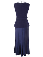 The flattering belted waist with peplum detail cinches your silhouette, while the flowing midi-length skirt in luxurious navy satin adds movement and grace. Perfect for the office, cocktail events, or wedding guest occasions, this versatile dress transitions seamlessly from day to evening.