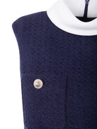 Elevate your wardrobe with this stunning Navy Boucle Sleeveless Midi Dress from Self-Portrait. This sophisticated piece features a textured boucle bodice with elegant white collar detailing and decorative button accents, creating a timeless and polished look.