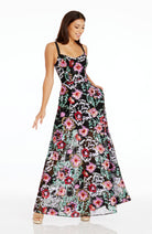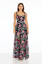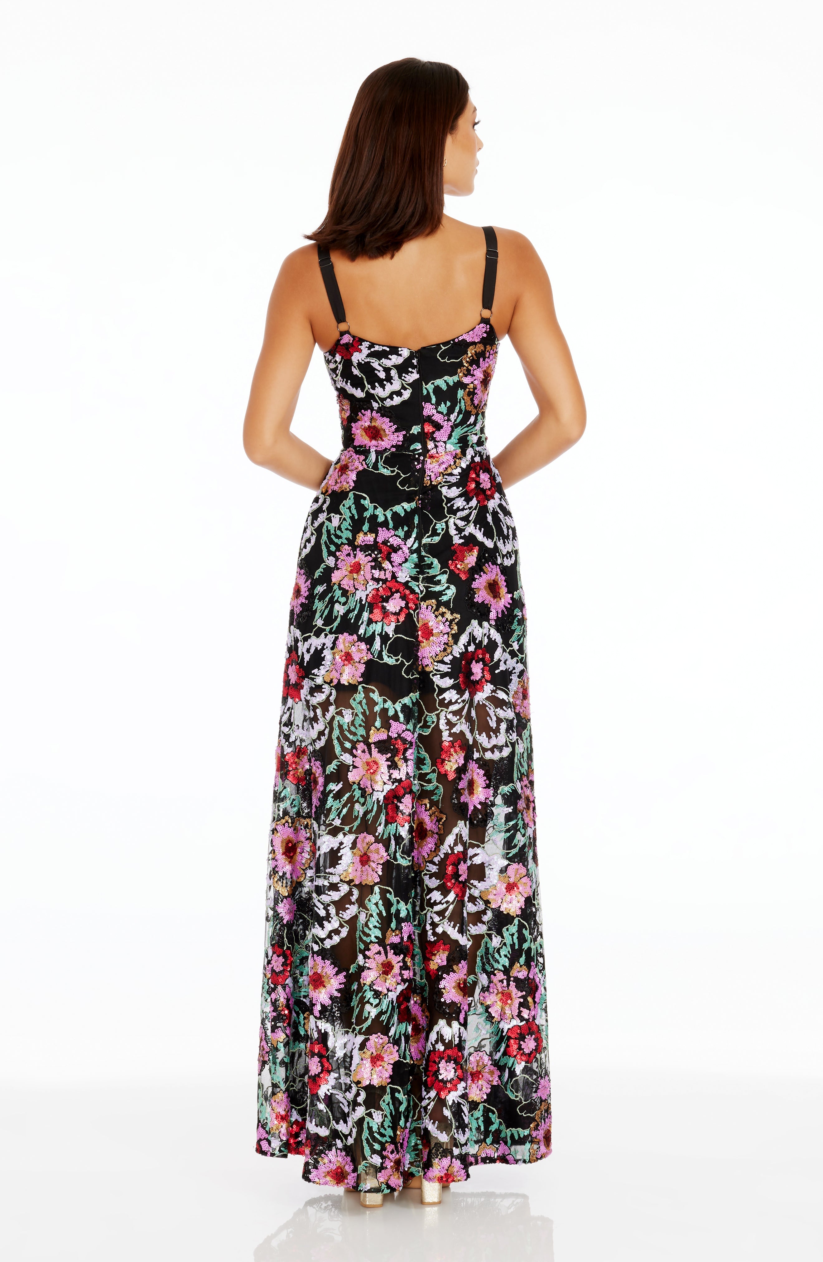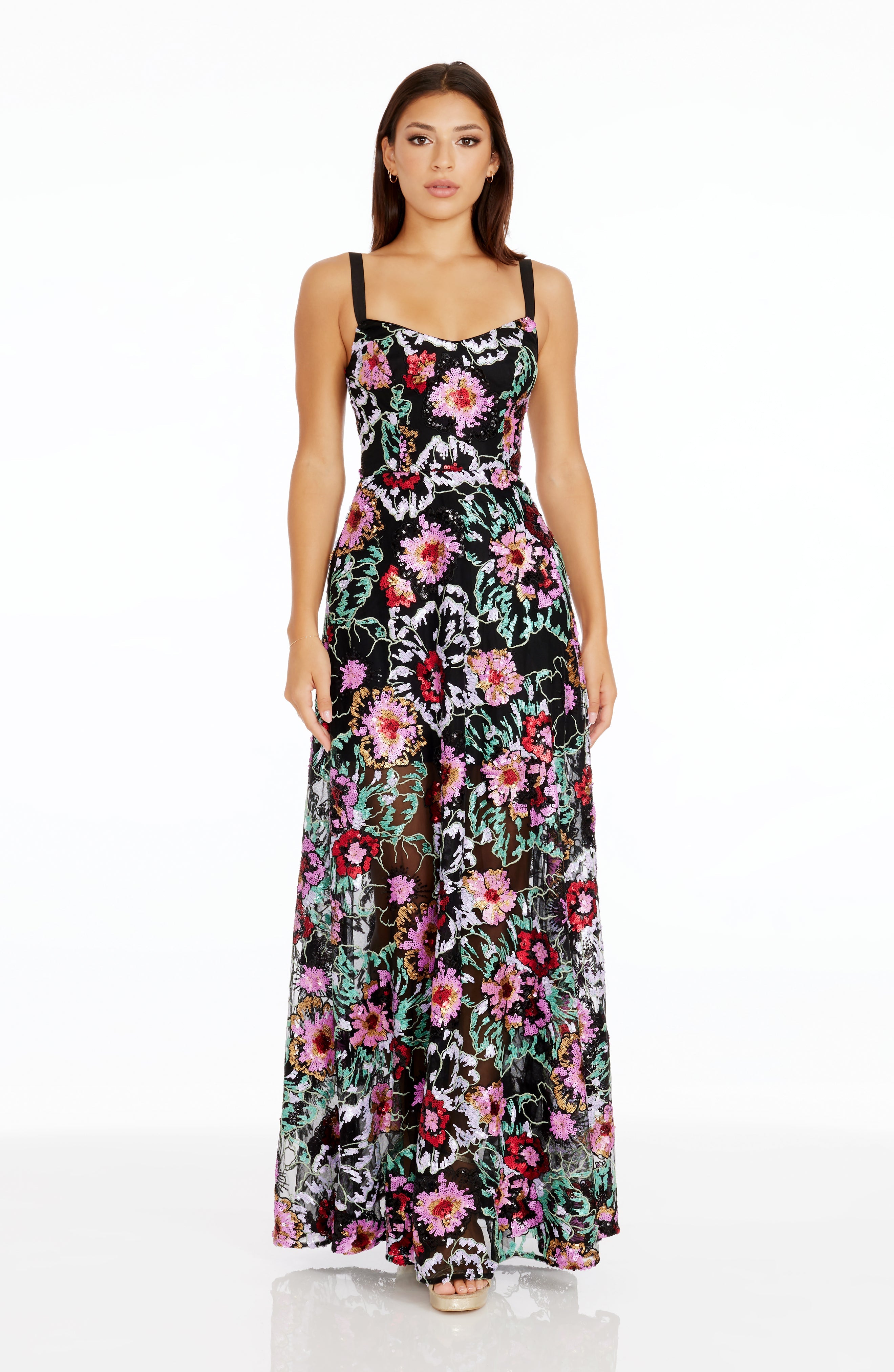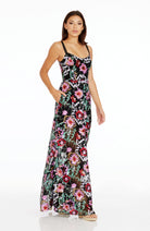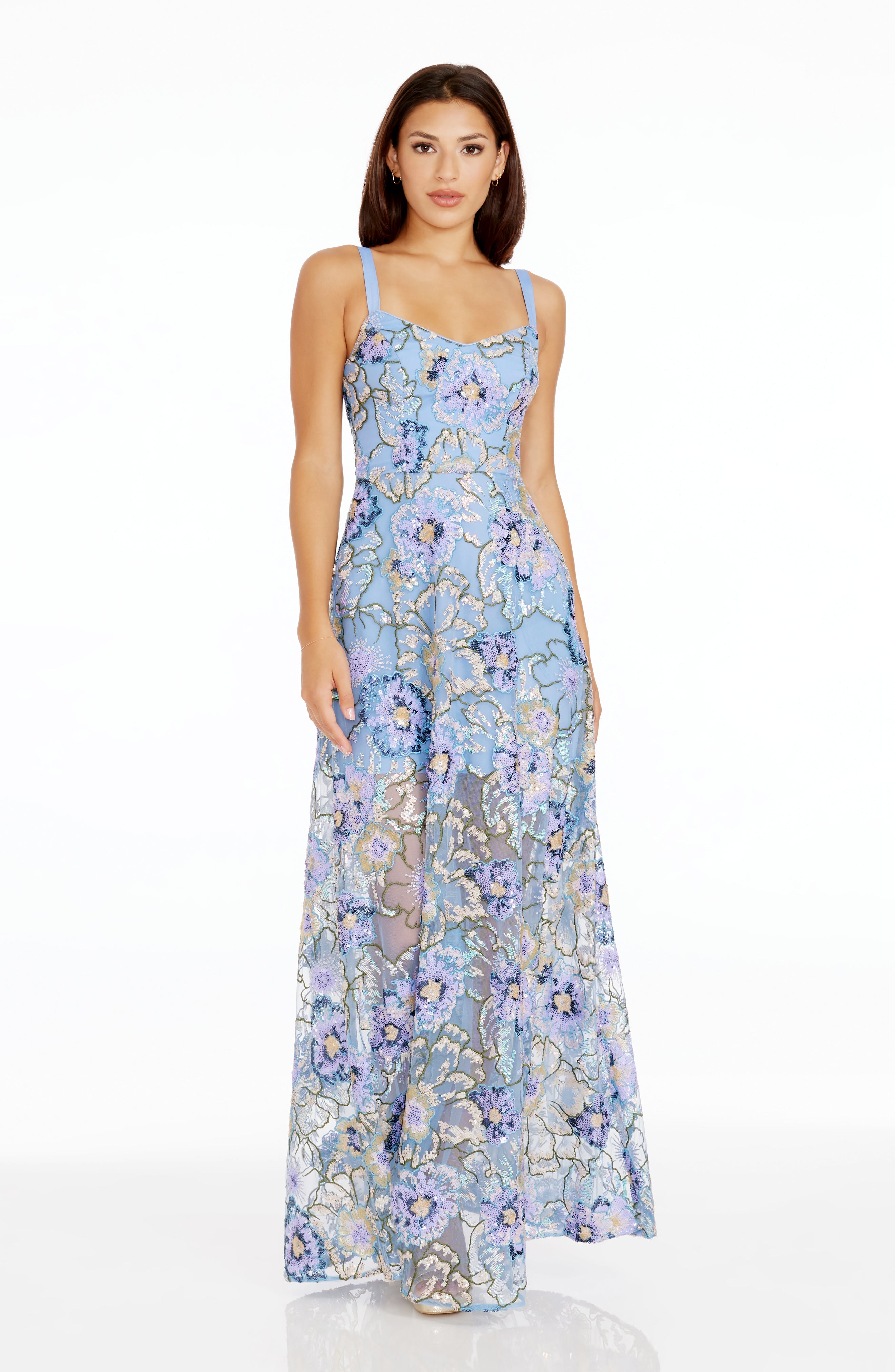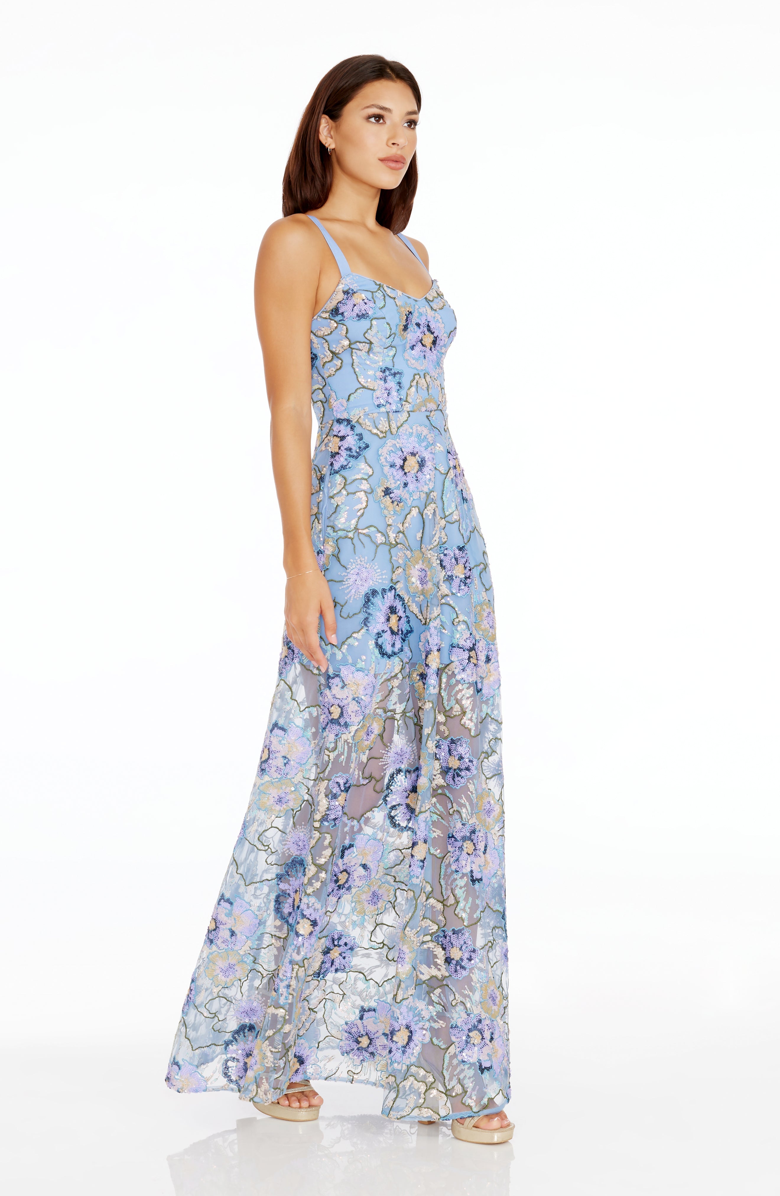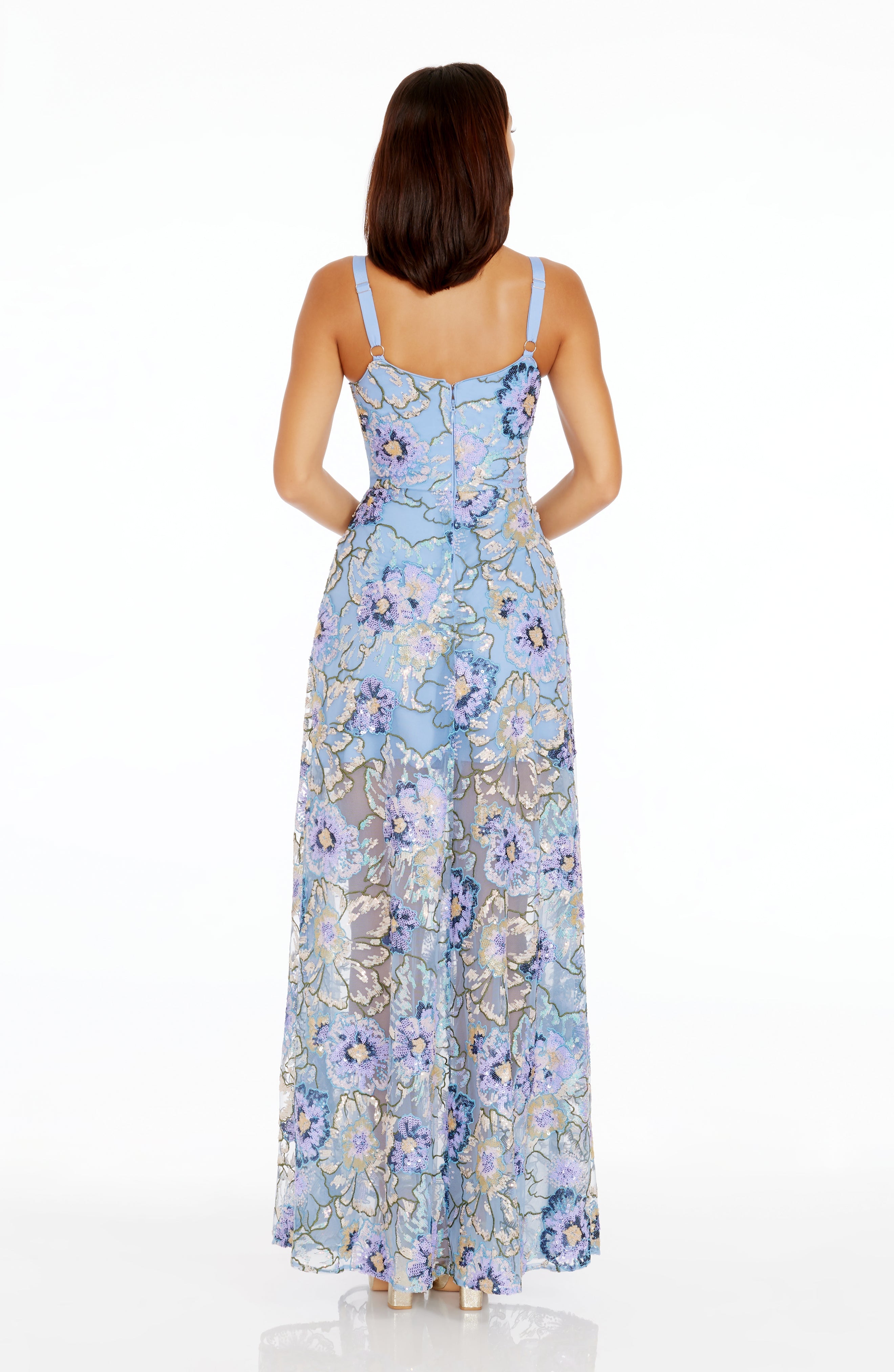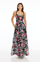 This stunning gown features a sleeveless neckline and a flattering flare silhouette, complete with sheer pockets for a touch of elegance.