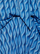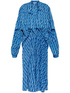 Make a bold statement in this striking printed midi dress from Balenciaga. Featuring an eye-catching geometric wave pattern in vibrant blue tones, this dress showcases the house's contemporary aesthetic with distinctive balloon sleeves and a flattering midi length.